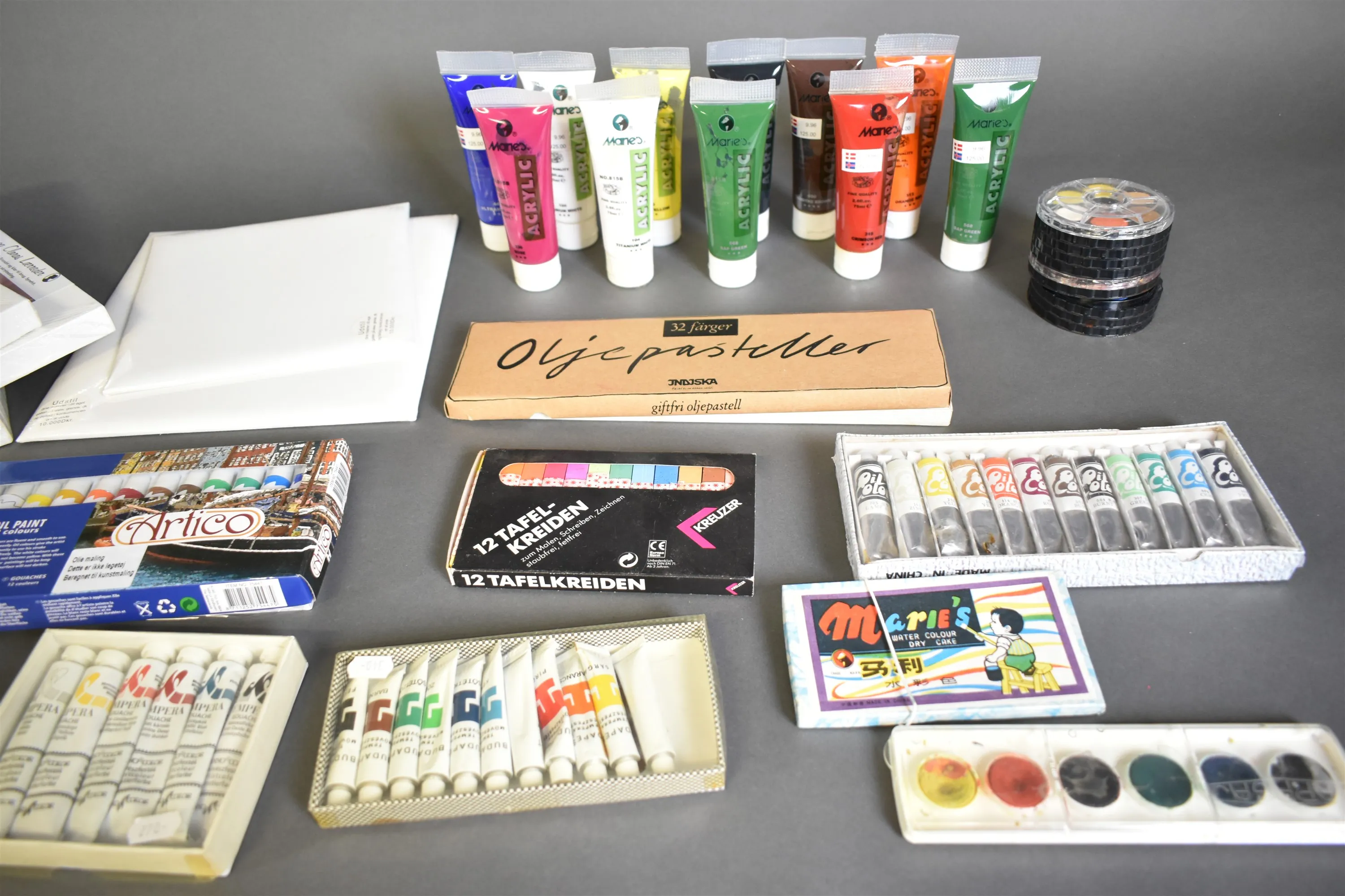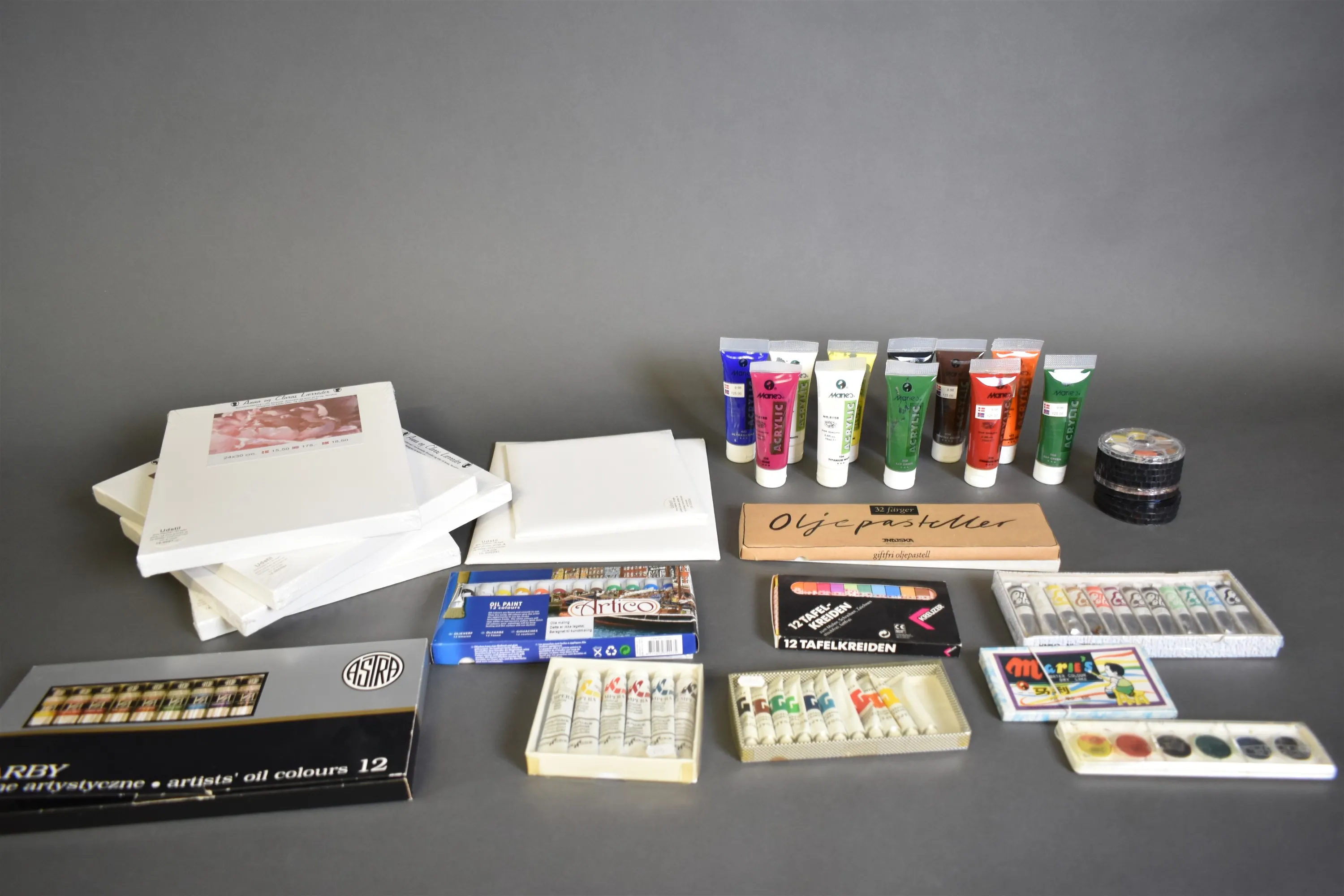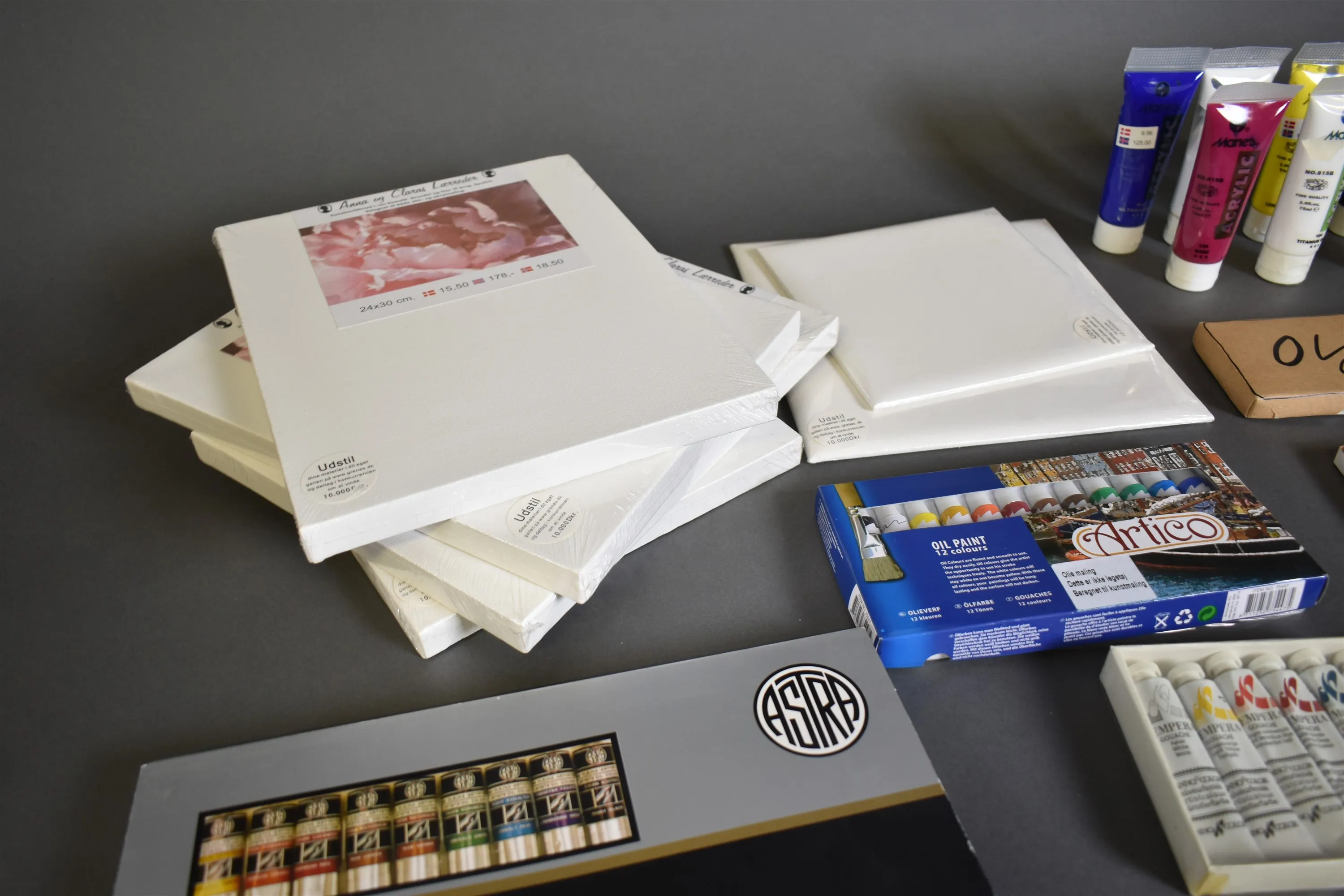 10727. Parti konstnärsmaterial bla dukar och oljefärger