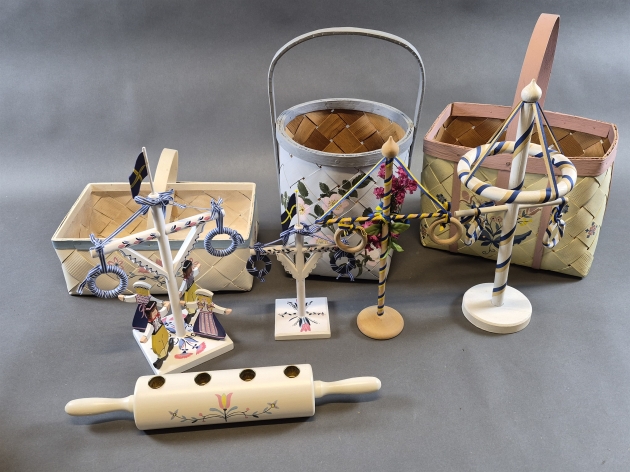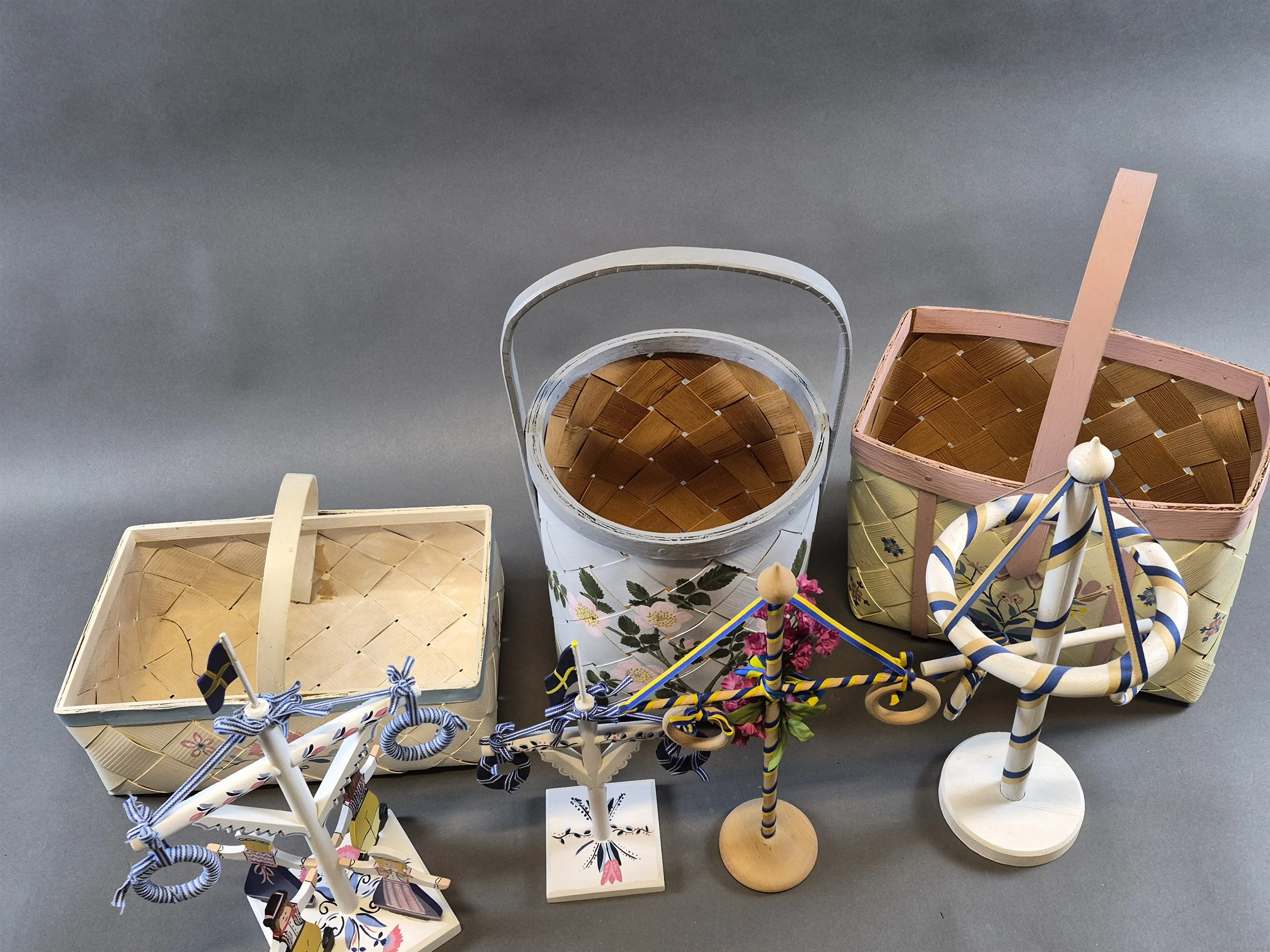 20420. Parti korgar & midsommardekorationer, bl,a Blekingedekor högsta 46 cm