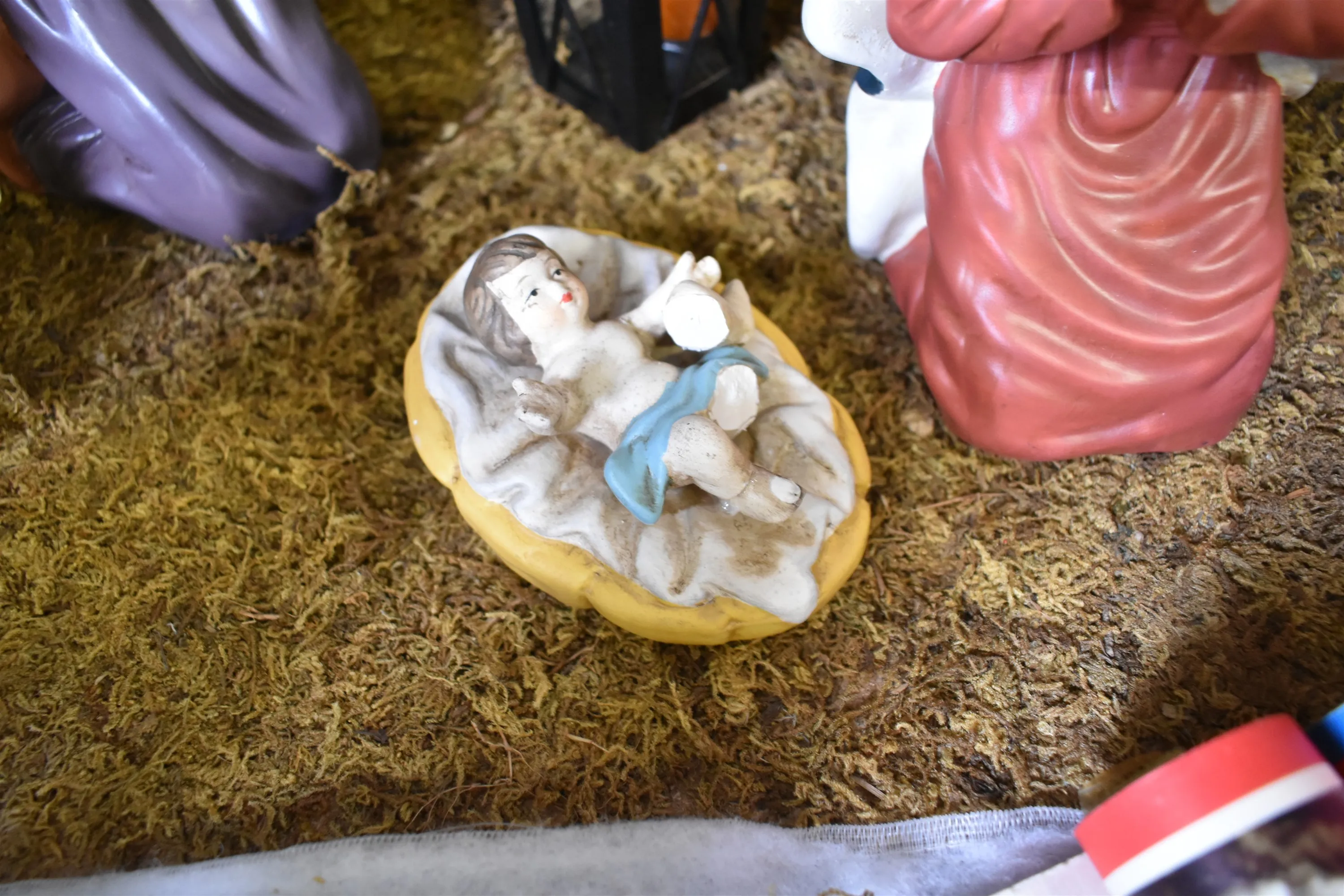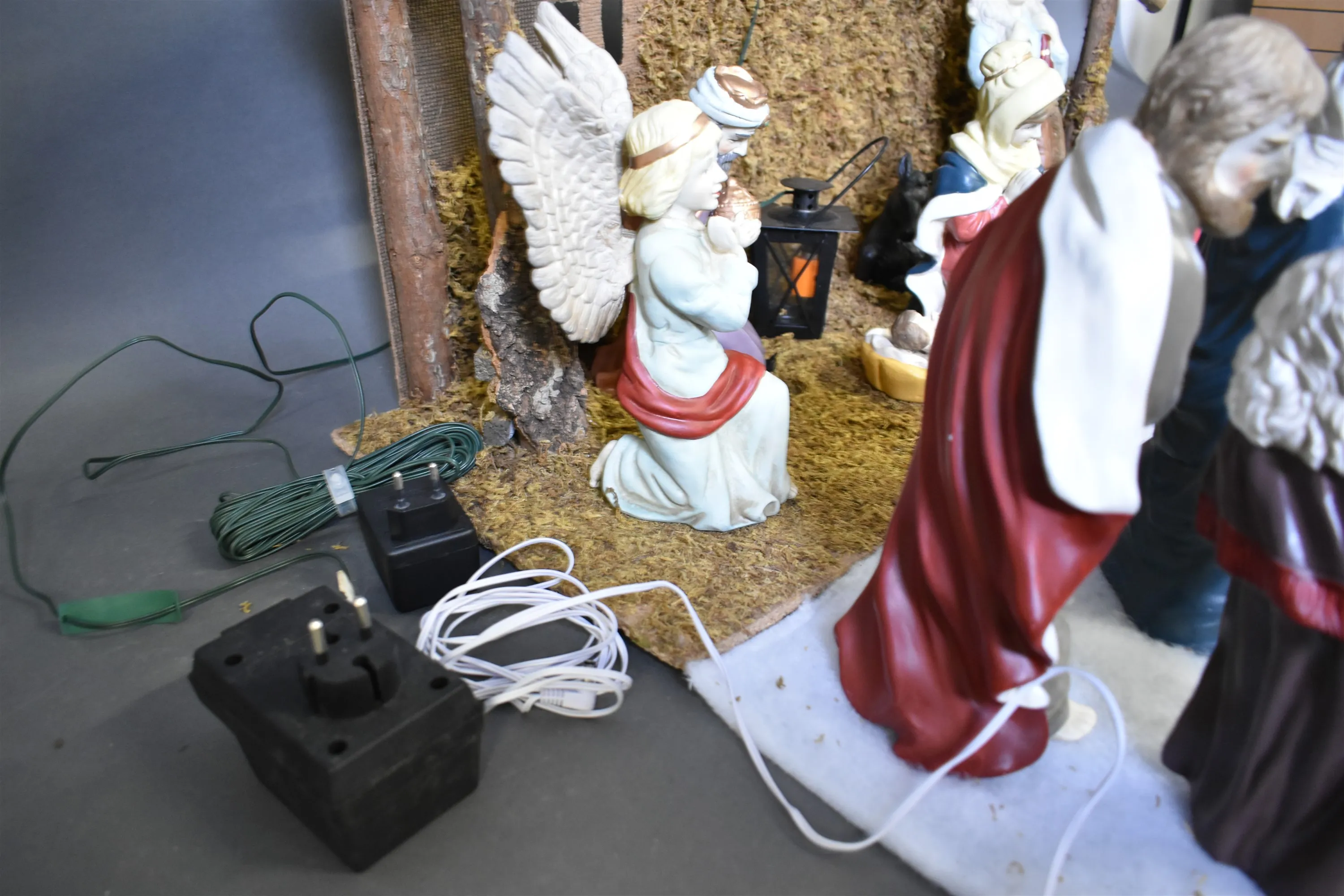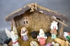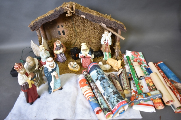 16099. Parti krubba med figurer & äldre bonader höjd krubba 55 cm belysning finns