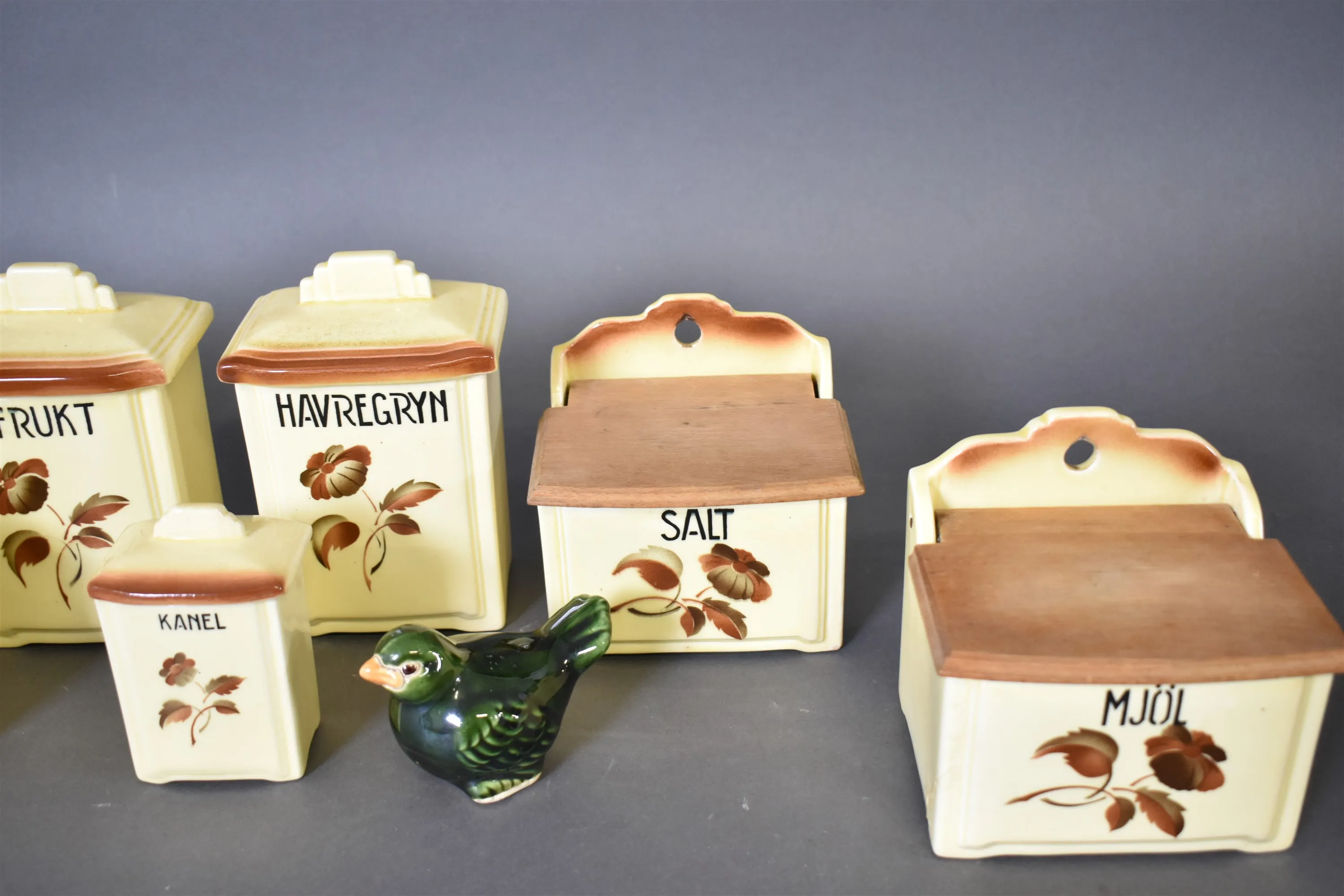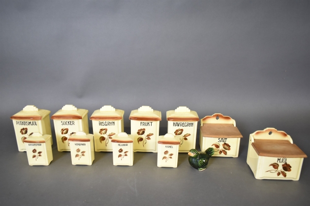 13457. Parti kryddburkar, sprickor och något nagg finns, högsta höjd 19 cm