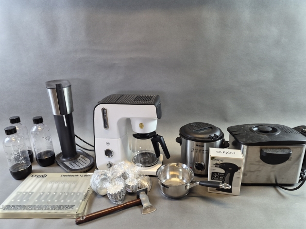 20027. Parti köksel och kökstillbehör bla OBH Nordica kaffekokare och Sodastream, högsta höjd 42 cm