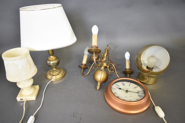 15540. Parti lampor & väggklocka, högsta 48 cm, nagg på alabasterlampam