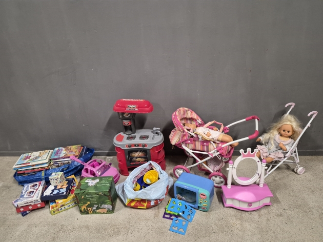 19538. Parti leksaker, barnböcker och sällskapsspel bla Skrållan dockor, leksakskök och sminkspegel