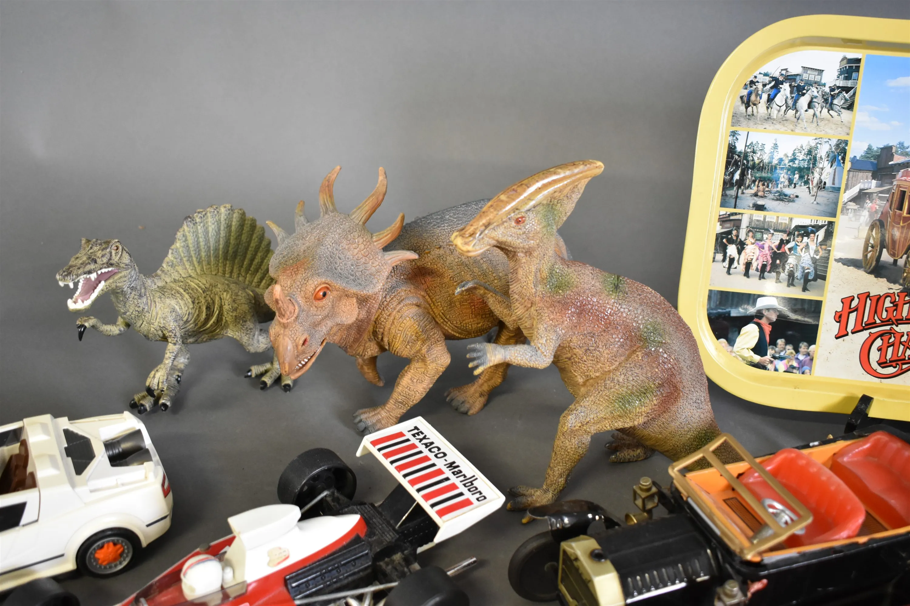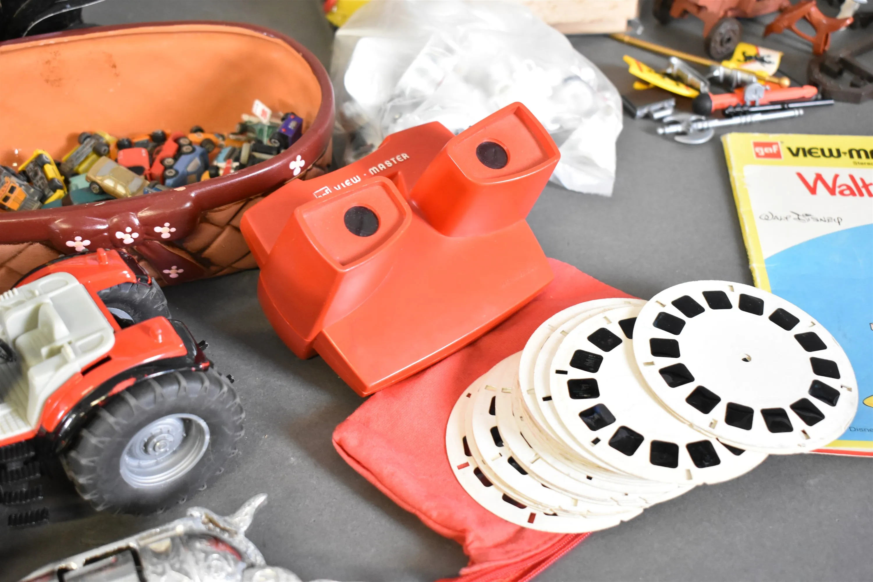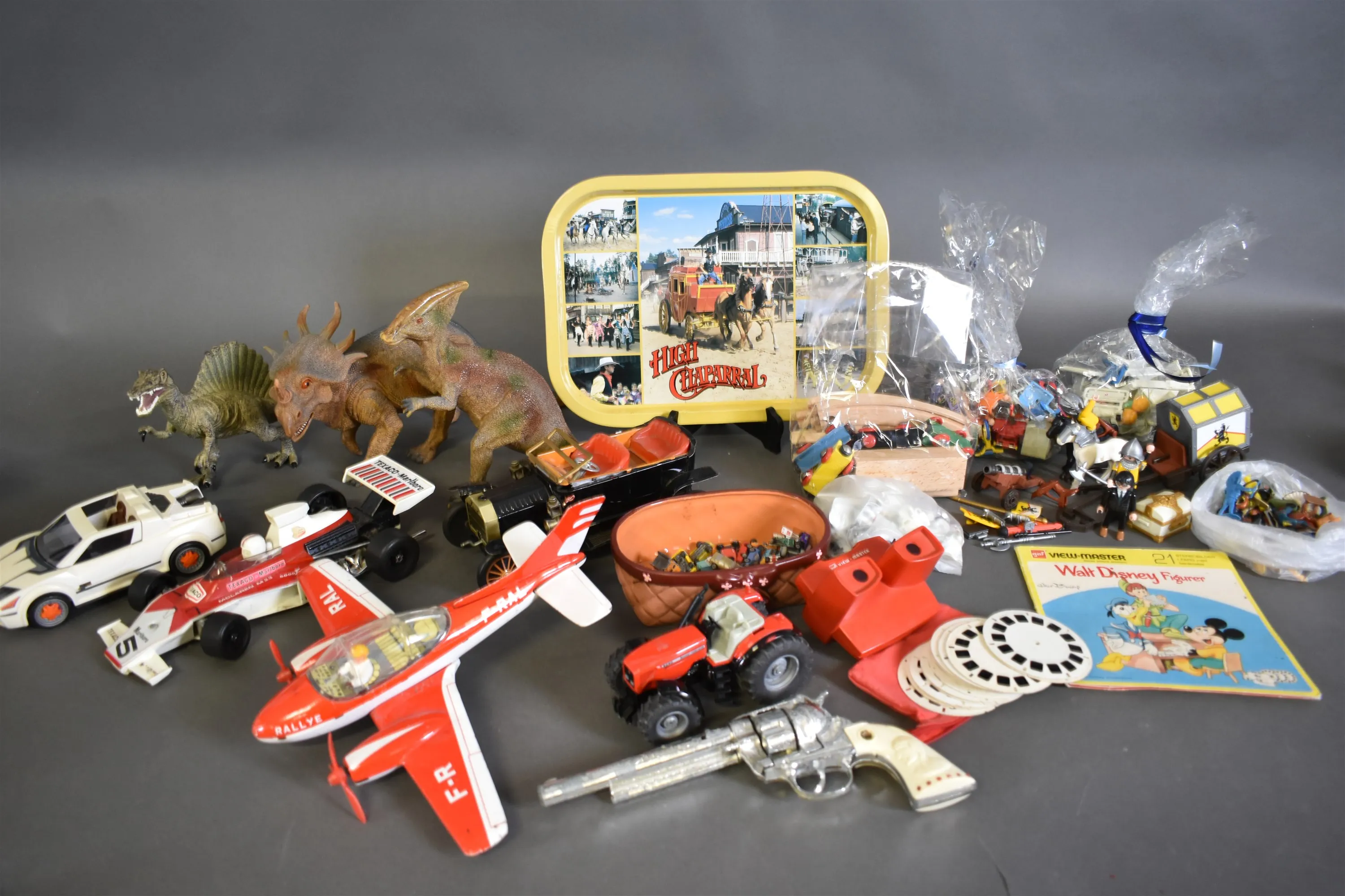 15360. Parti leksaker bla dinosaurier, Playmobil och View Master med skivor