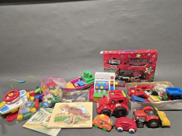 18626. Parti leksaker bla Fisher Price, pussel och Duplo, högsta höjd 36 cm