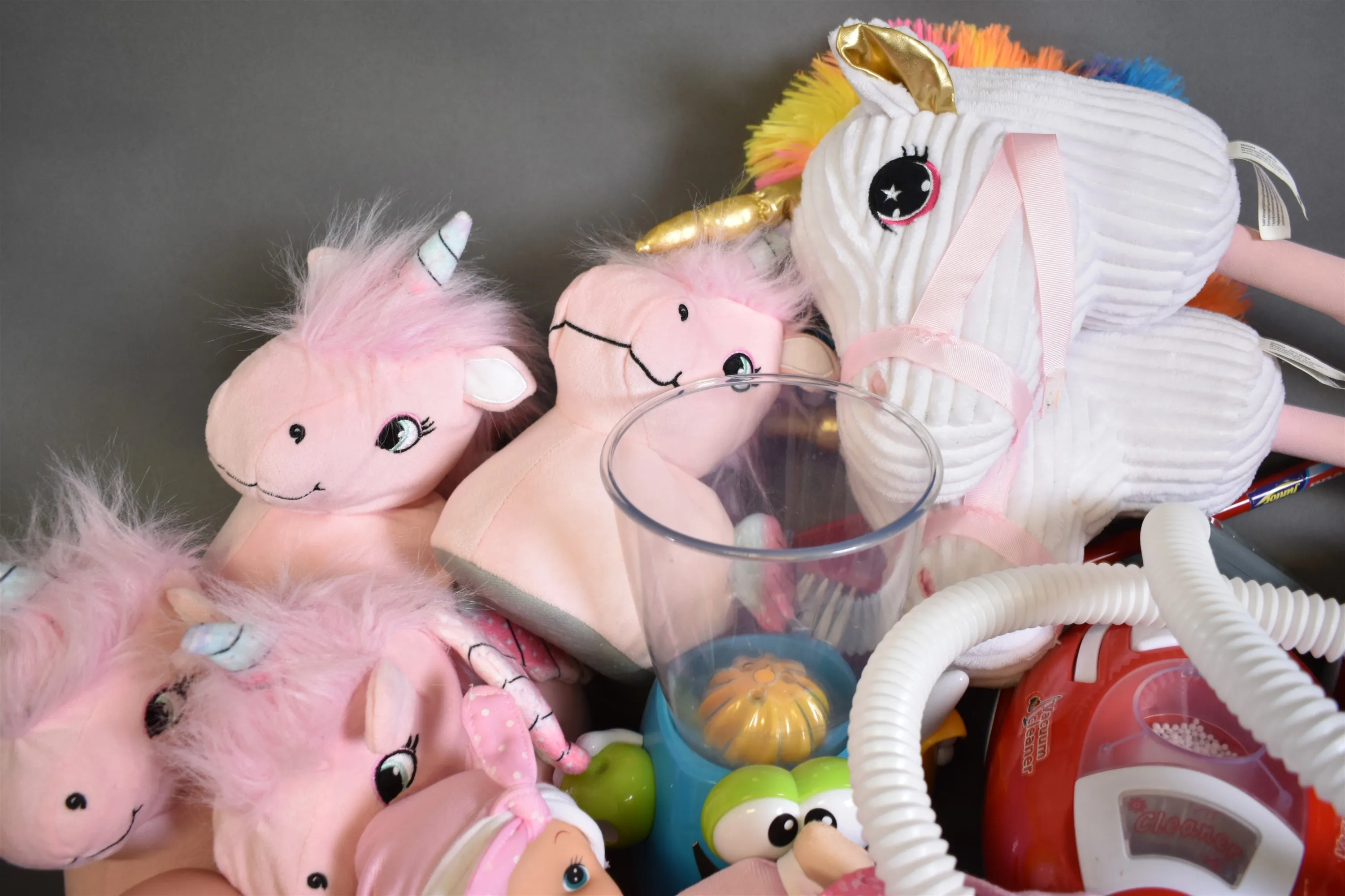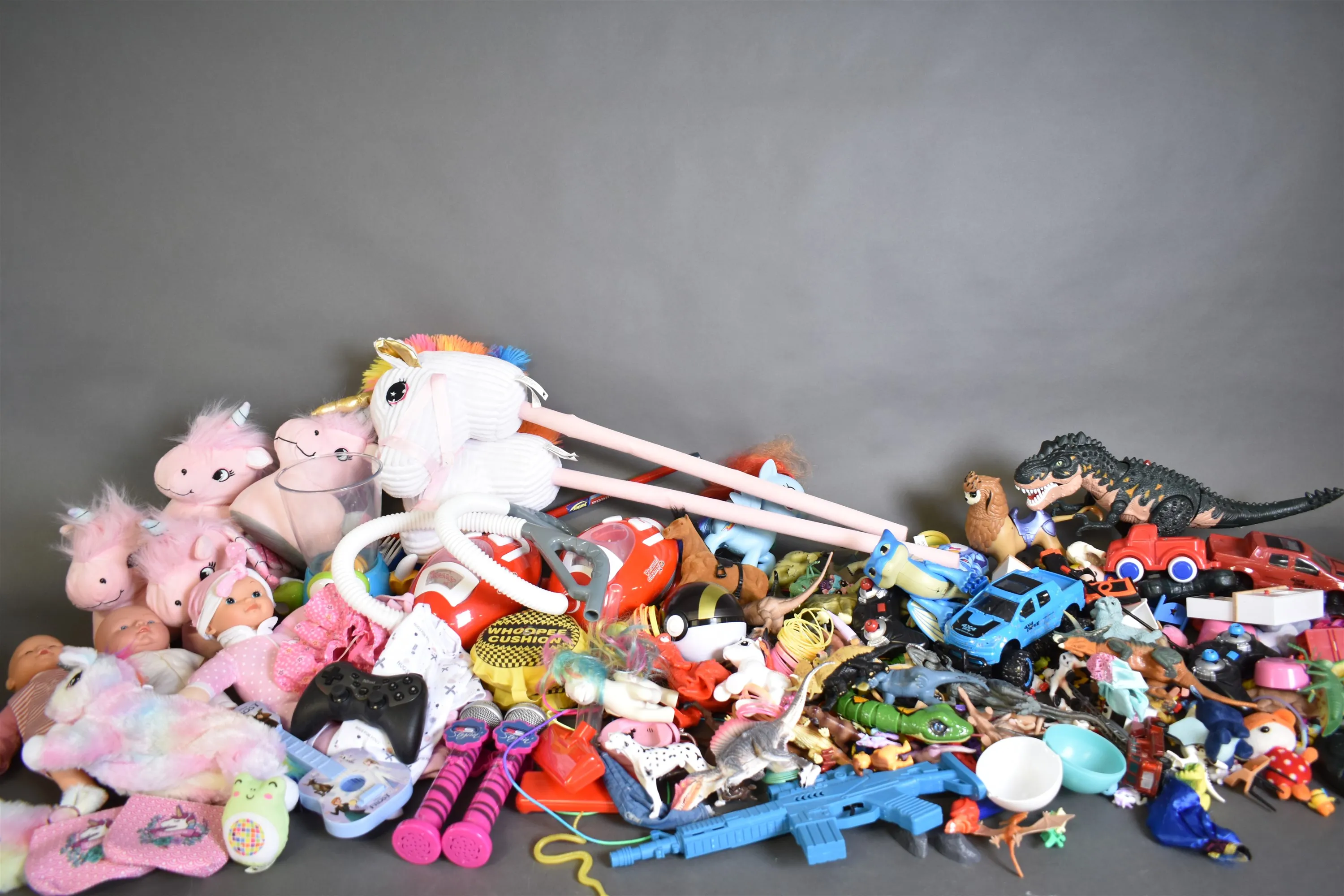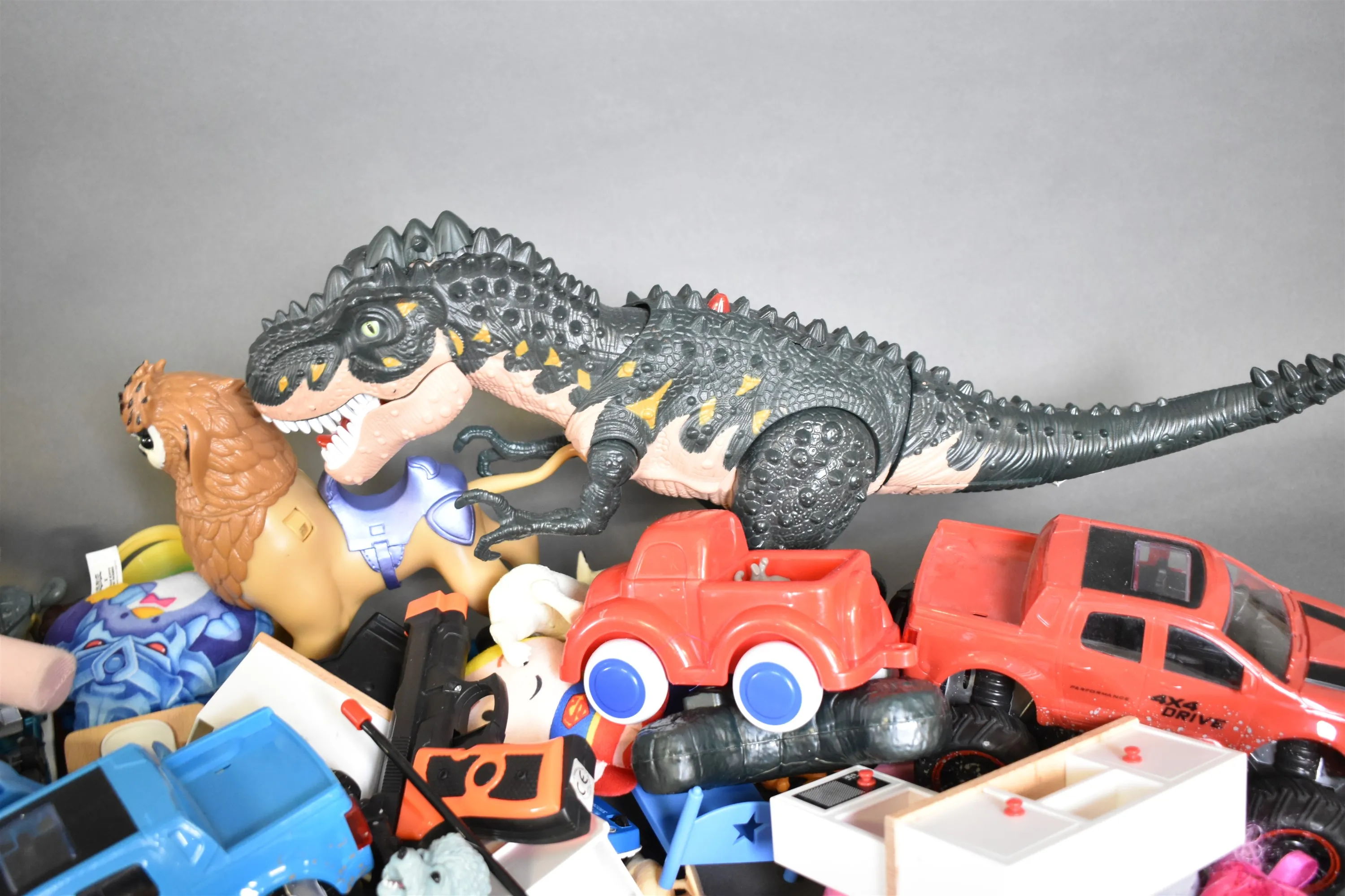 10558. Parti leksaker bla rollek, dinosaurier och dockor, längsta mått 85 cm
