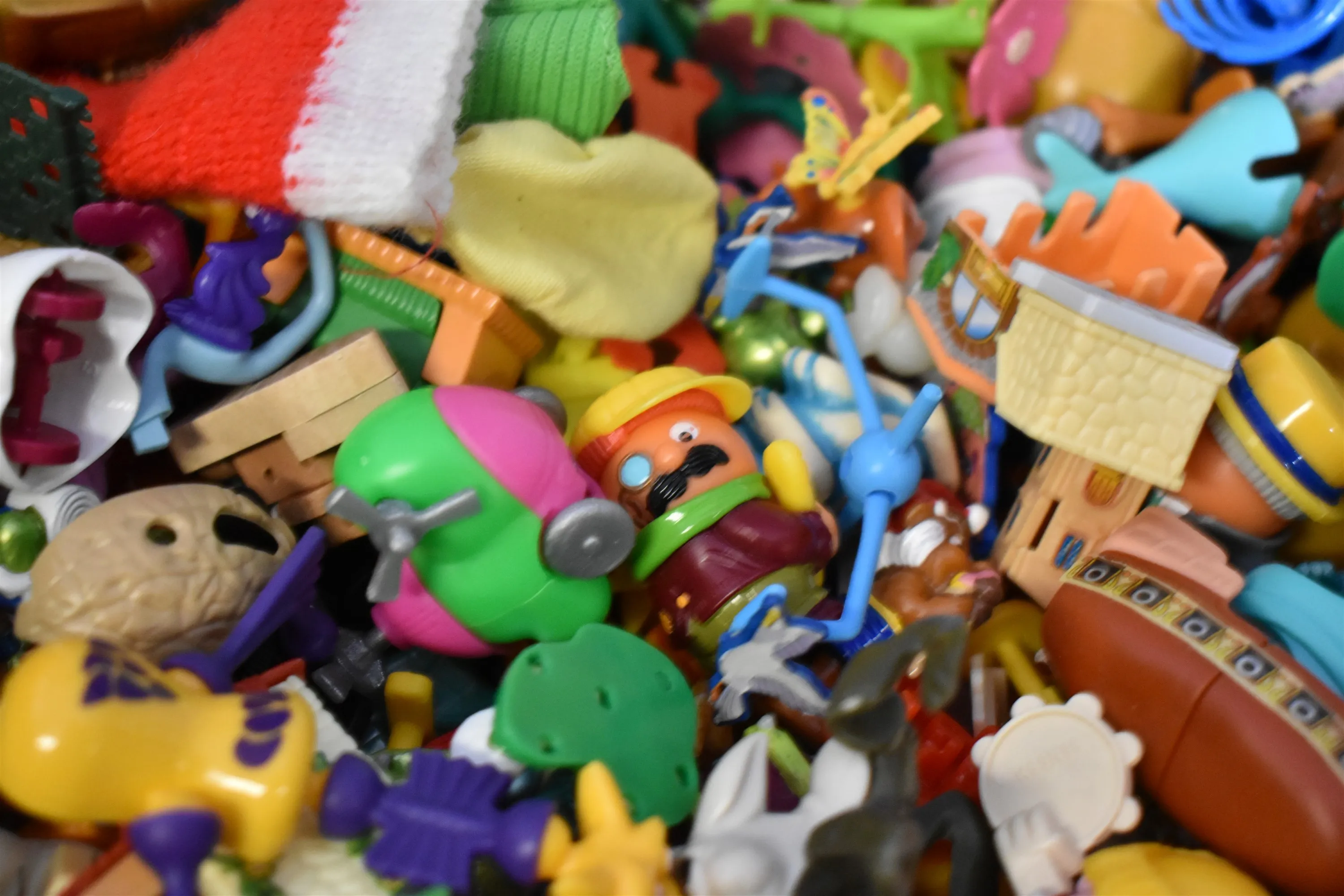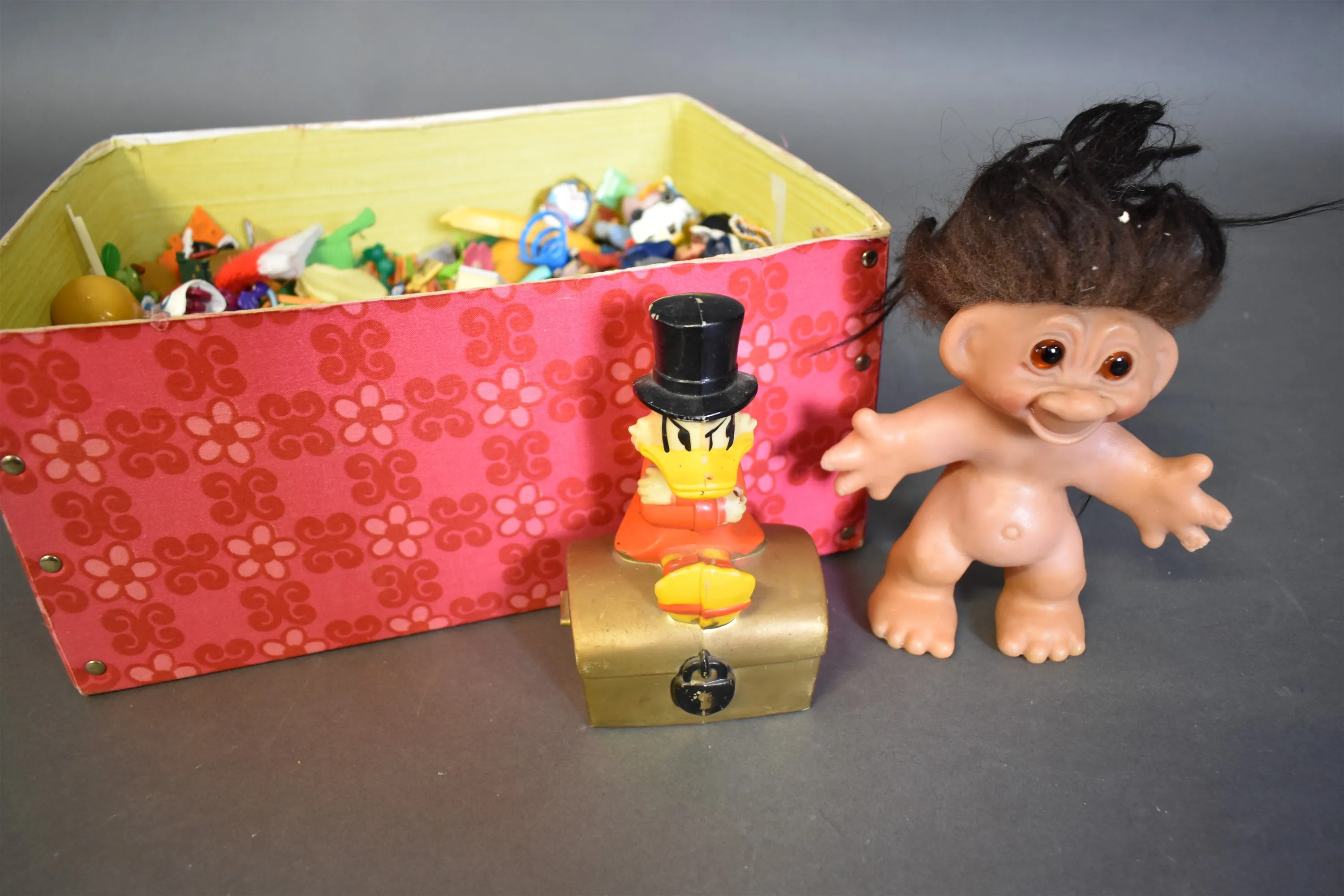7228. Parti leksaker bla småleksaker kinderägg och DAM troll, högsta höjd 18 cm