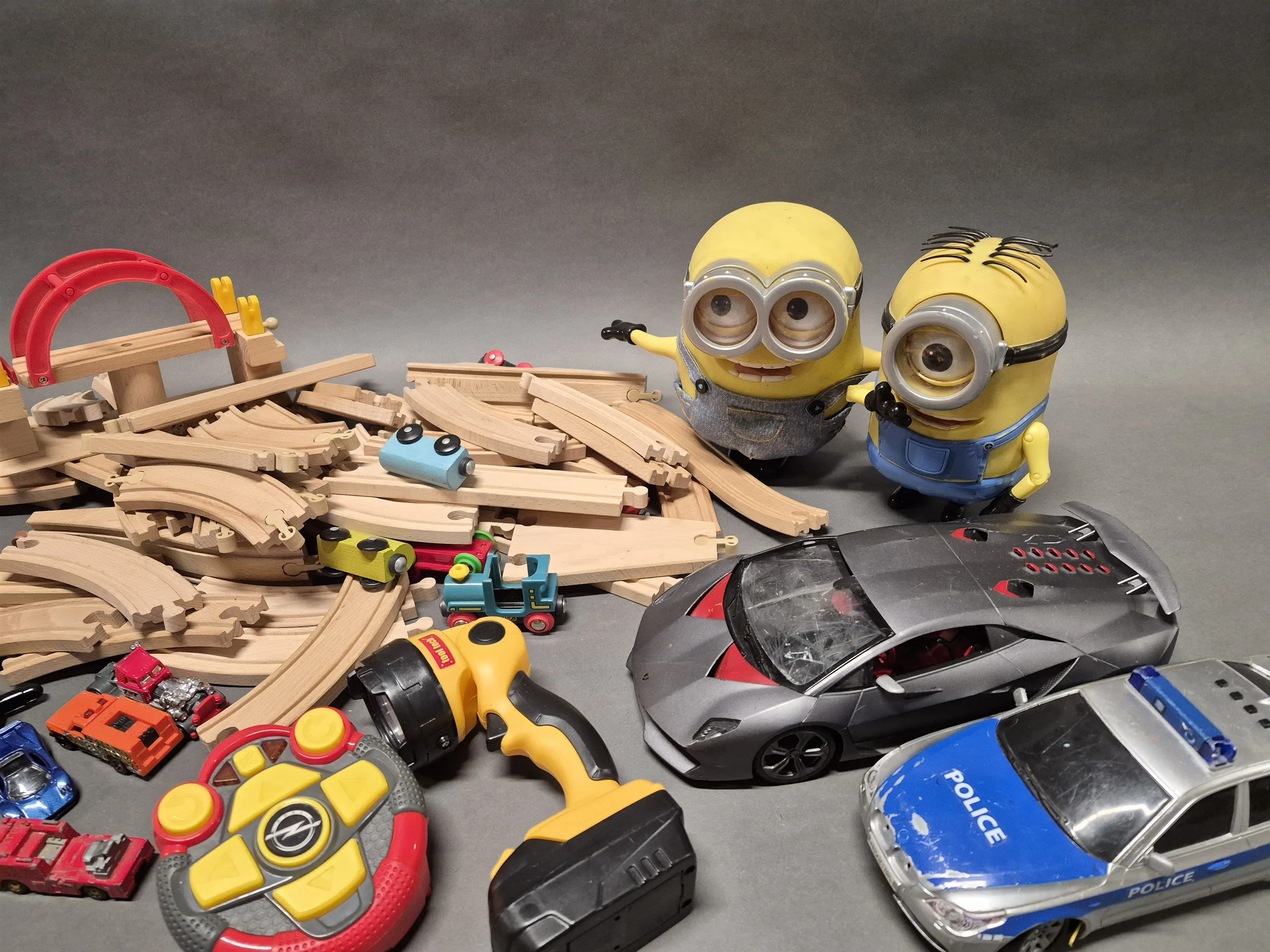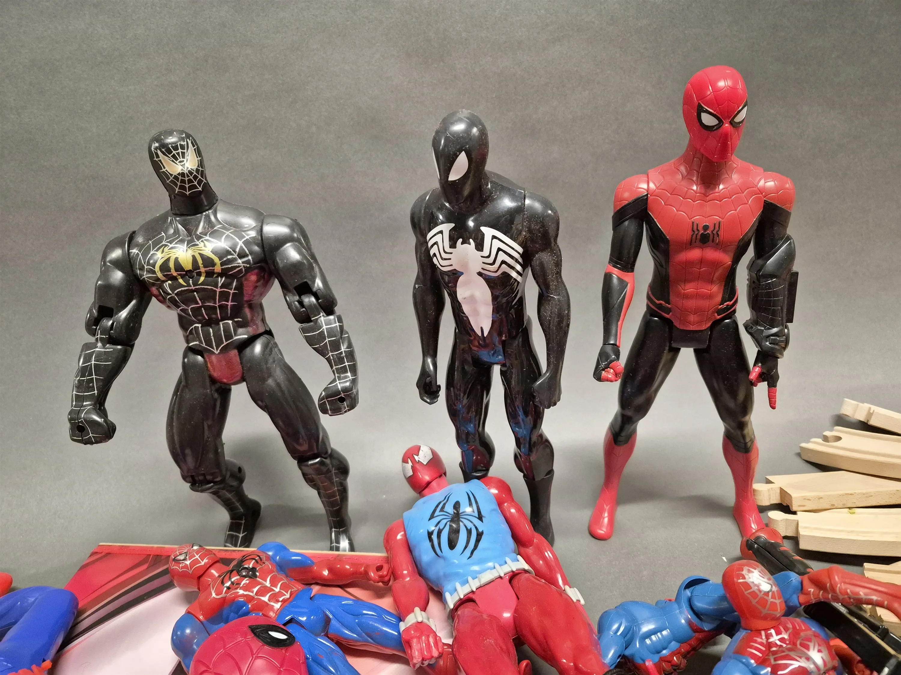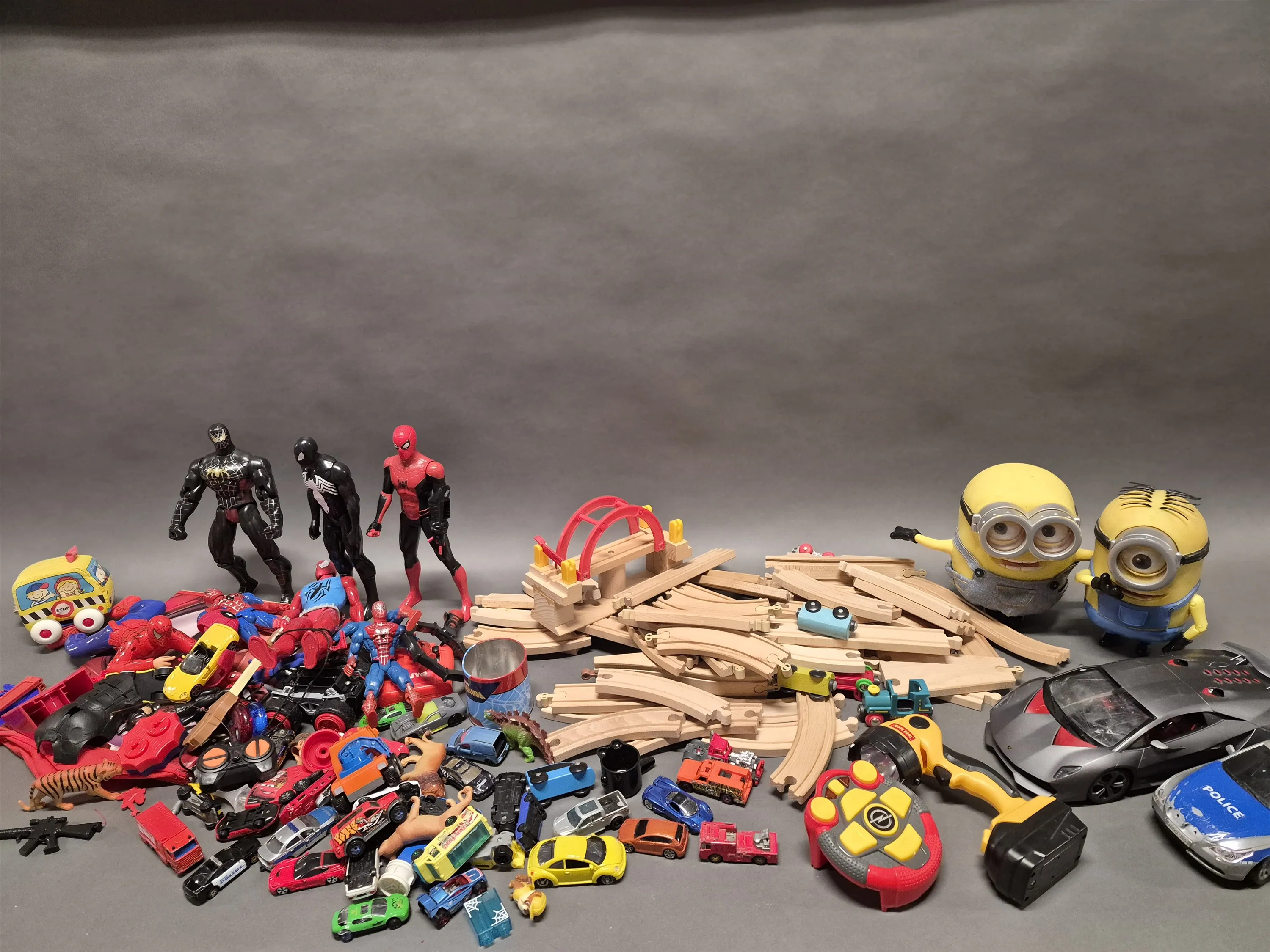 17480. Parti leksaker bla trätågbana, Spiderman actionfigurer och bilar, högsta höjd 30 cm