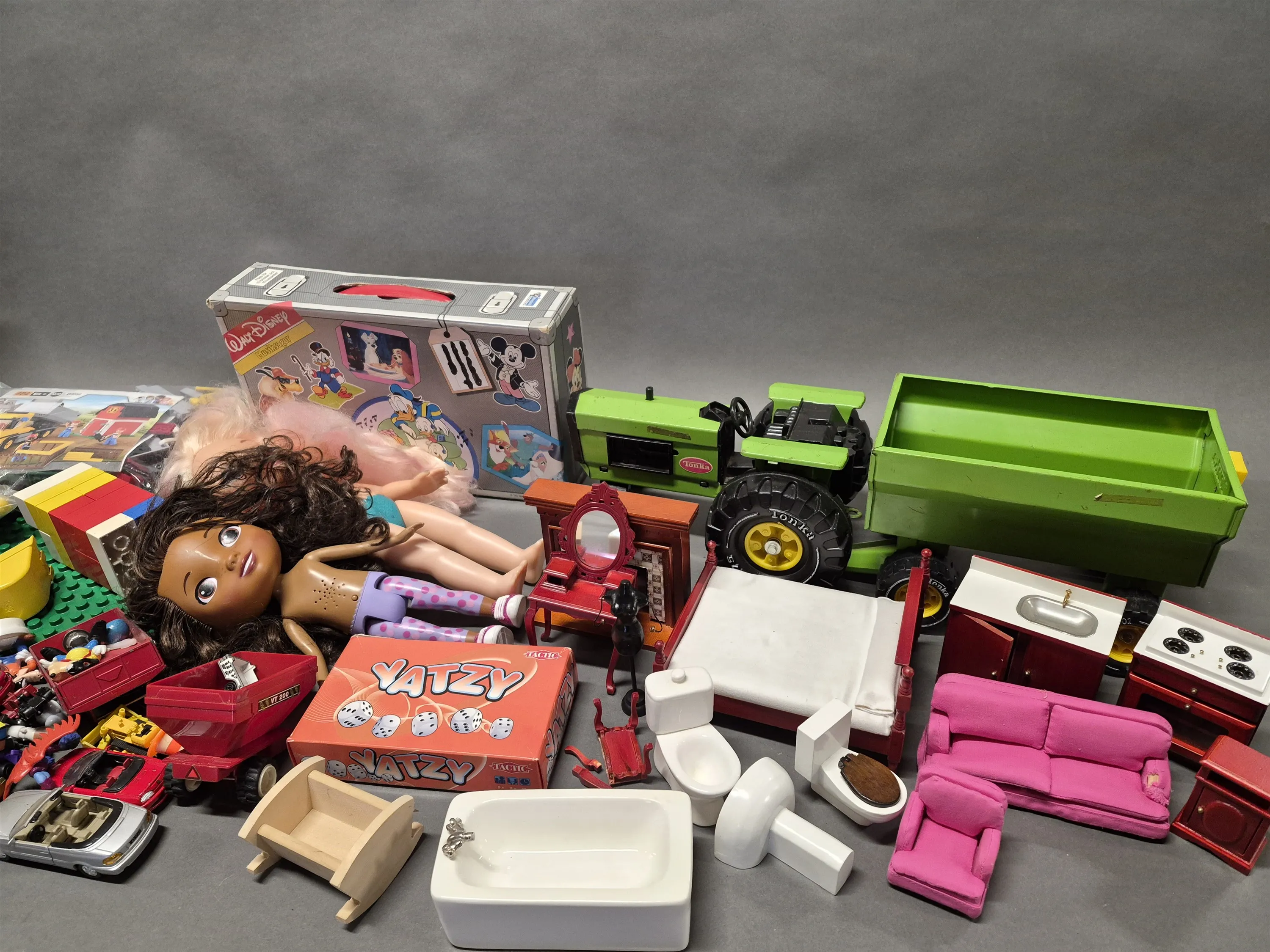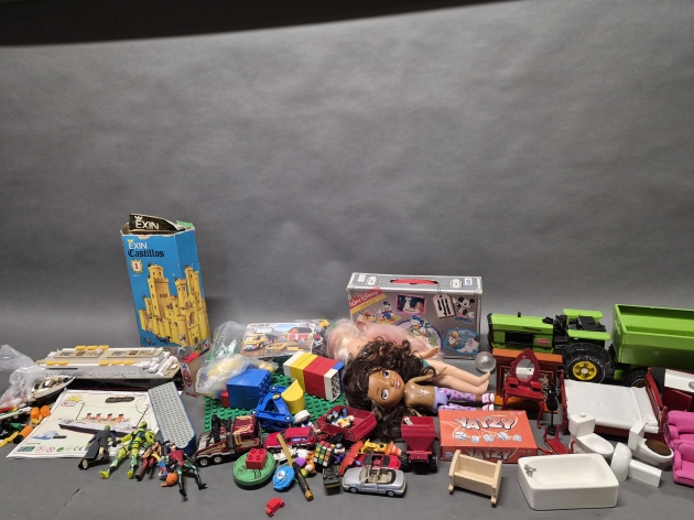 17642. Parti leksaker bla traktor med släp Tonka, dockmöbler och Titanic, ej genomgånget, högsta höjd 36 cm