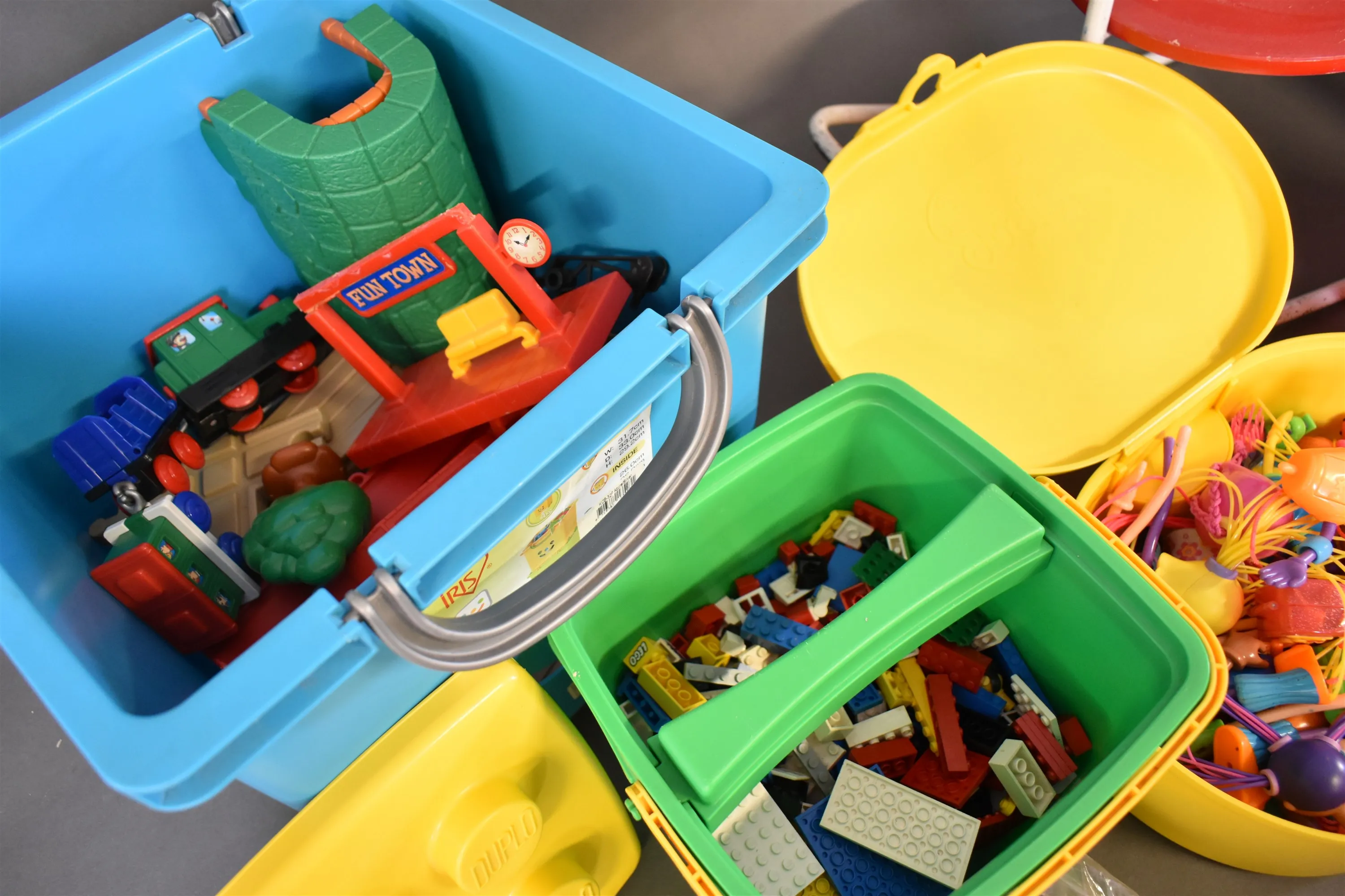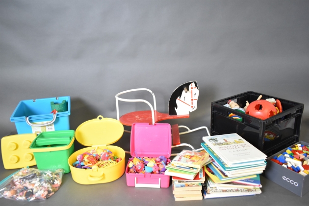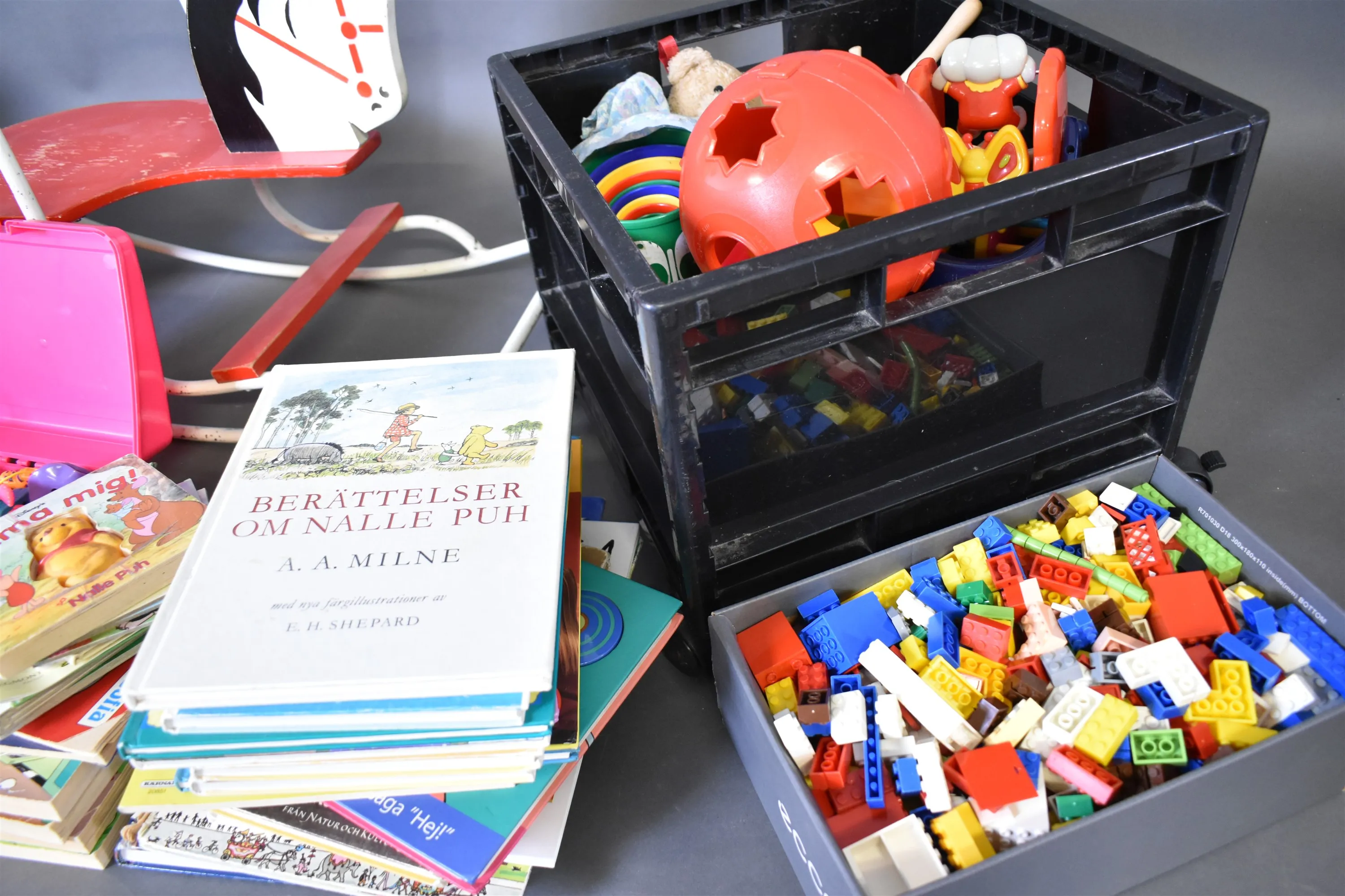 13374. Parti leksaker och barnböcker bla gunghäst, tågbana, Lego och Betty Spaghetty