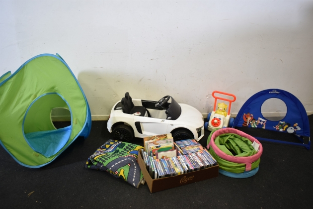 13950. Parti leksaker och barnsaker bla batteridriven bil, lekmatta och DVD filmer, längd på bil 95 cm