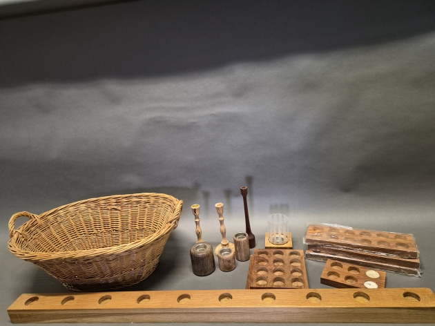 19359. Parti ljushållare & ljusstakar i trä och mangelkorg, längsta mått 126 cm