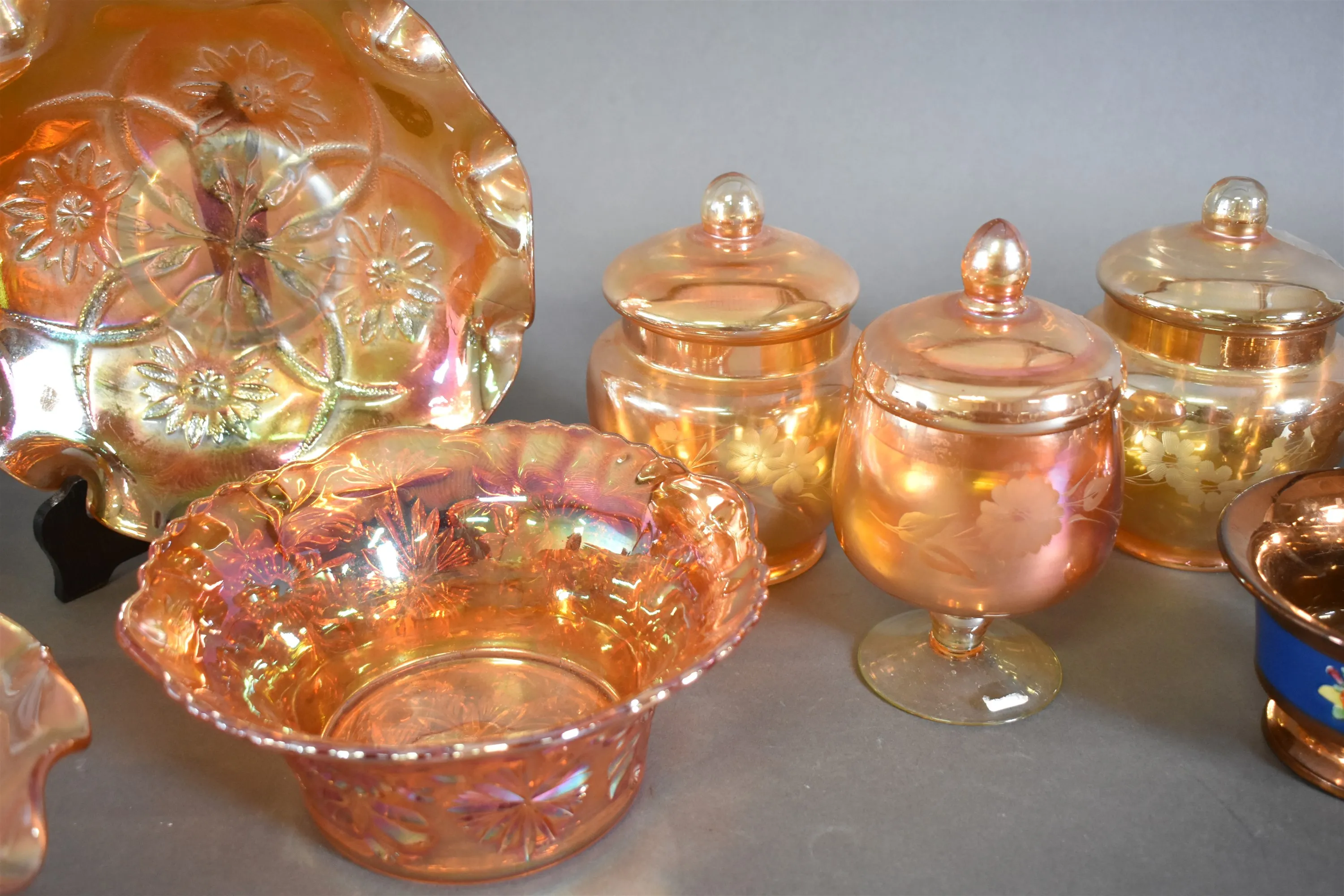 15274. Parti lysterglas bla burkar med lock oh skålfat, största diameter 26 cm