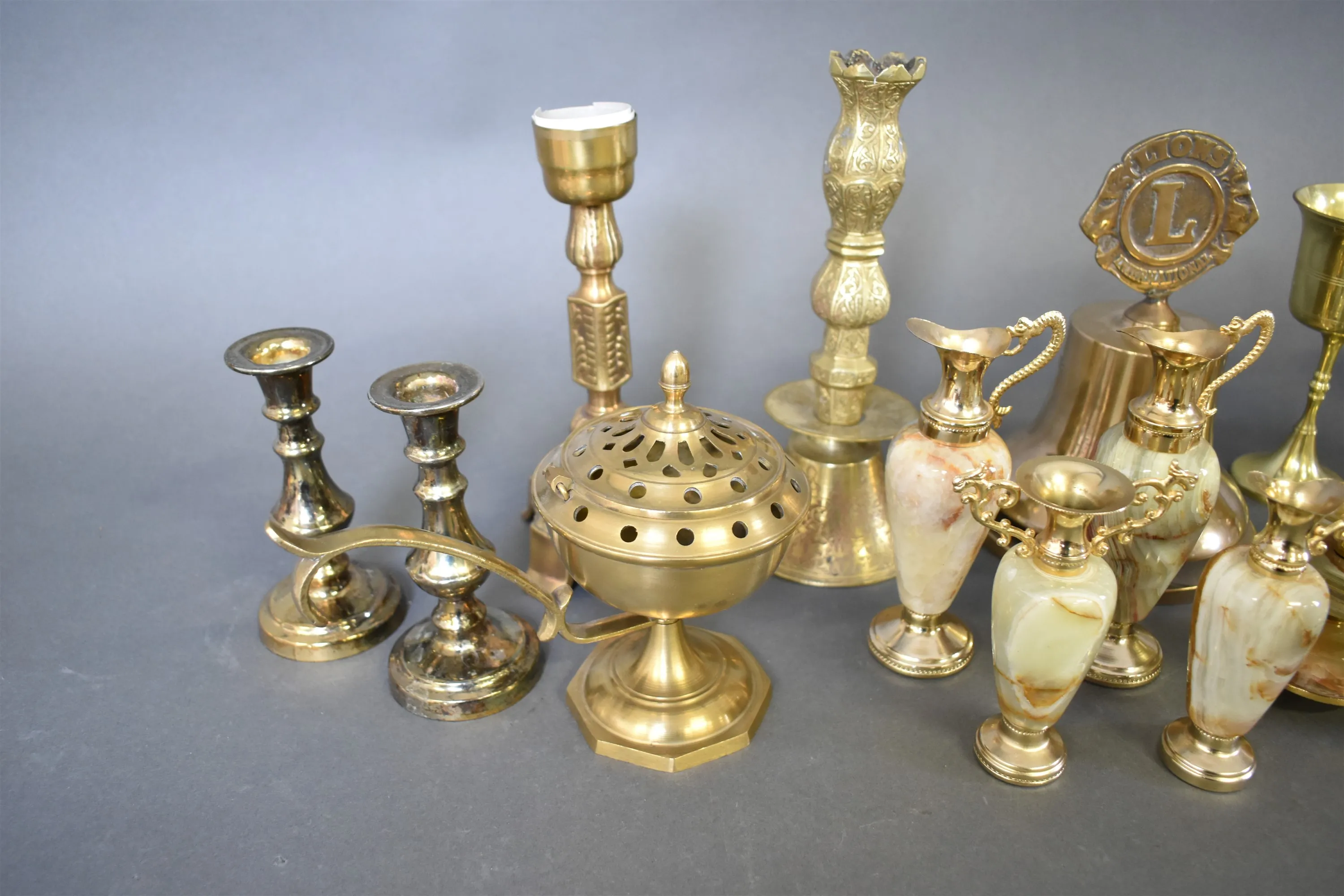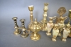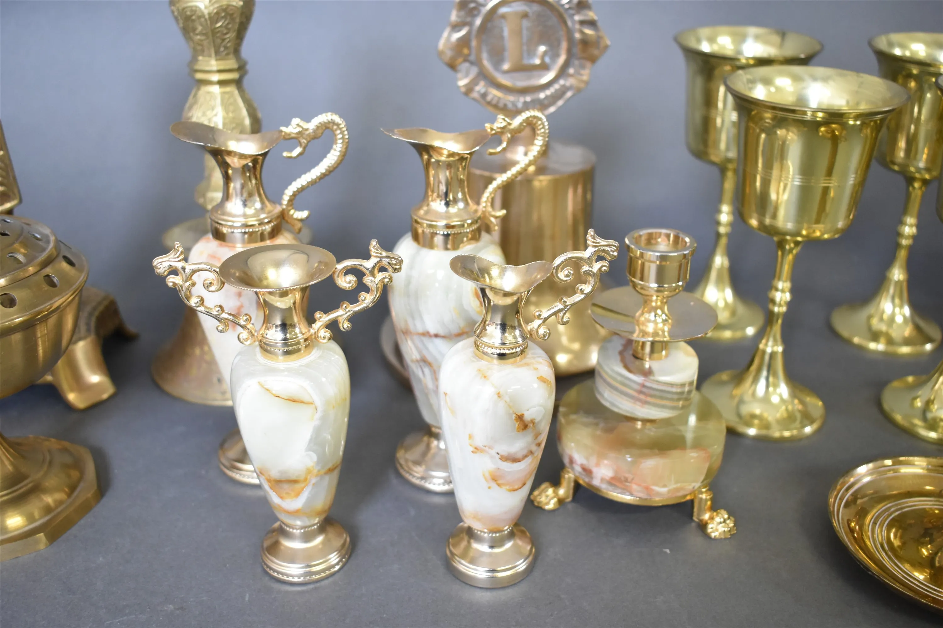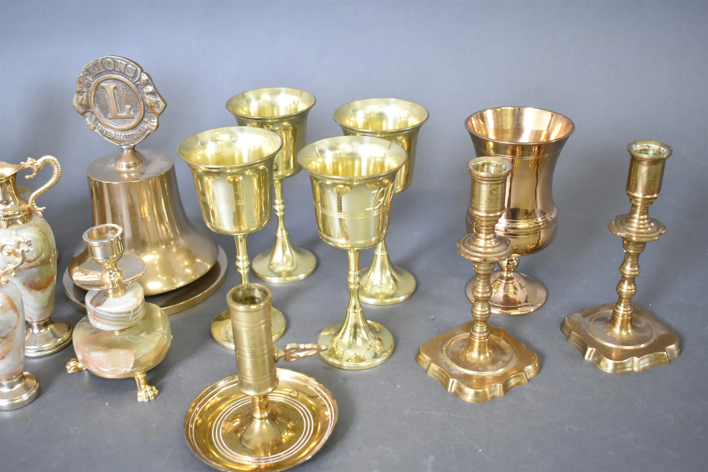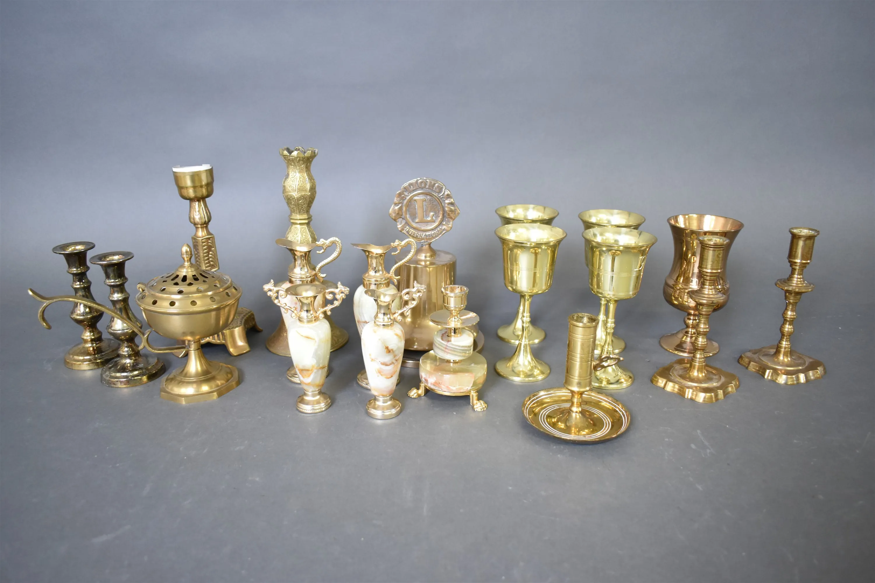 9958. Parti mässing bla ljusstakar och bägare, högsta höjd 24 cm