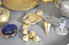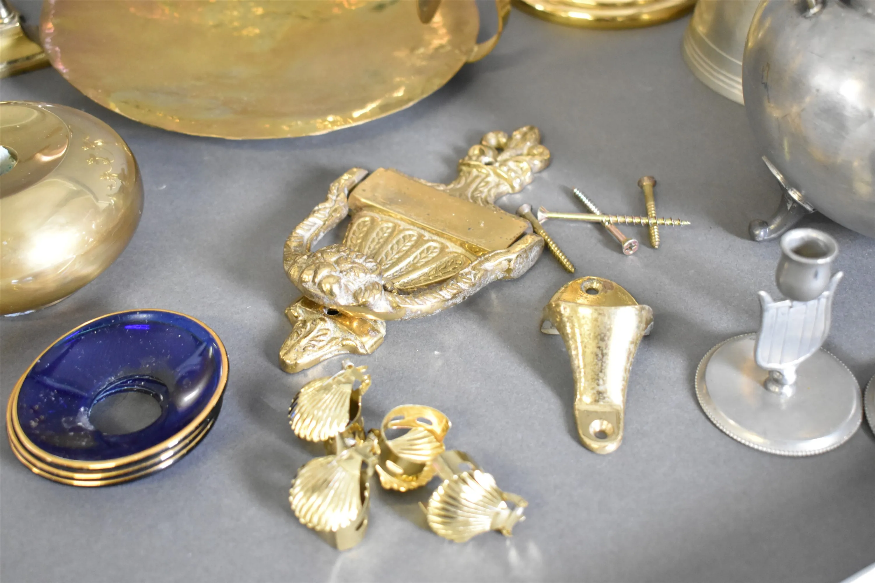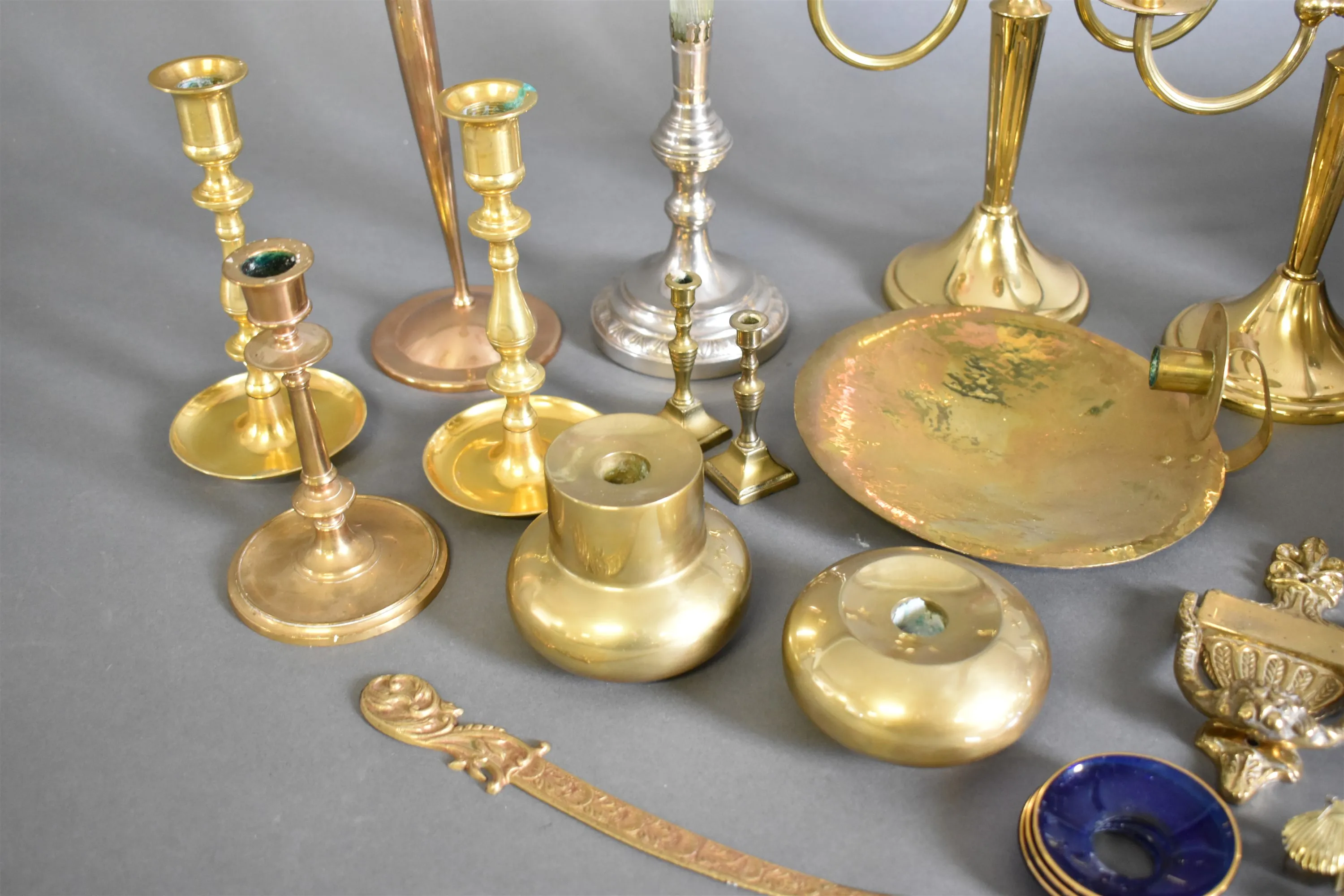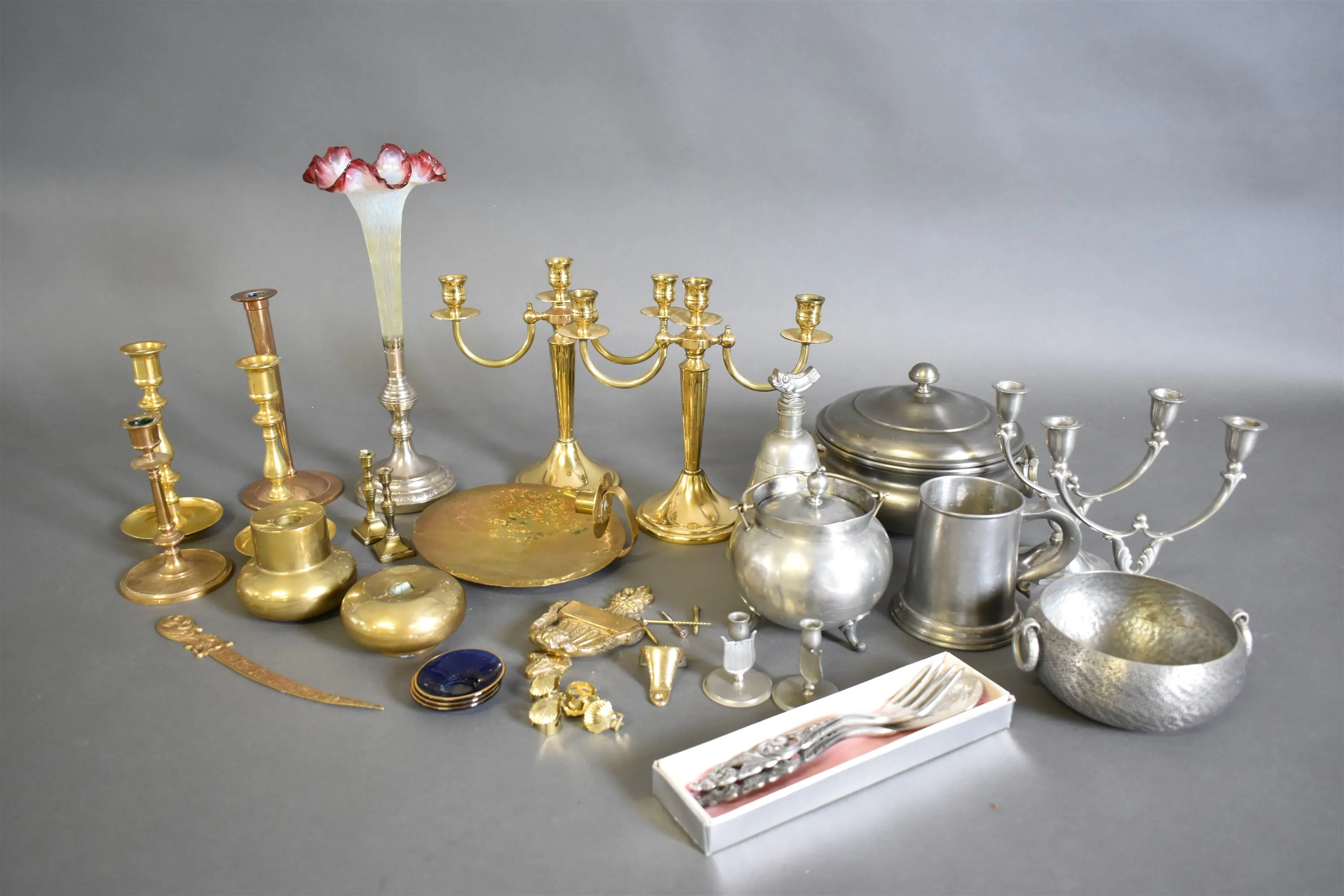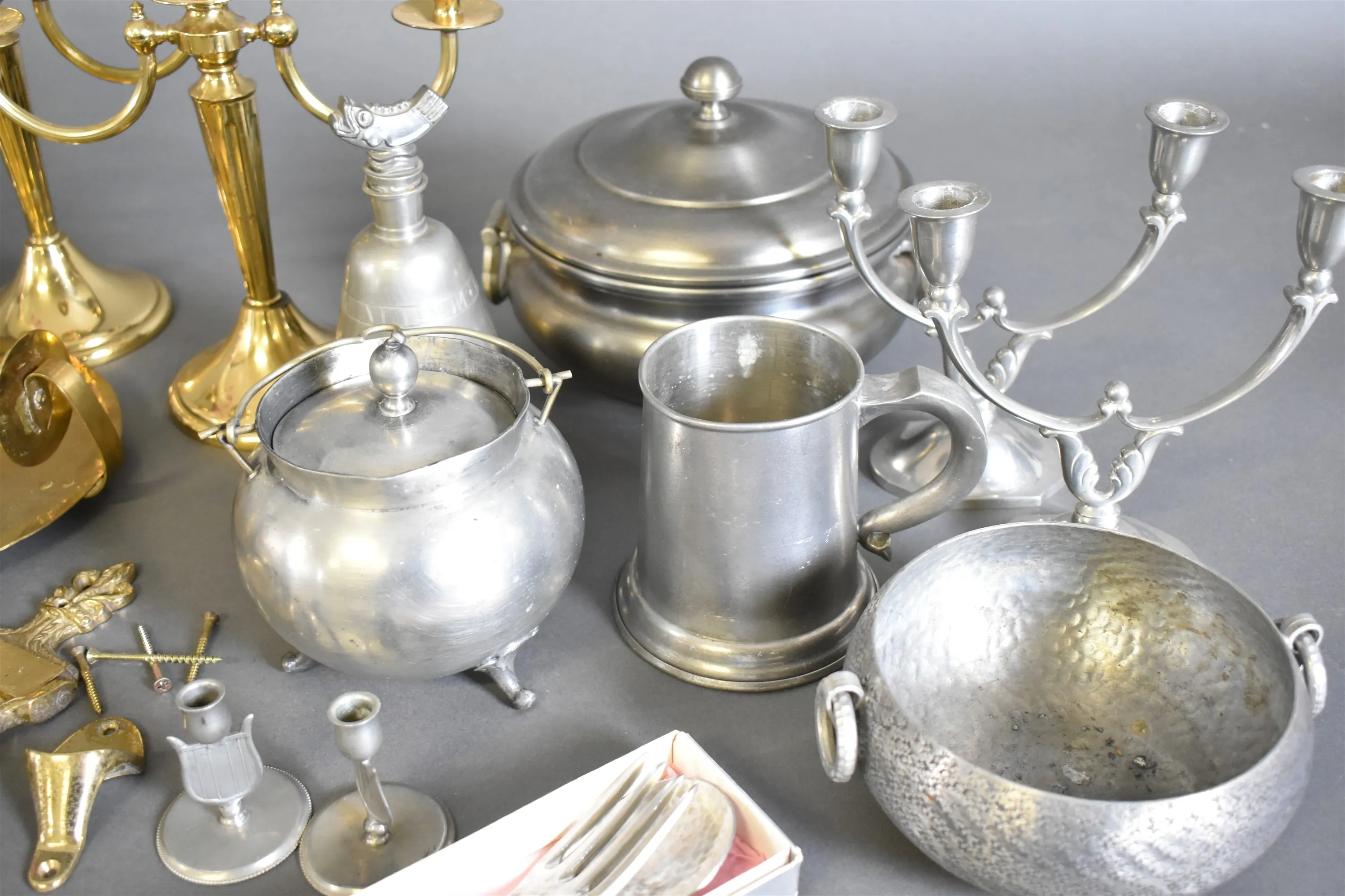 14251. Parti mässing och tenn bla ljusstakar, högsta höjd 36 cm