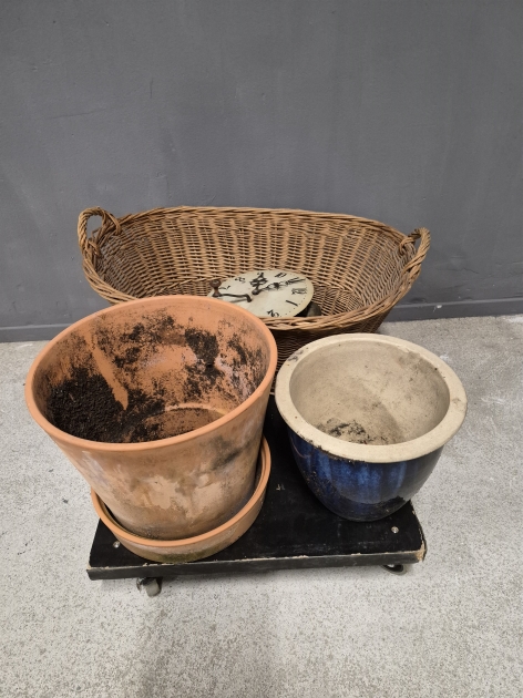 16876. Parti mangelkorg, krukor och urtavla, längsta mått 80 cm
