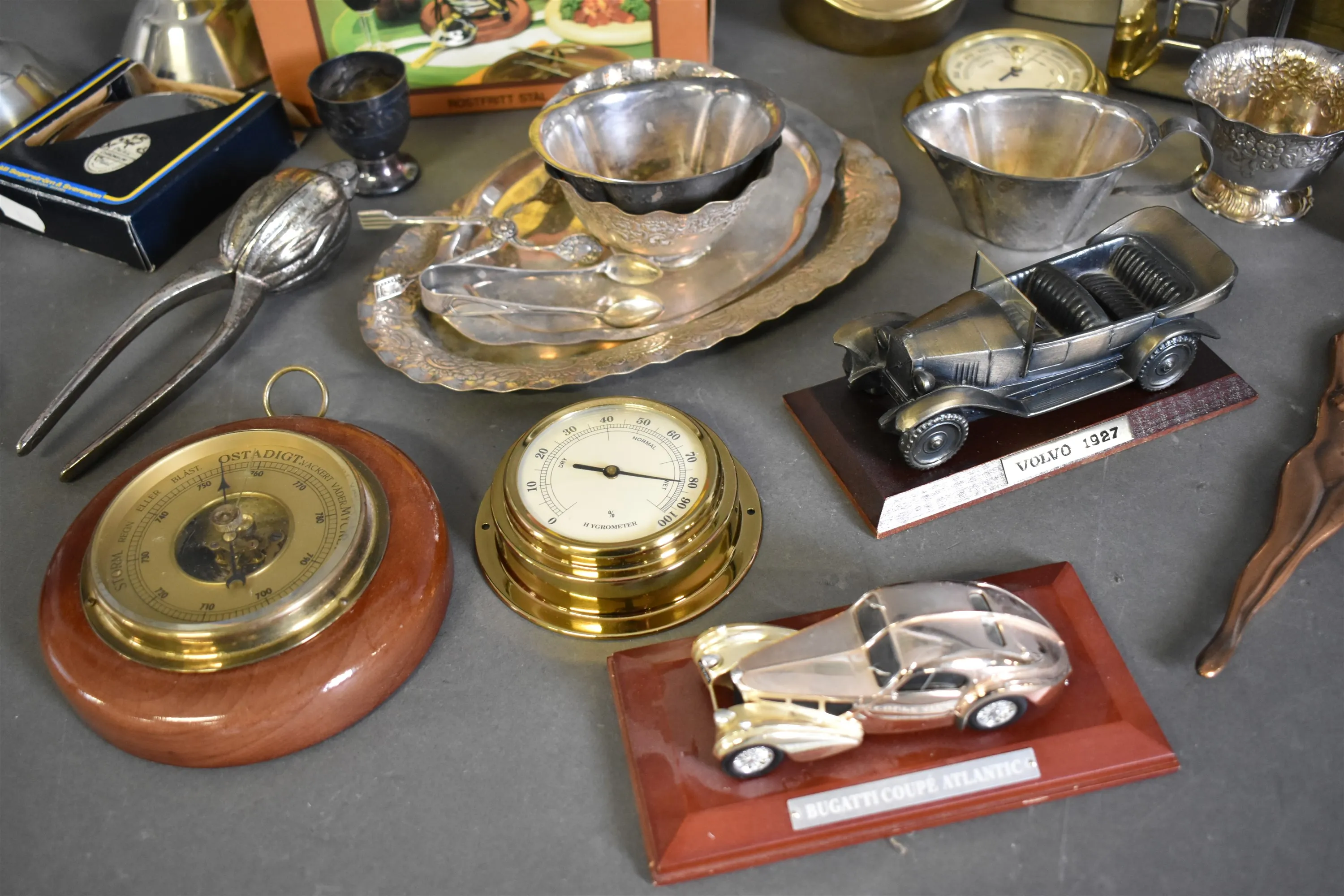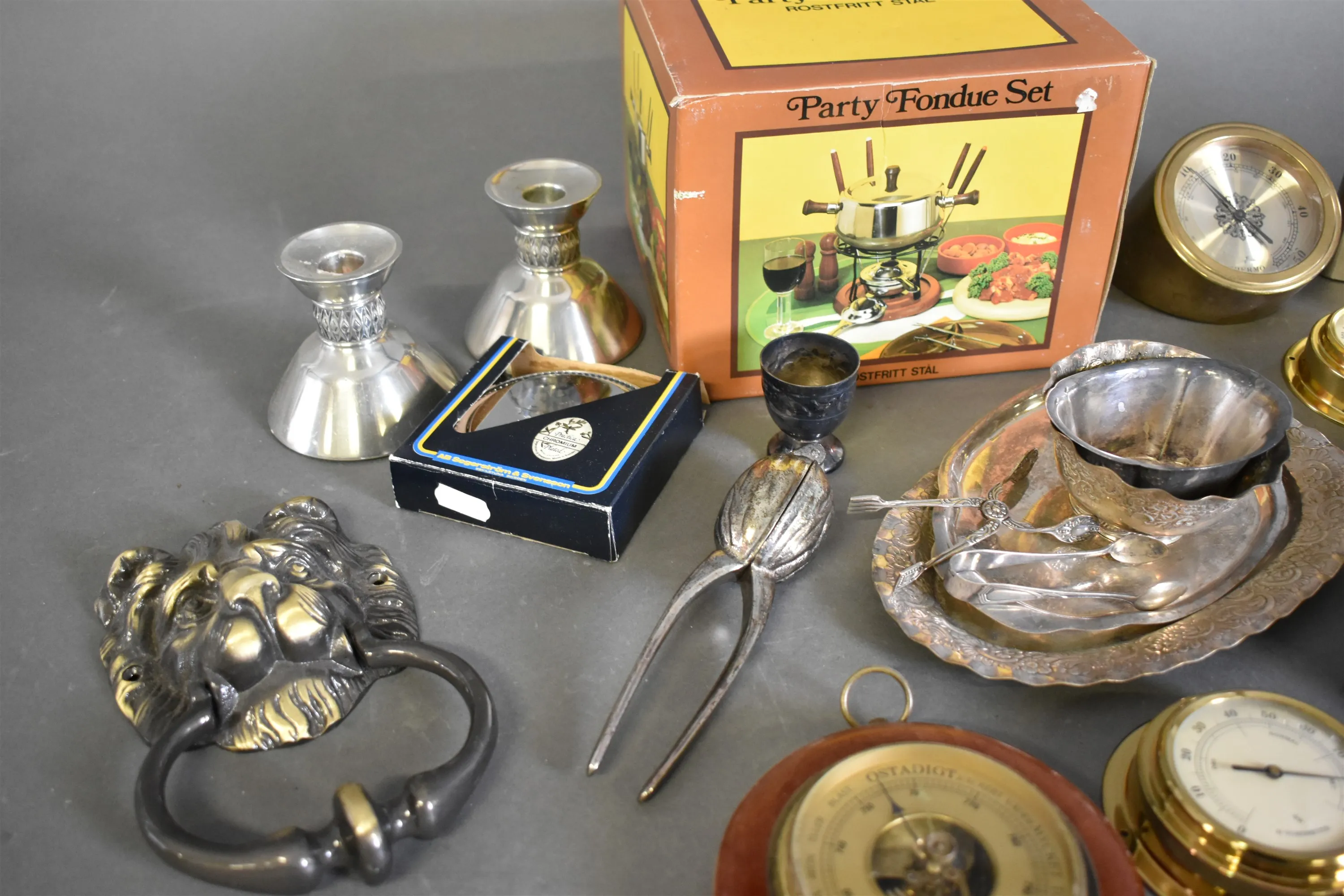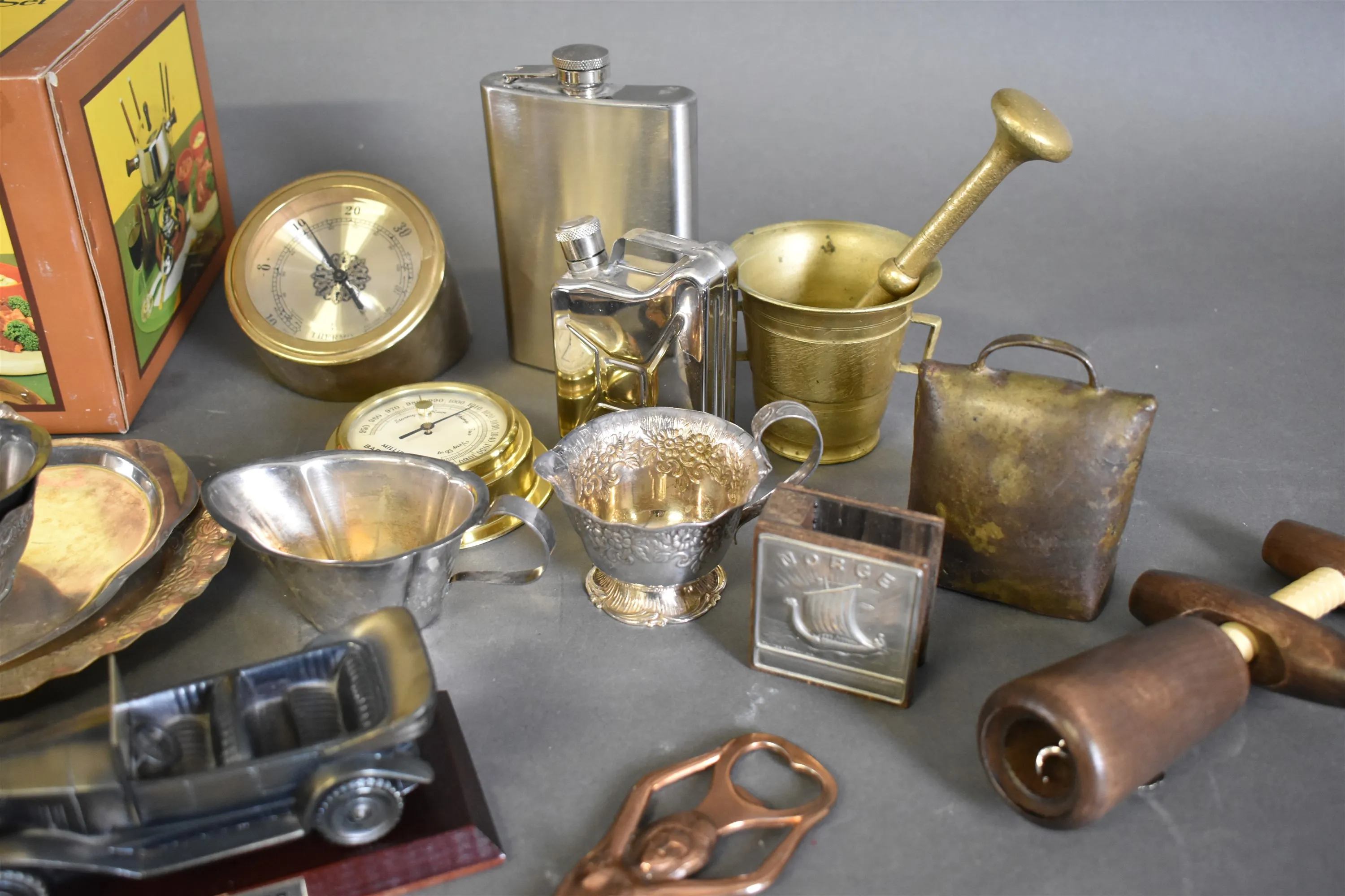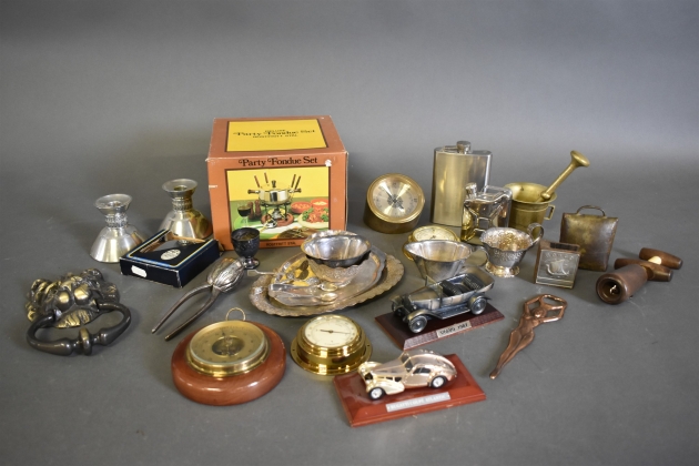 16540. Parti mestadels metall bla fondueset, barometer och mortel, högsta höjd 16 cm