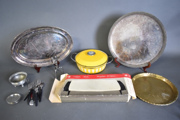 12123. Parti metall & värmeplatta/bestick, längsta 52 cm