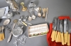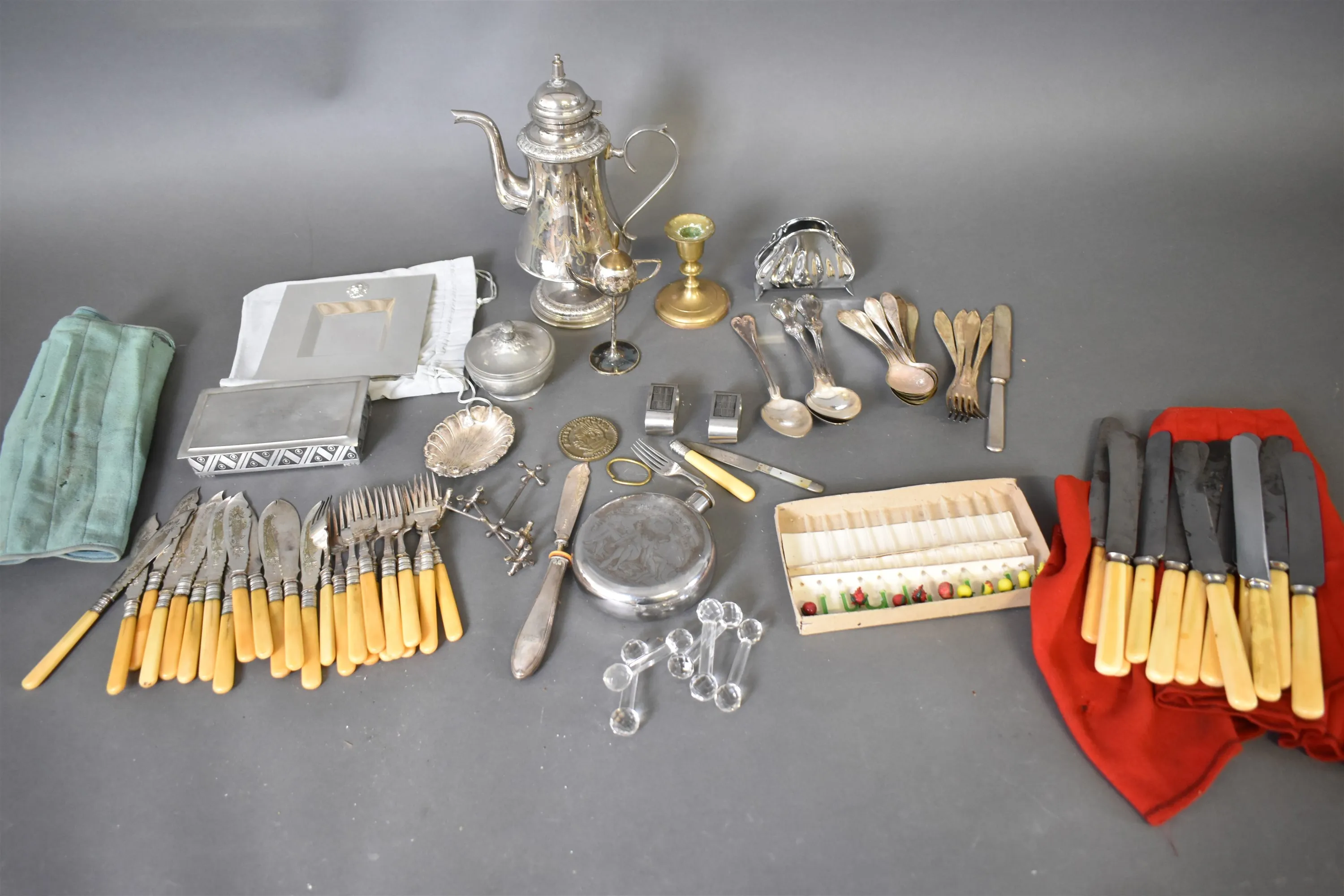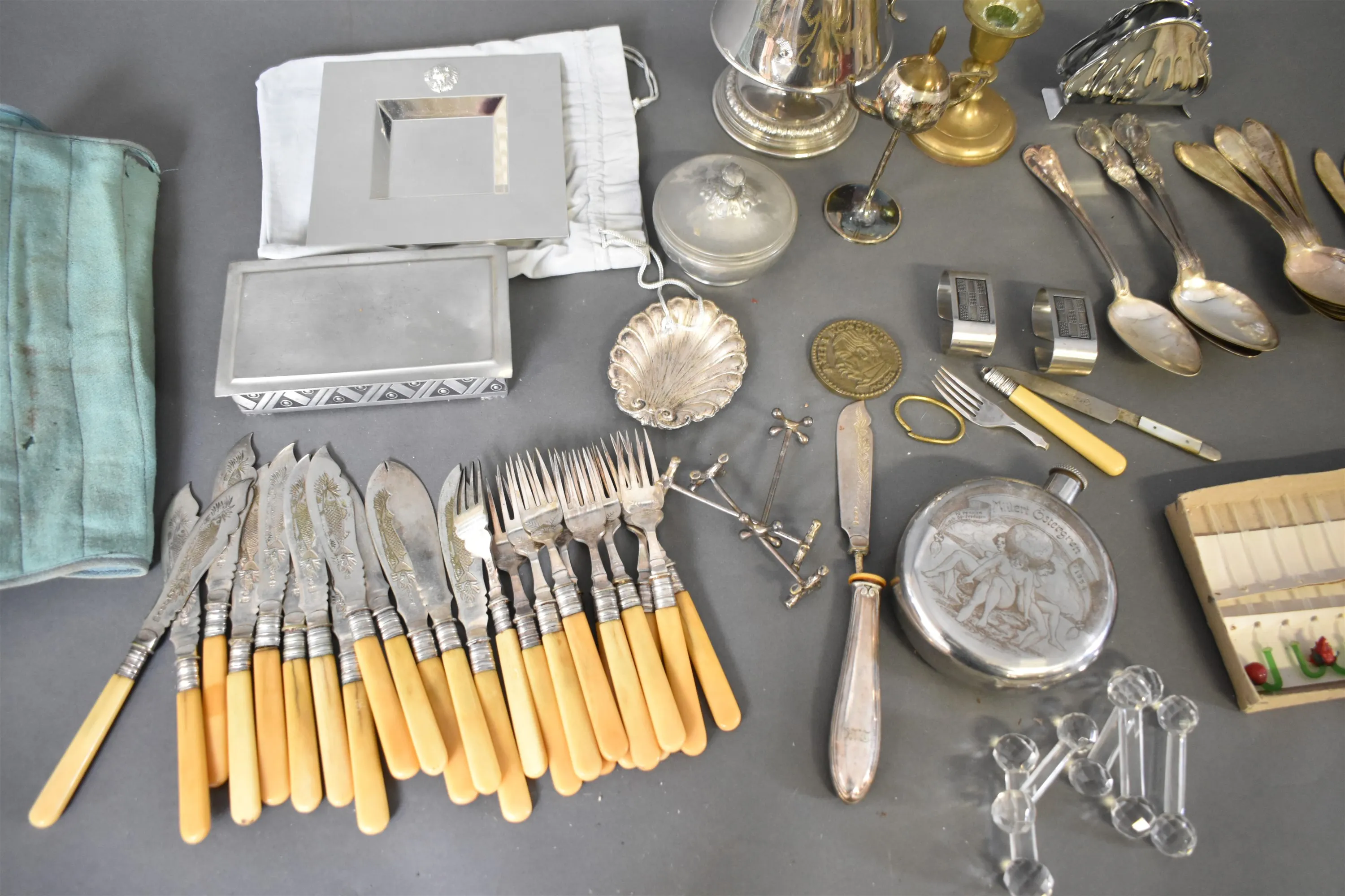 12401. Parti metall bl.a bestick nysilver med benskaft, smörknivsläggare i glas högsta 29 cm
