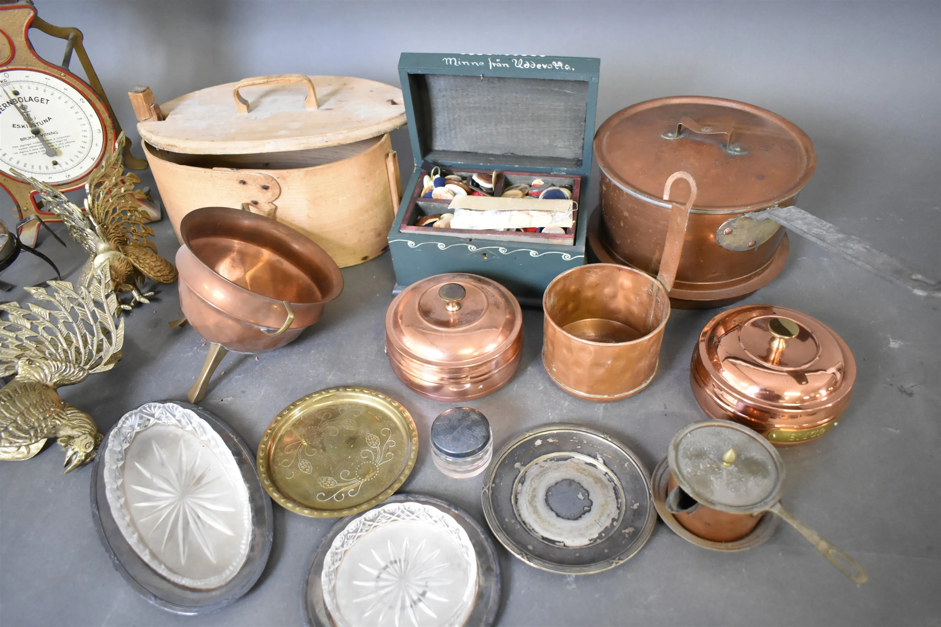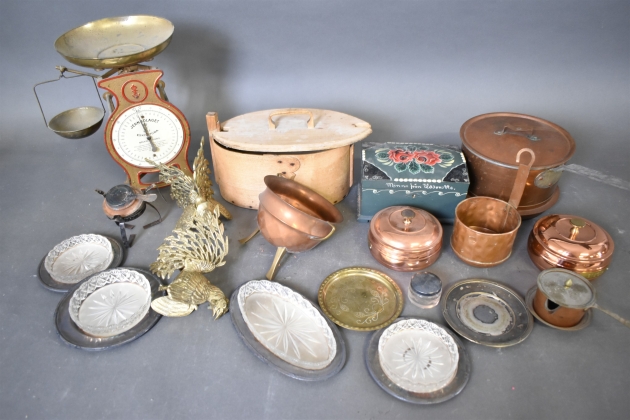12113. Parti metall bl.a Köksvåg höjd 32 cm