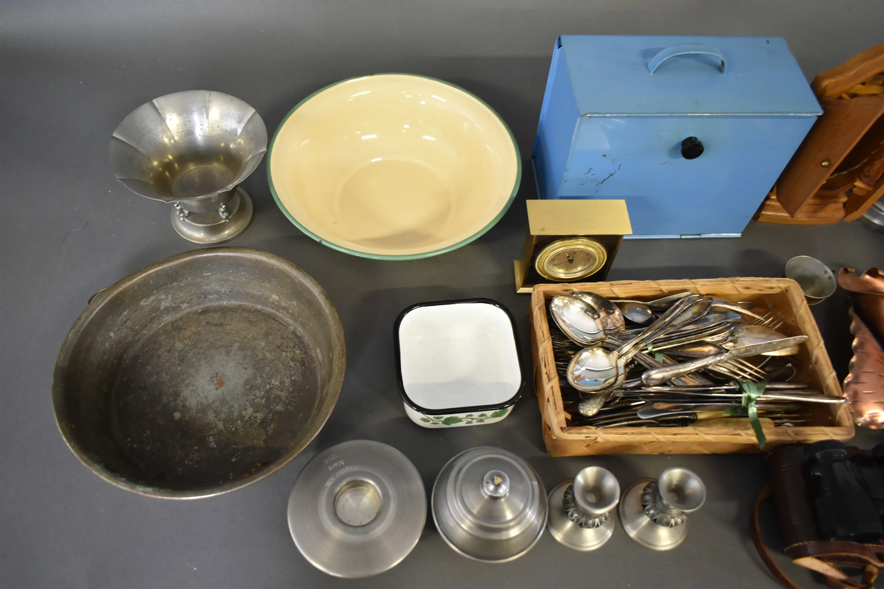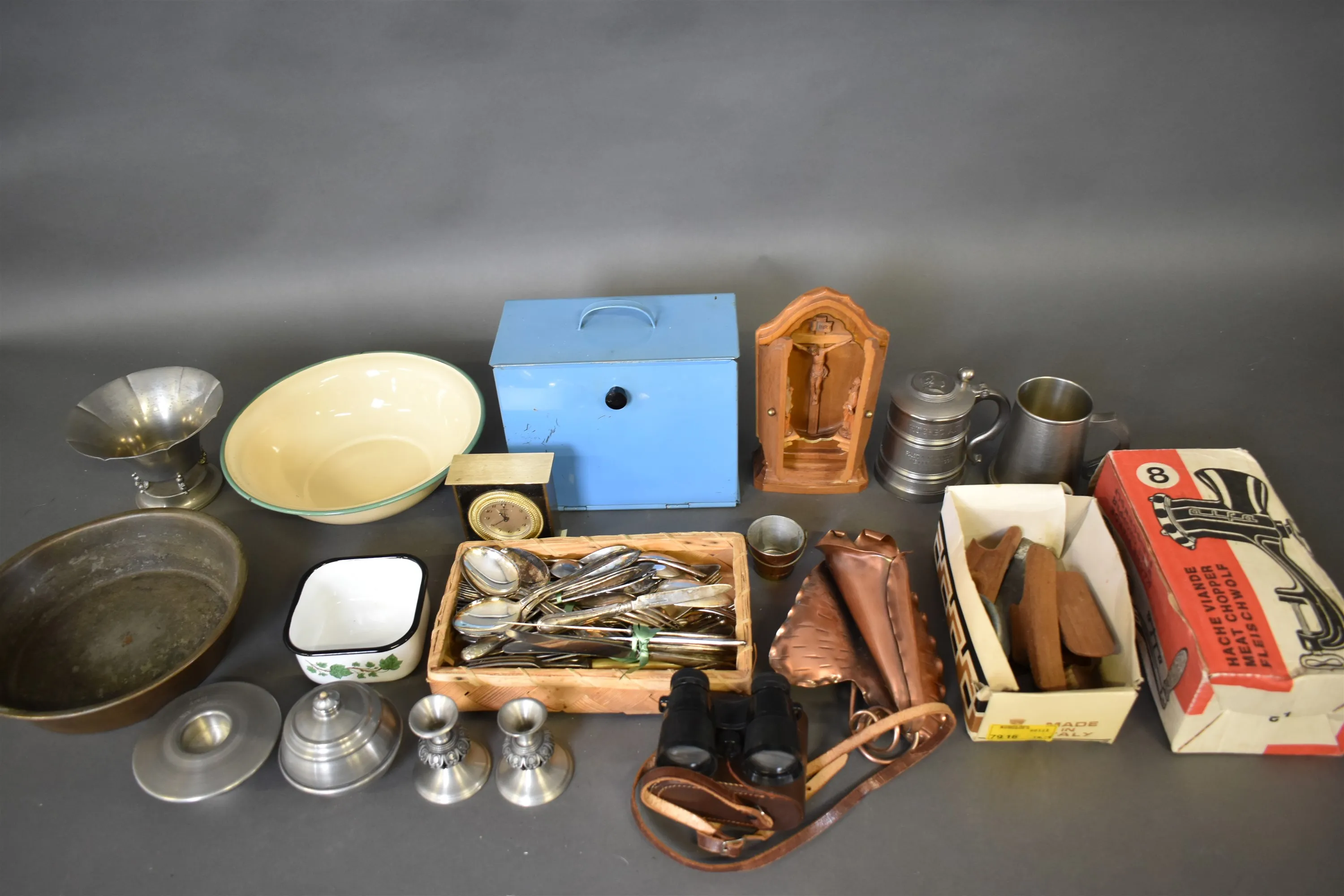 15058. Parti metall, bl.a knäckebrödsburk, retro, tennföremål, högsta 21 cm