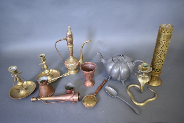 15524. Parti metall bl.a mässingsföremål, högsta 34 cm