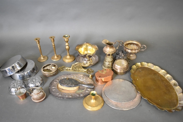 9142. Parti metall bl.a mässingsljusstakar högsta 20 cm