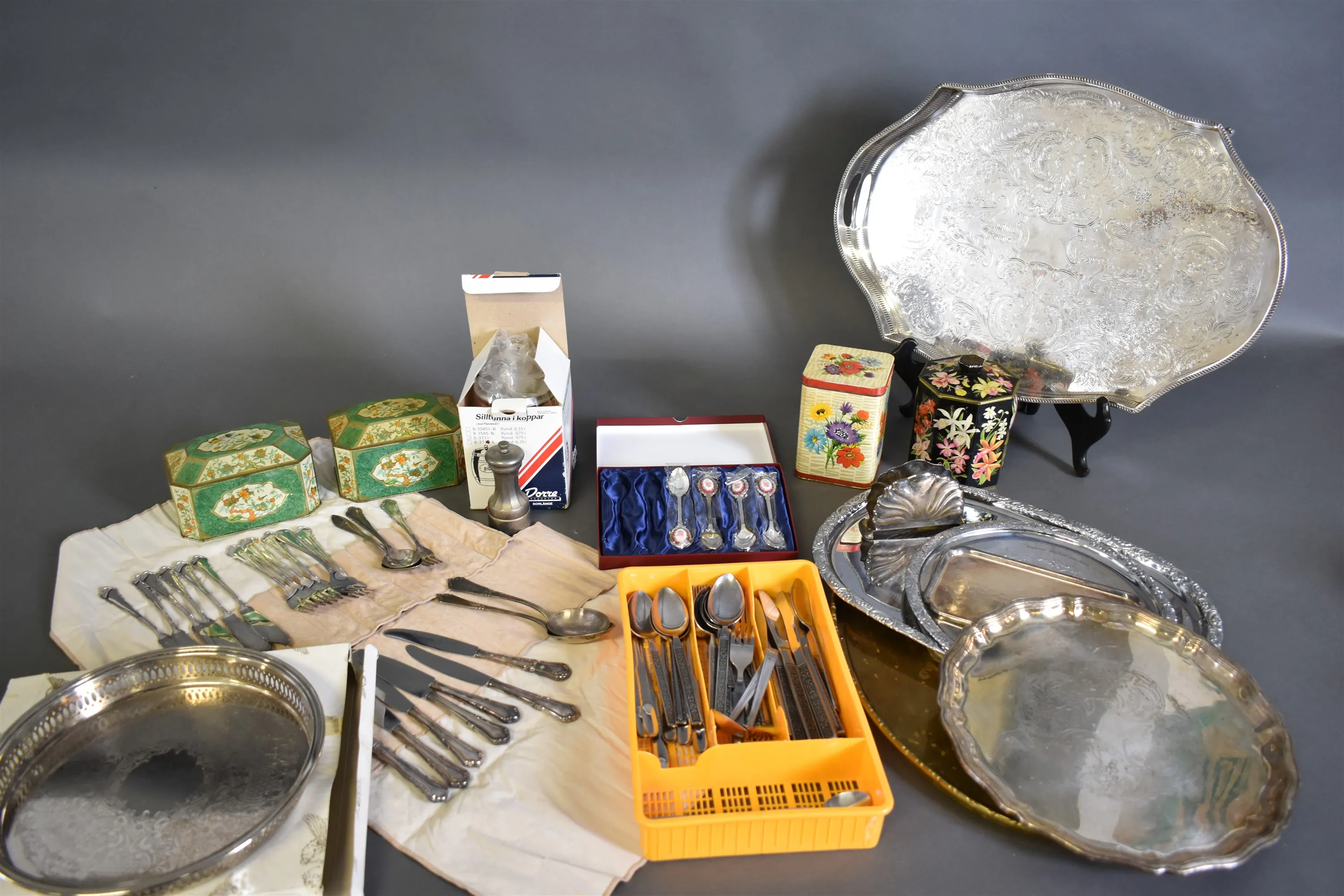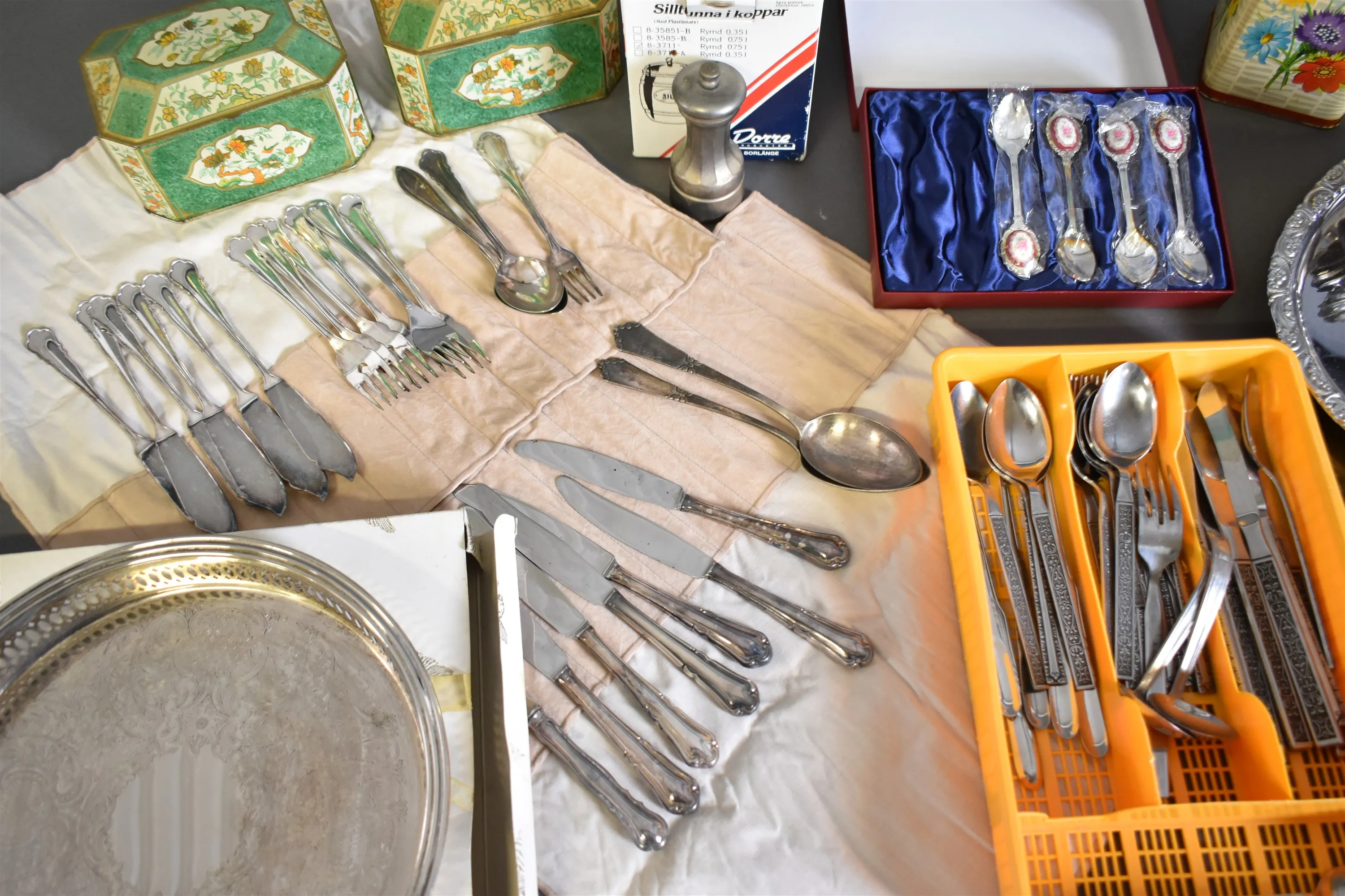 14413. Parti metall bl.a plåtburkar, bestick, längsta 51 cm