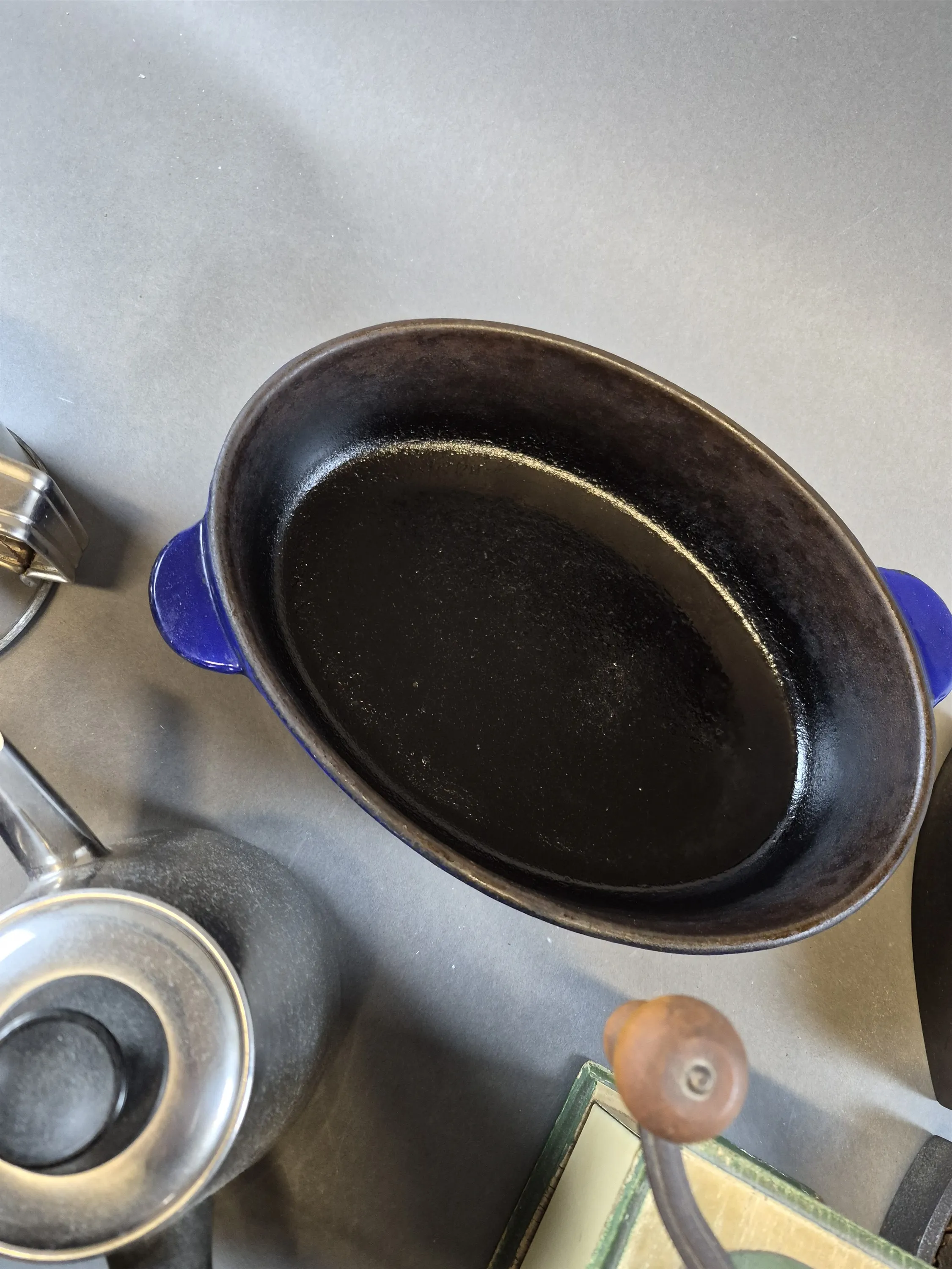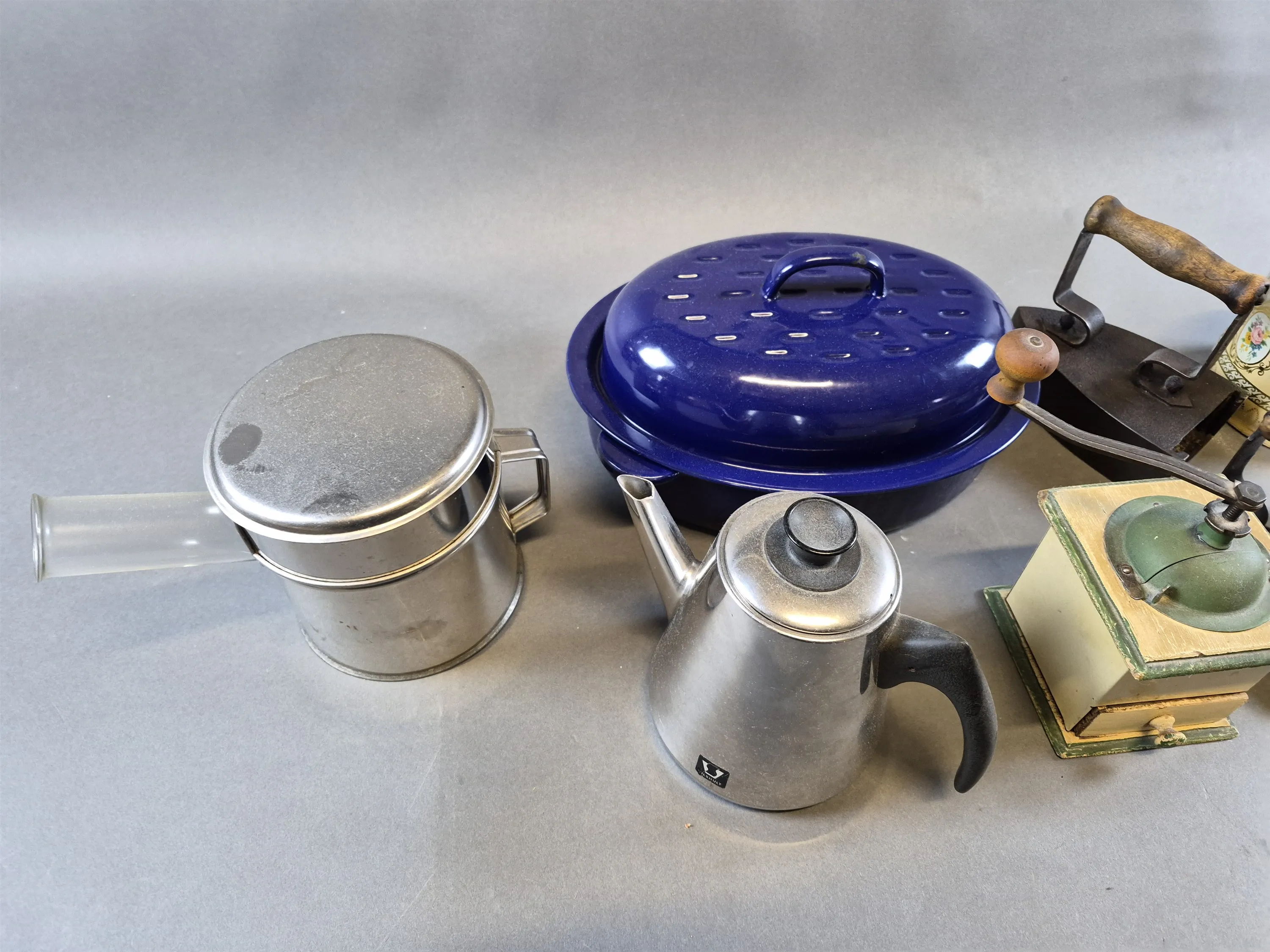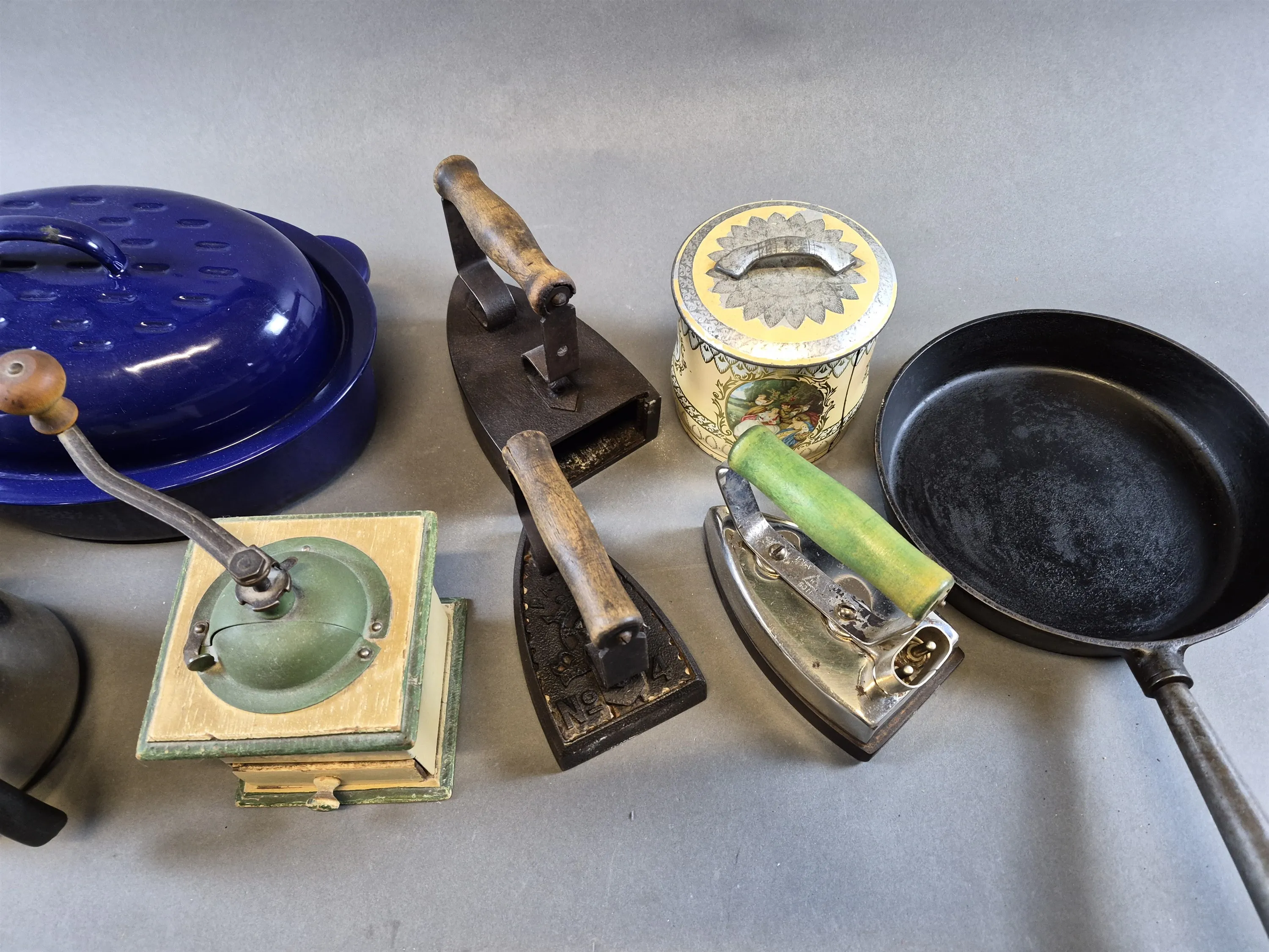 20872. Parti metall bl.a strykjärn och gjutjärns stekjärn, längsta mått 34 cm