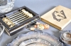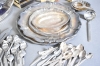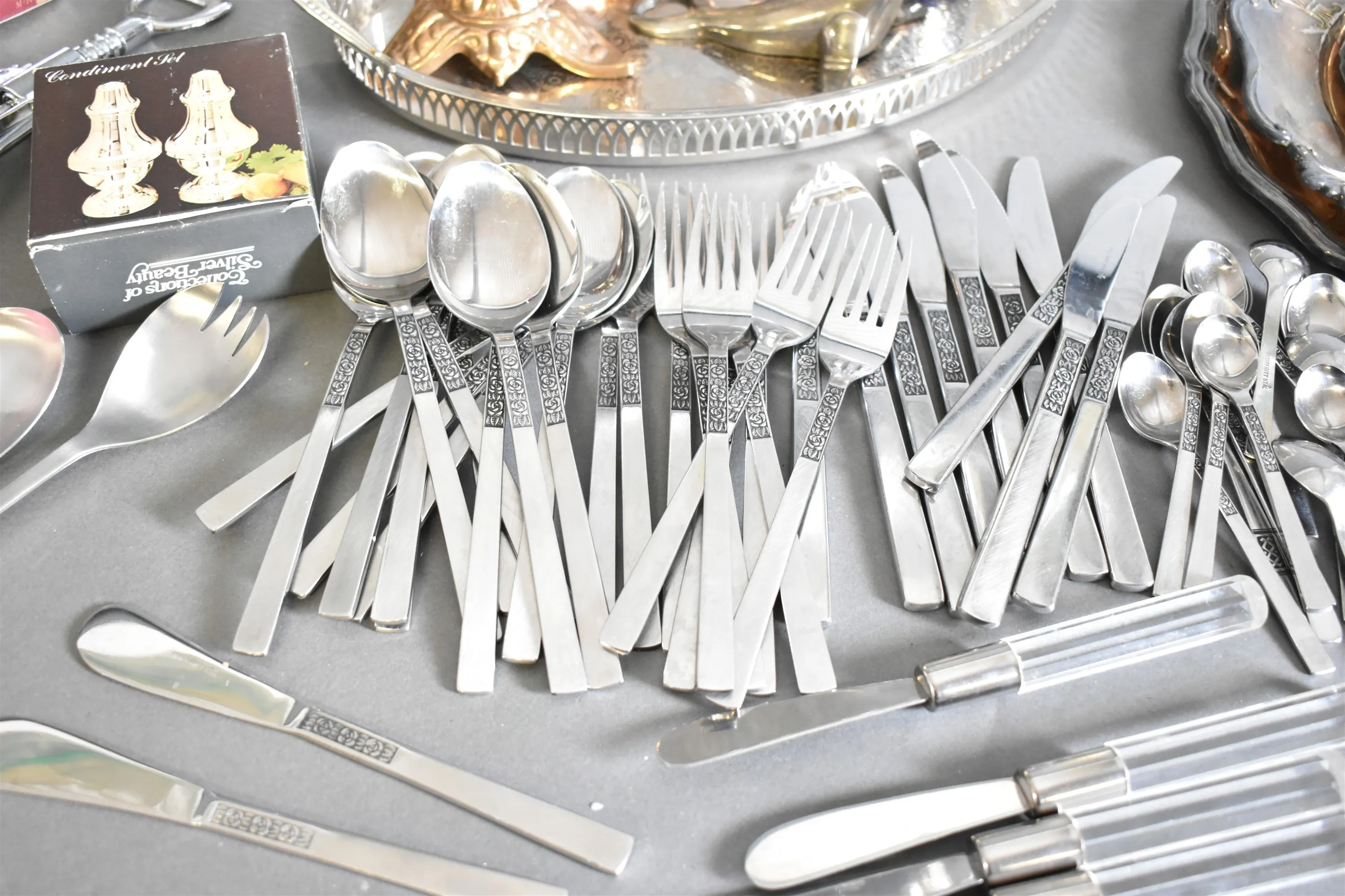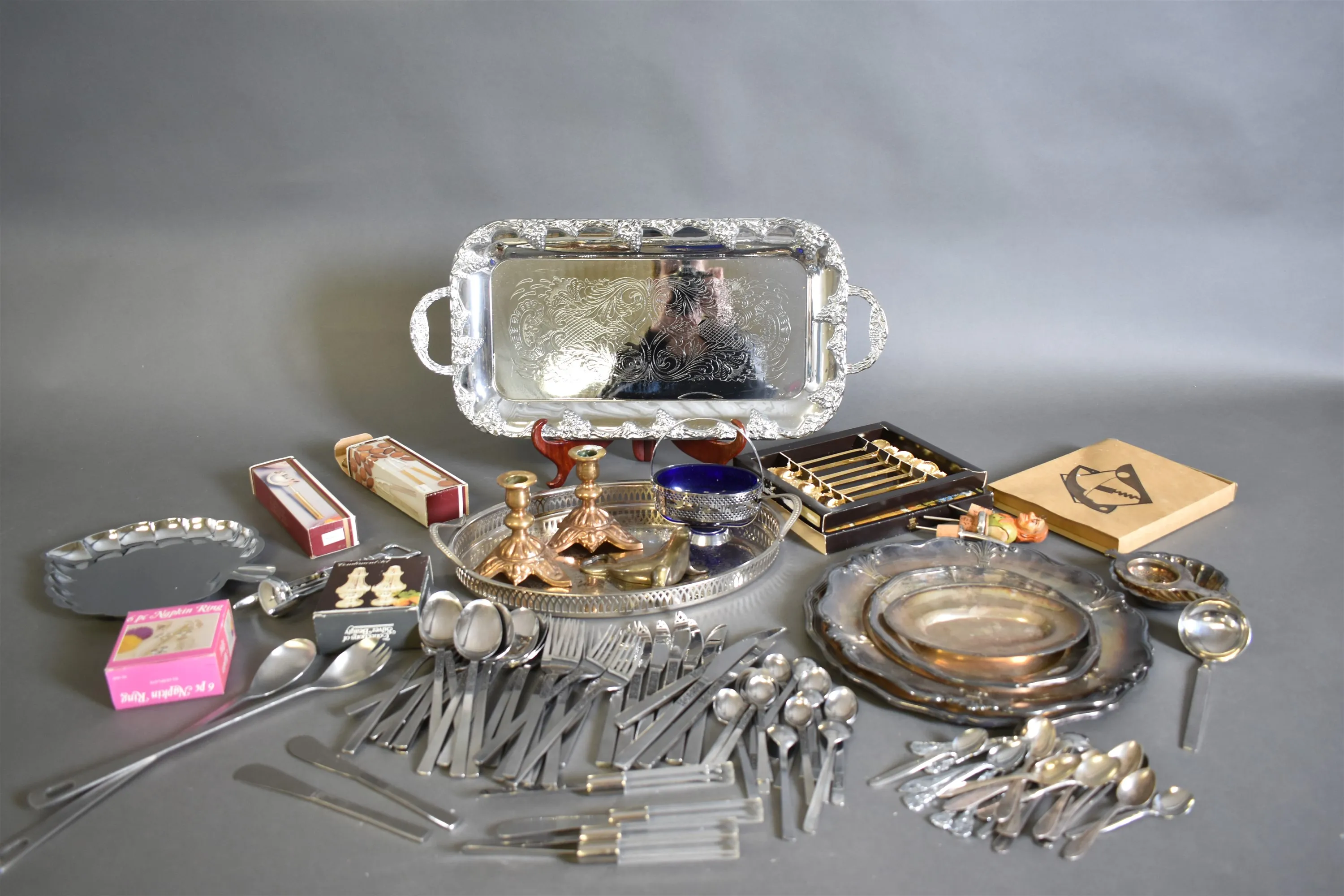 14370. Parti metall bla brickor och bestick, längsta mått 56 cm