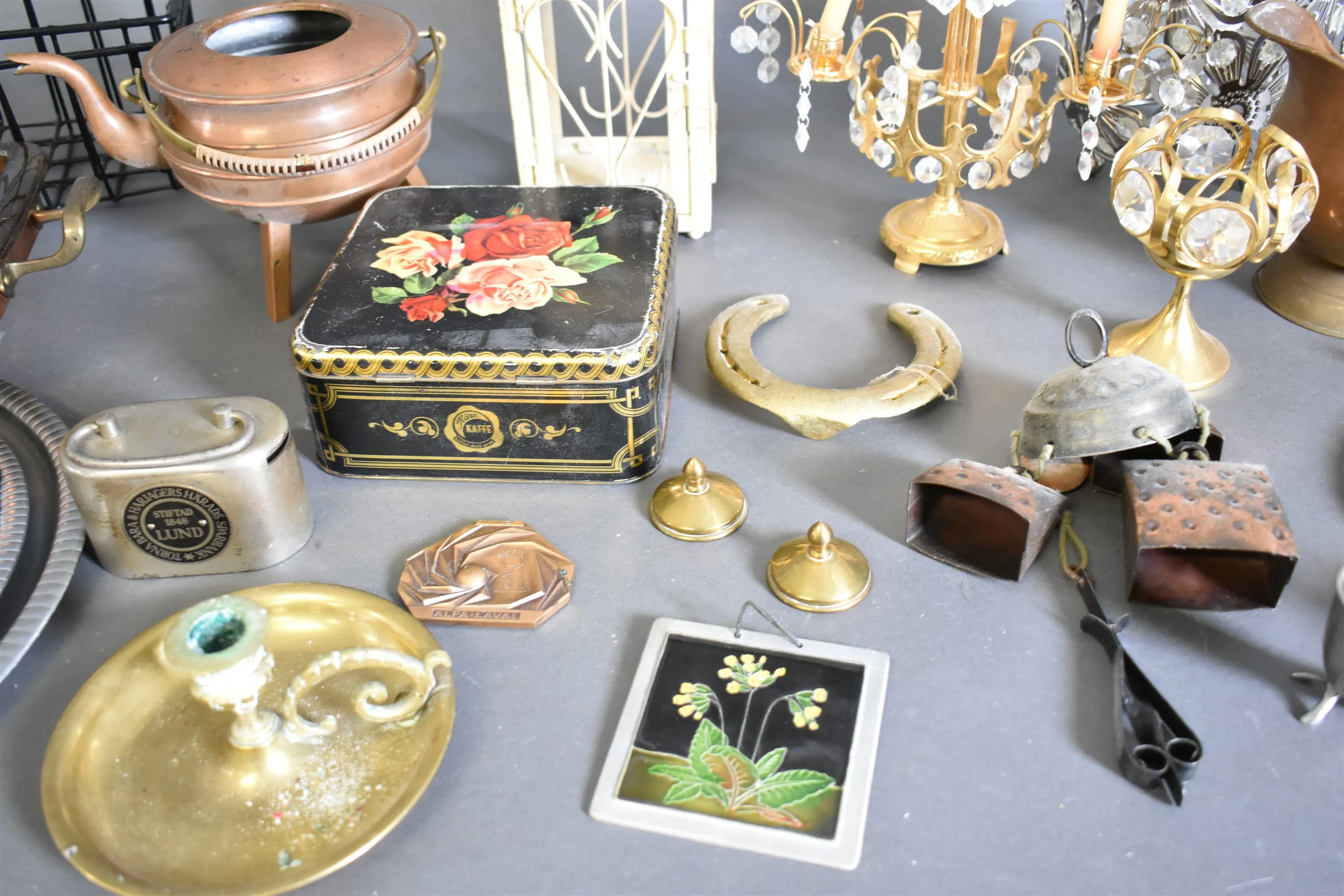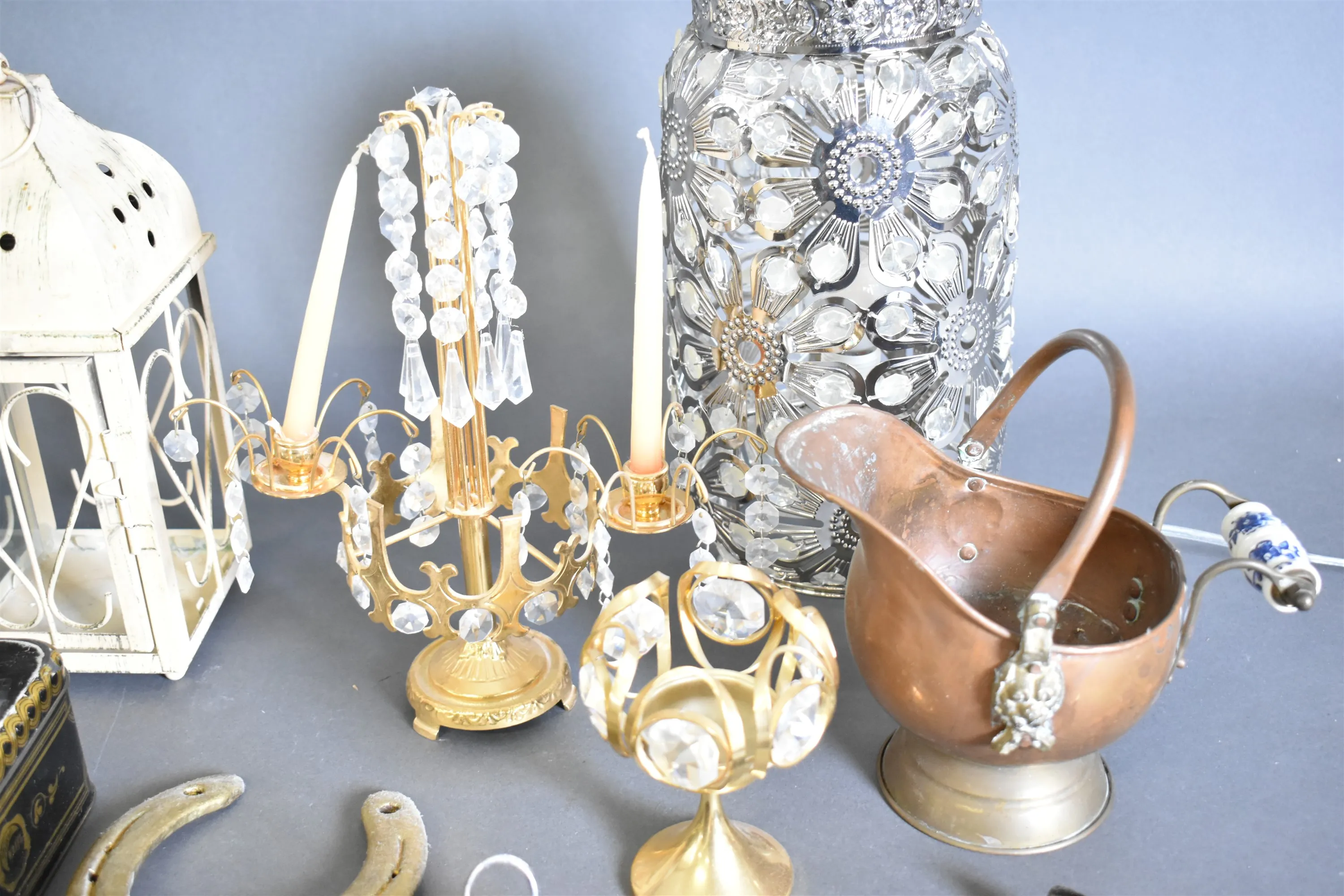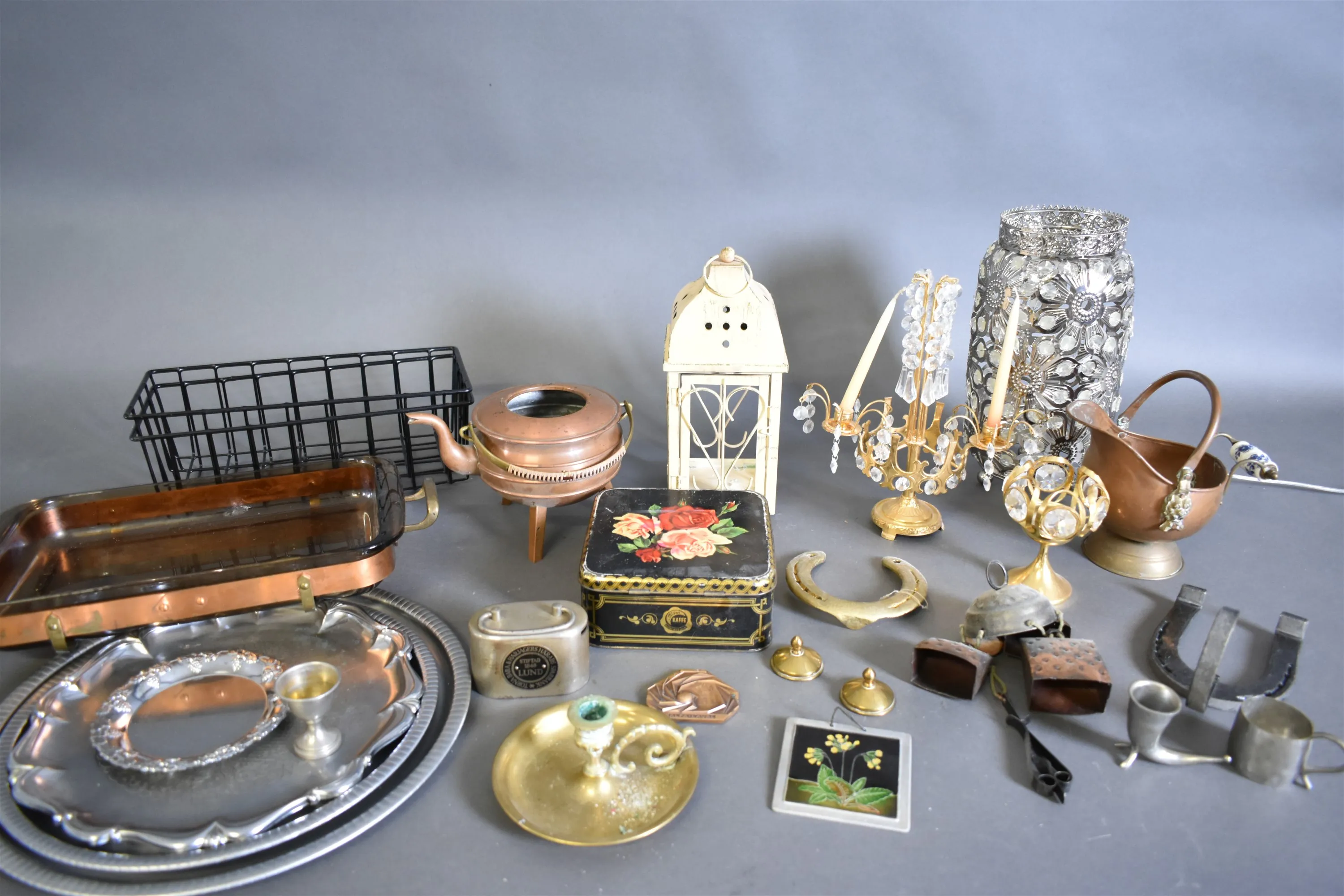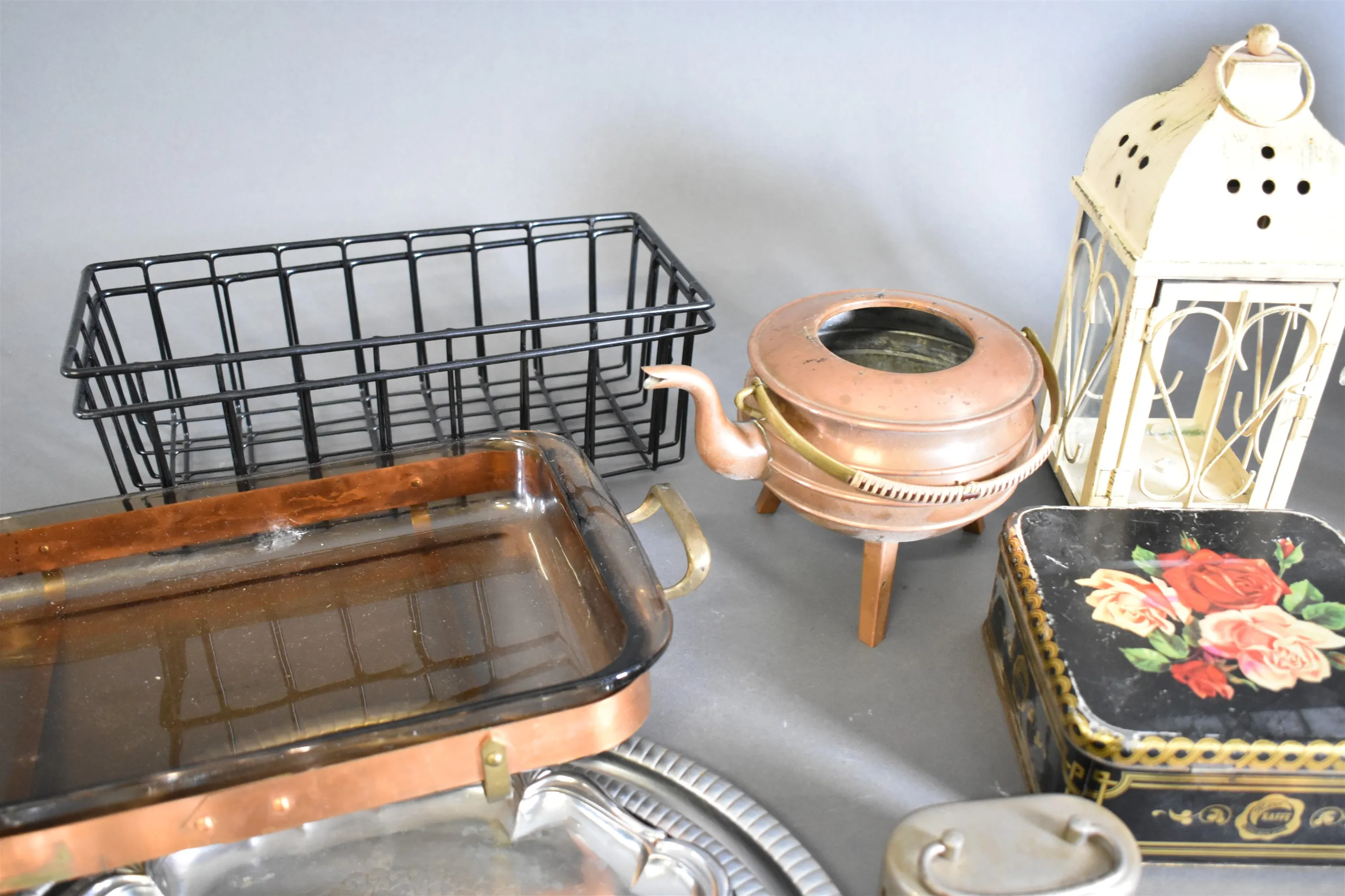 14489. Parti metall bla kopparföremål, bordslampa och lykta, högsta höjd 31 cm