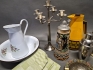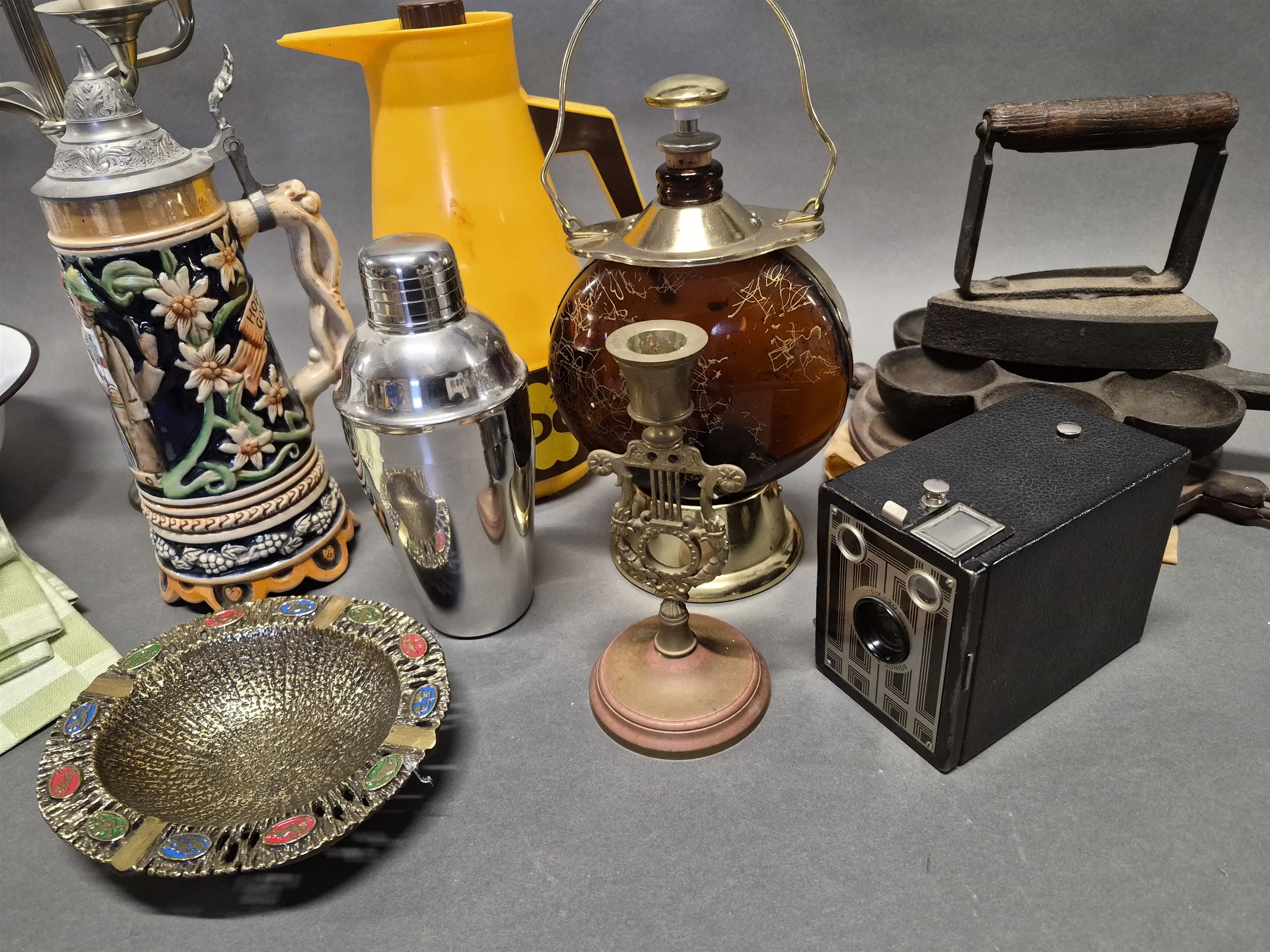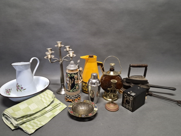 18004. Parti metall bla ljusstake Skultuna, emaljerat tvättset och gjutjärnsföremål, högsta höjd 37 cm