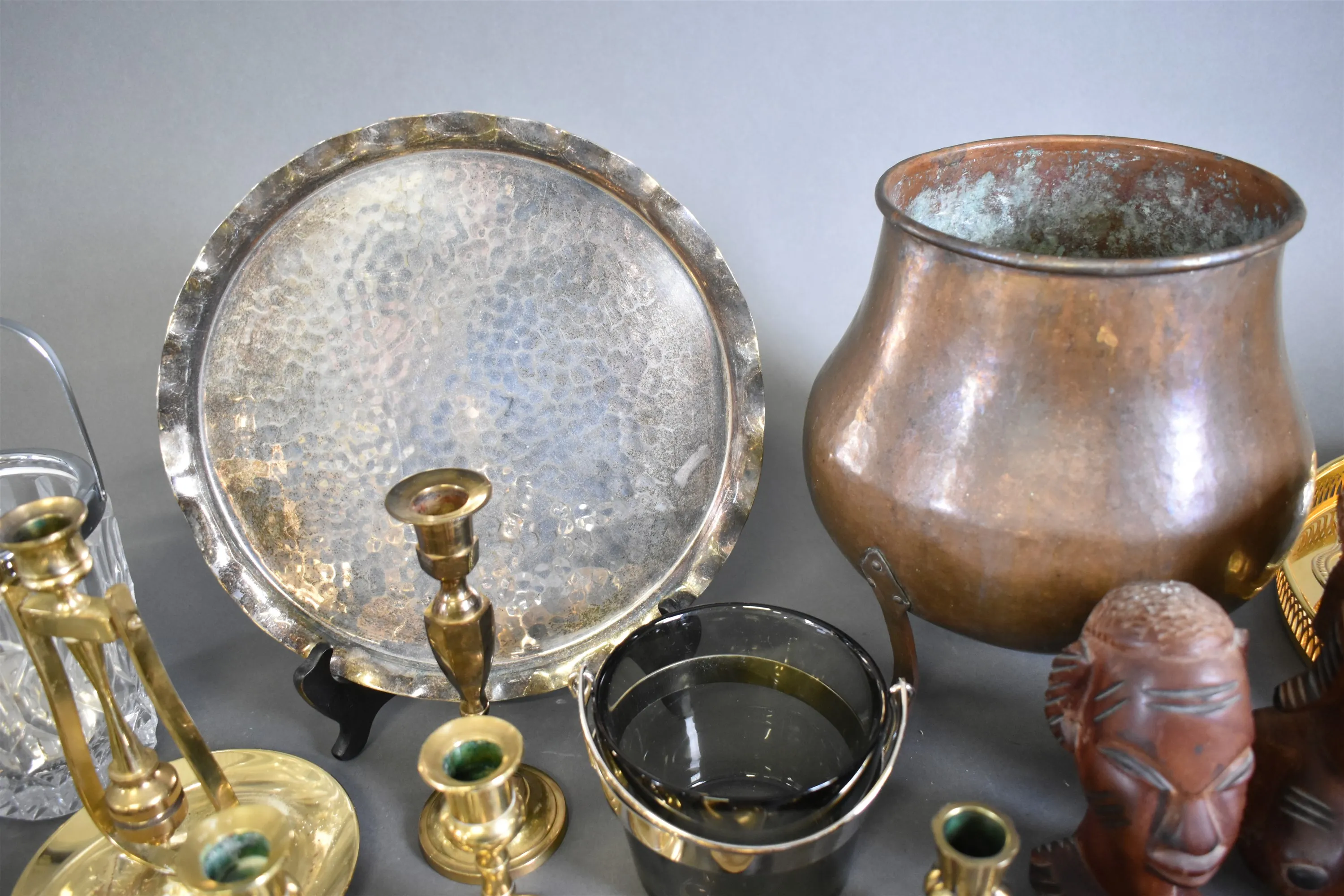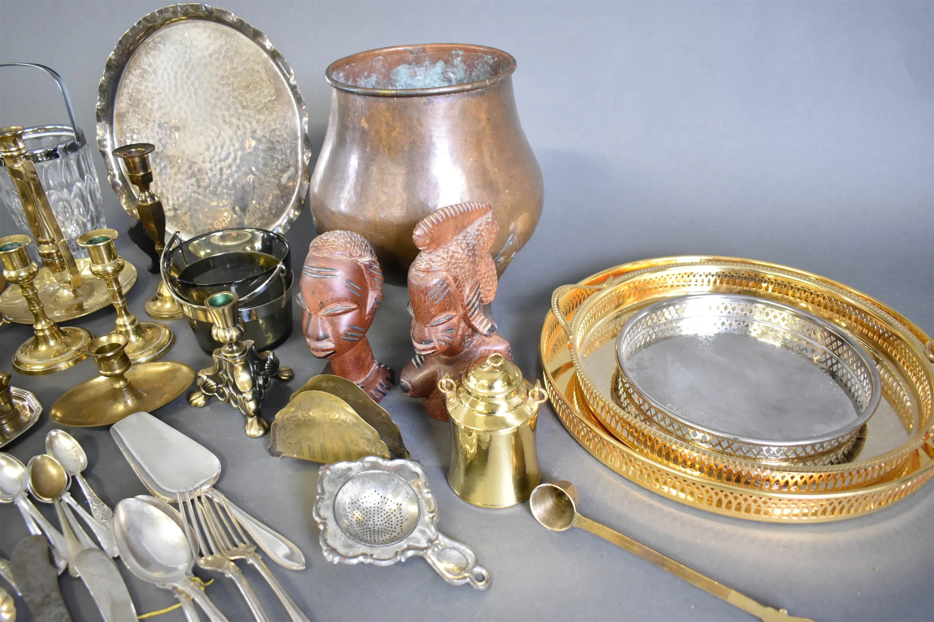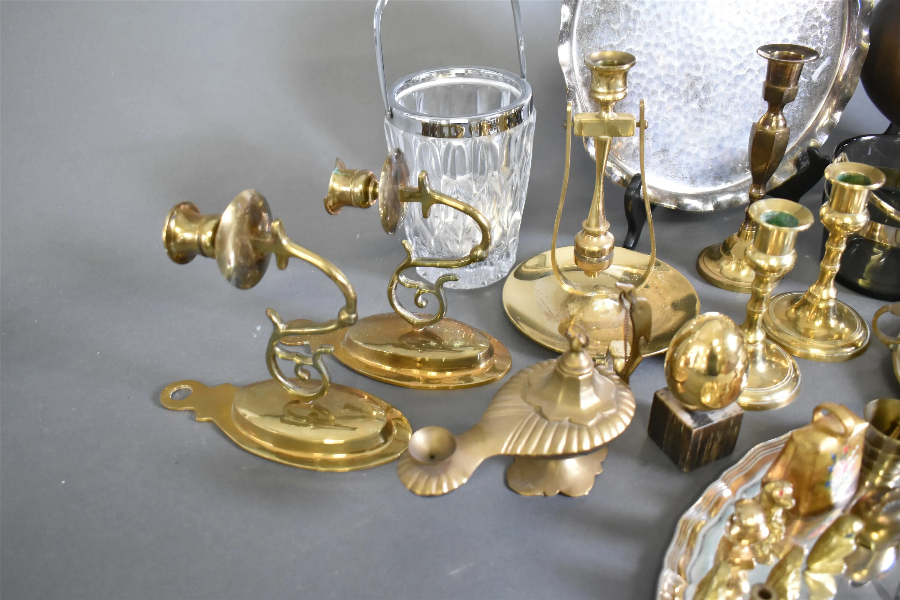 11963. Parti metall bla mässingljusstakar, miniatyrer och brickor, högsta höjd 31 cm