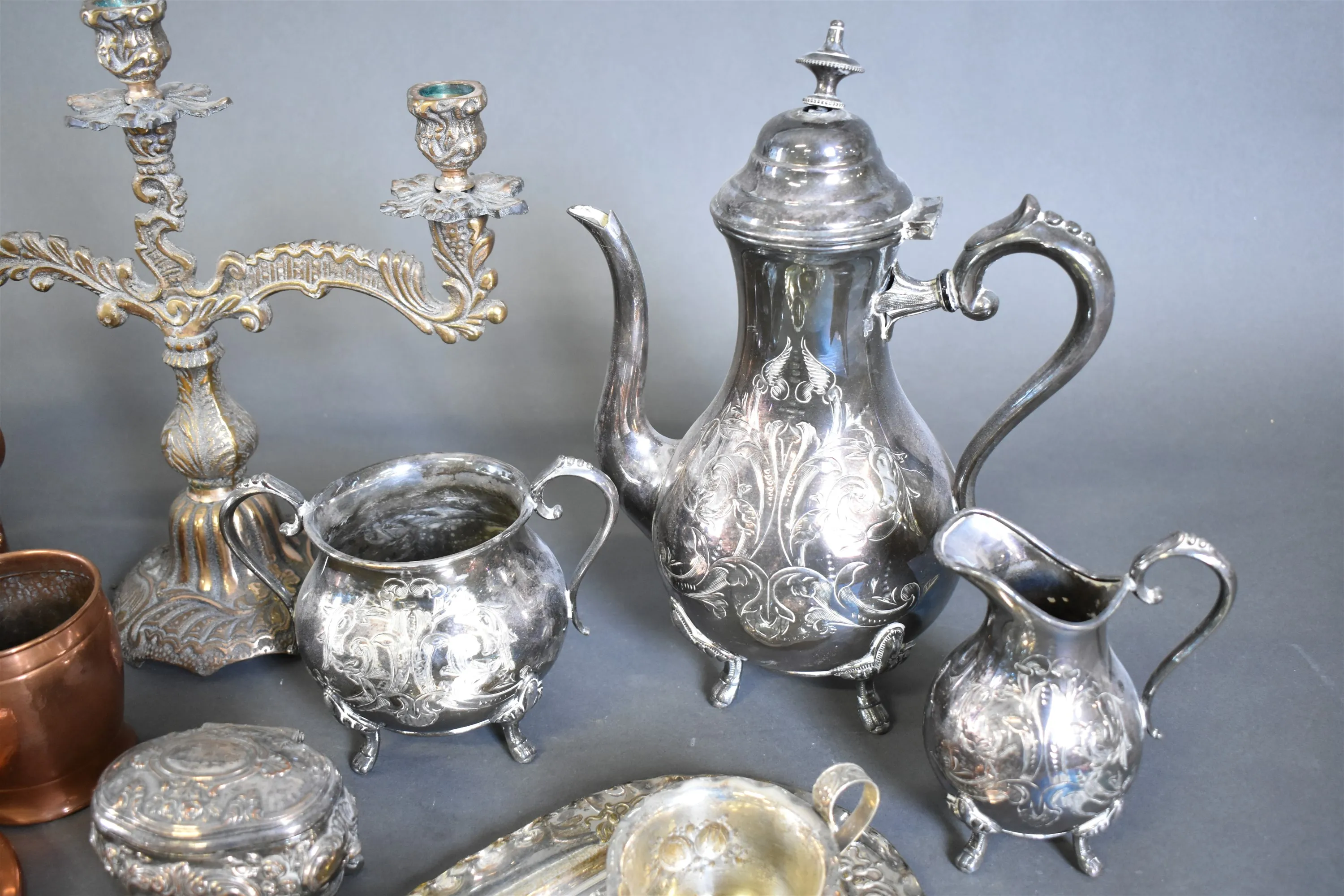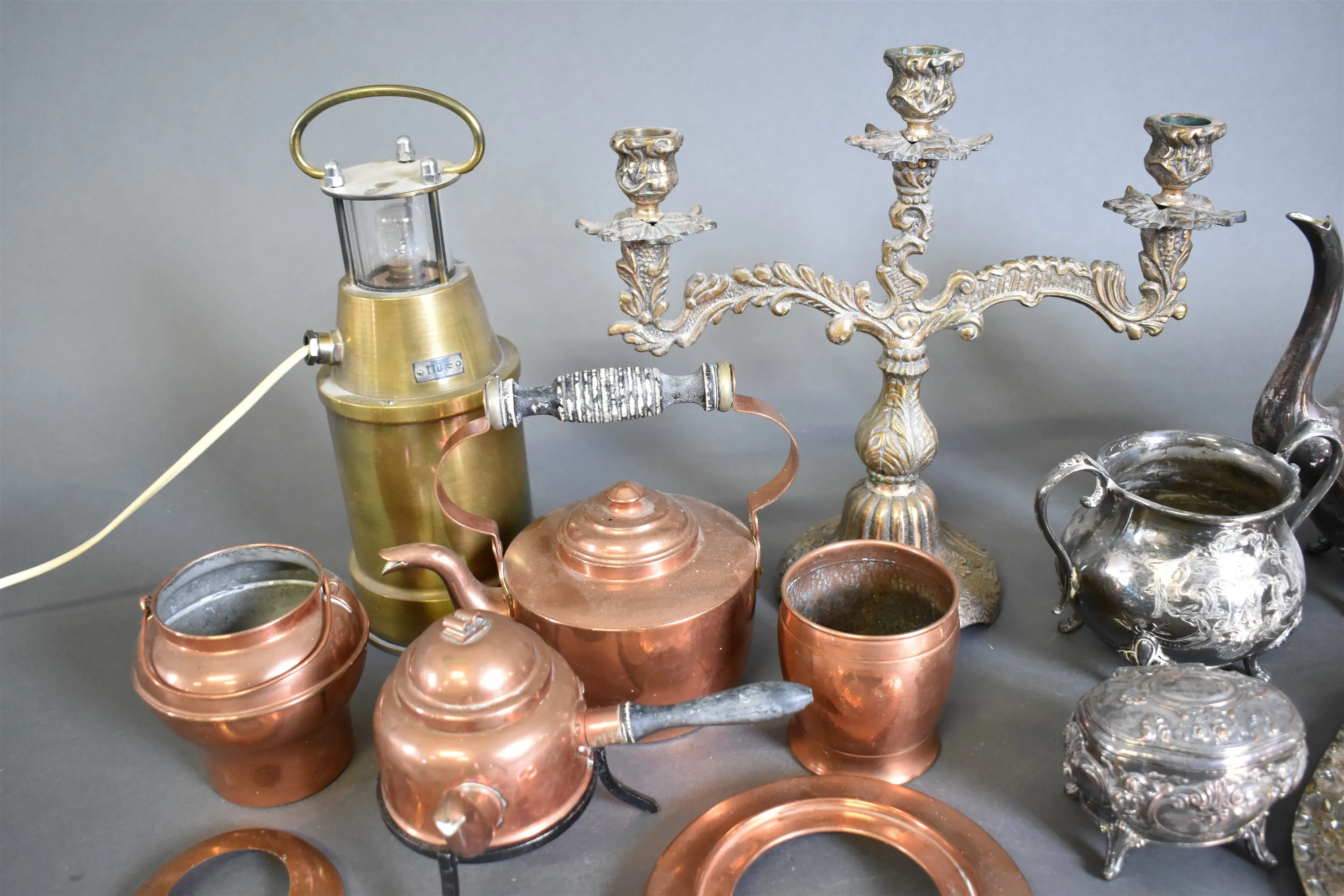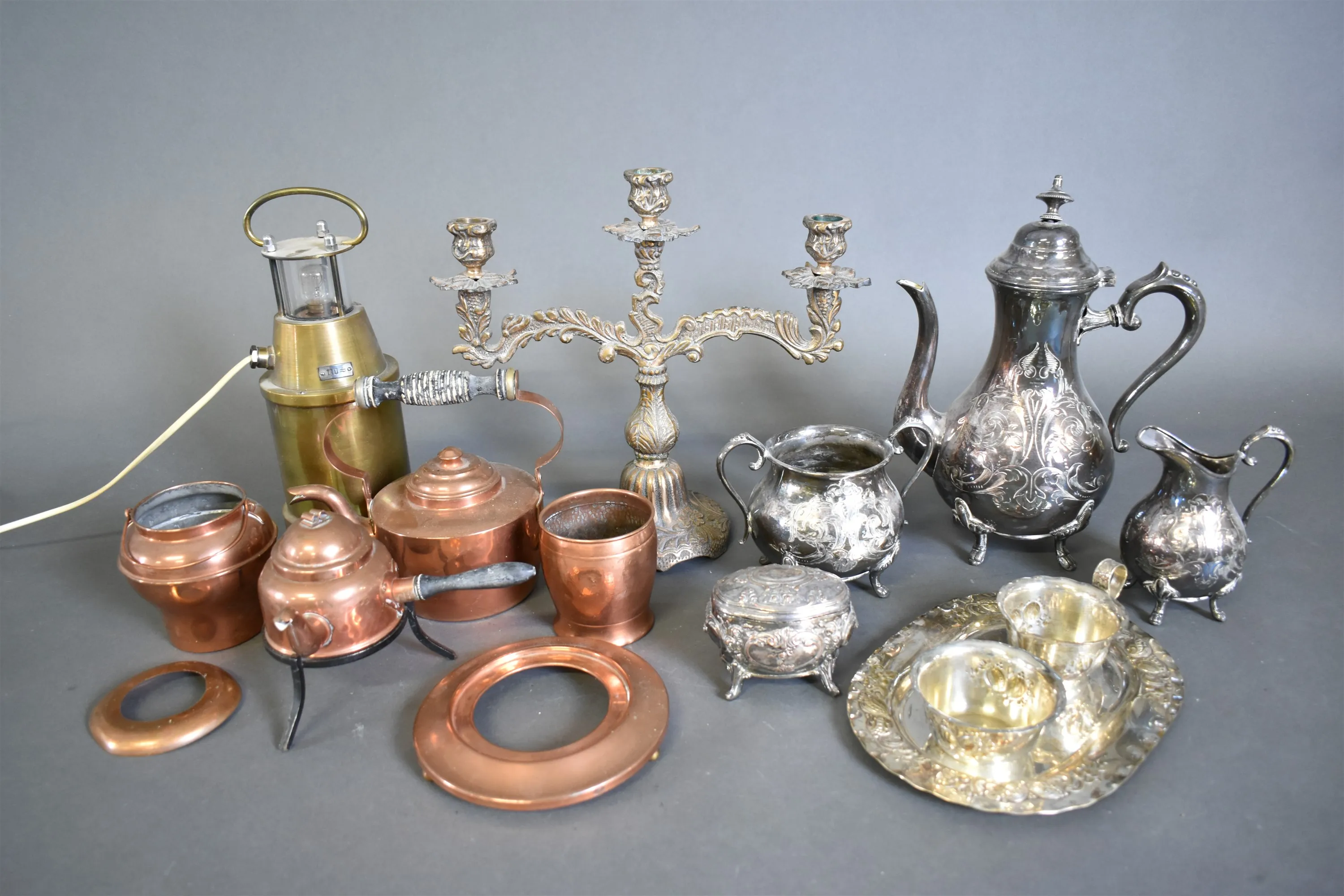 11652. Parti metall bla mässingljusstake, kopparföremål och kaffekanna, högsta höjd 31 cm
