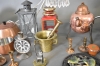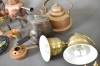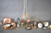 2987. Parti metall bla mässingmortel, fönsterlampor med prismor och kopparföremål, högsta höjd på bordet 26 cm