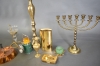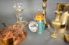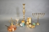 3152. Parti metall bla titusljusstake mässing och kopparklocka, högsta höjd 59 cm