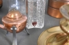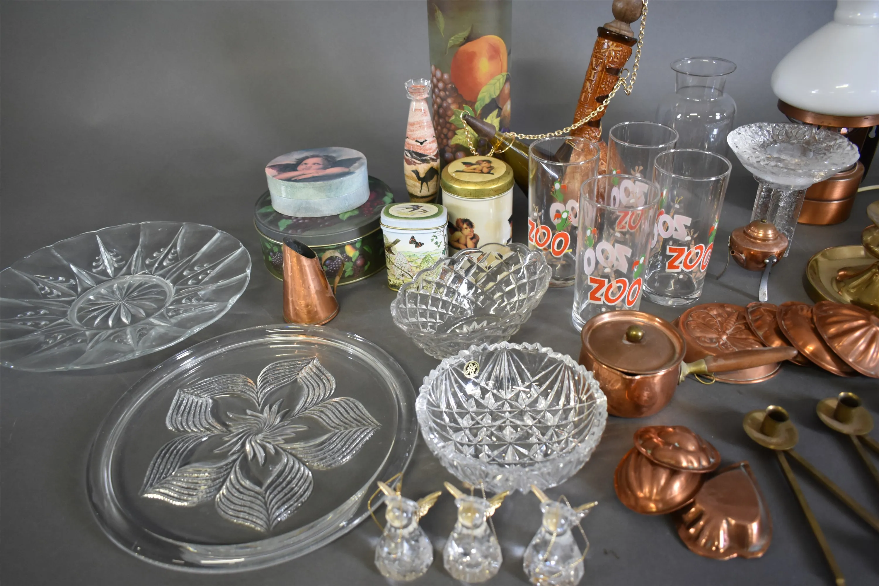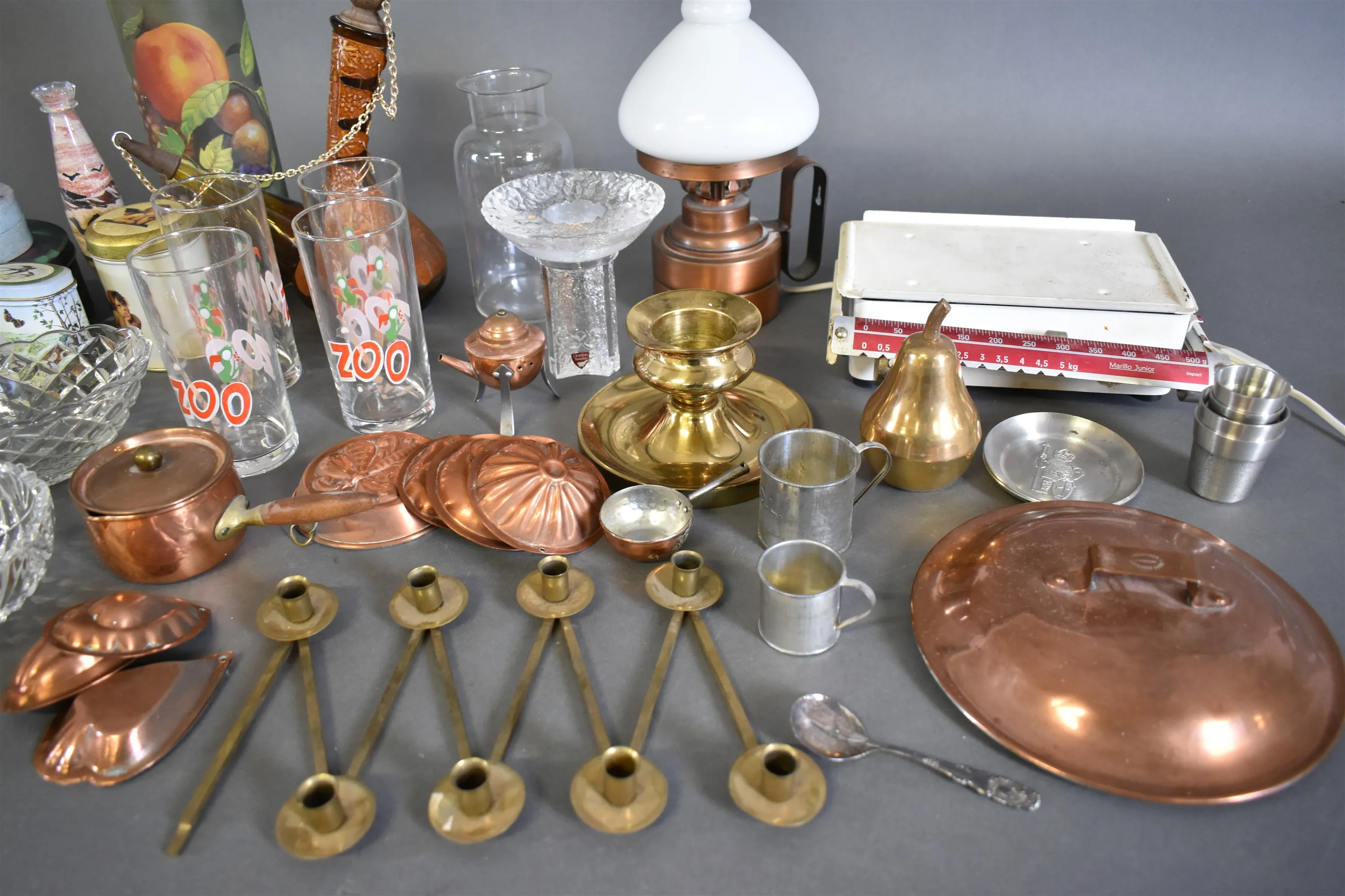 16100. Parti metall och glas bla kopparformar och ljushållare Orrefors, högsta höjd 29 cm