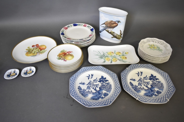 15575. Parti porslin bl.a fruktservis & vas med fågeldekor, högsta 23 cm