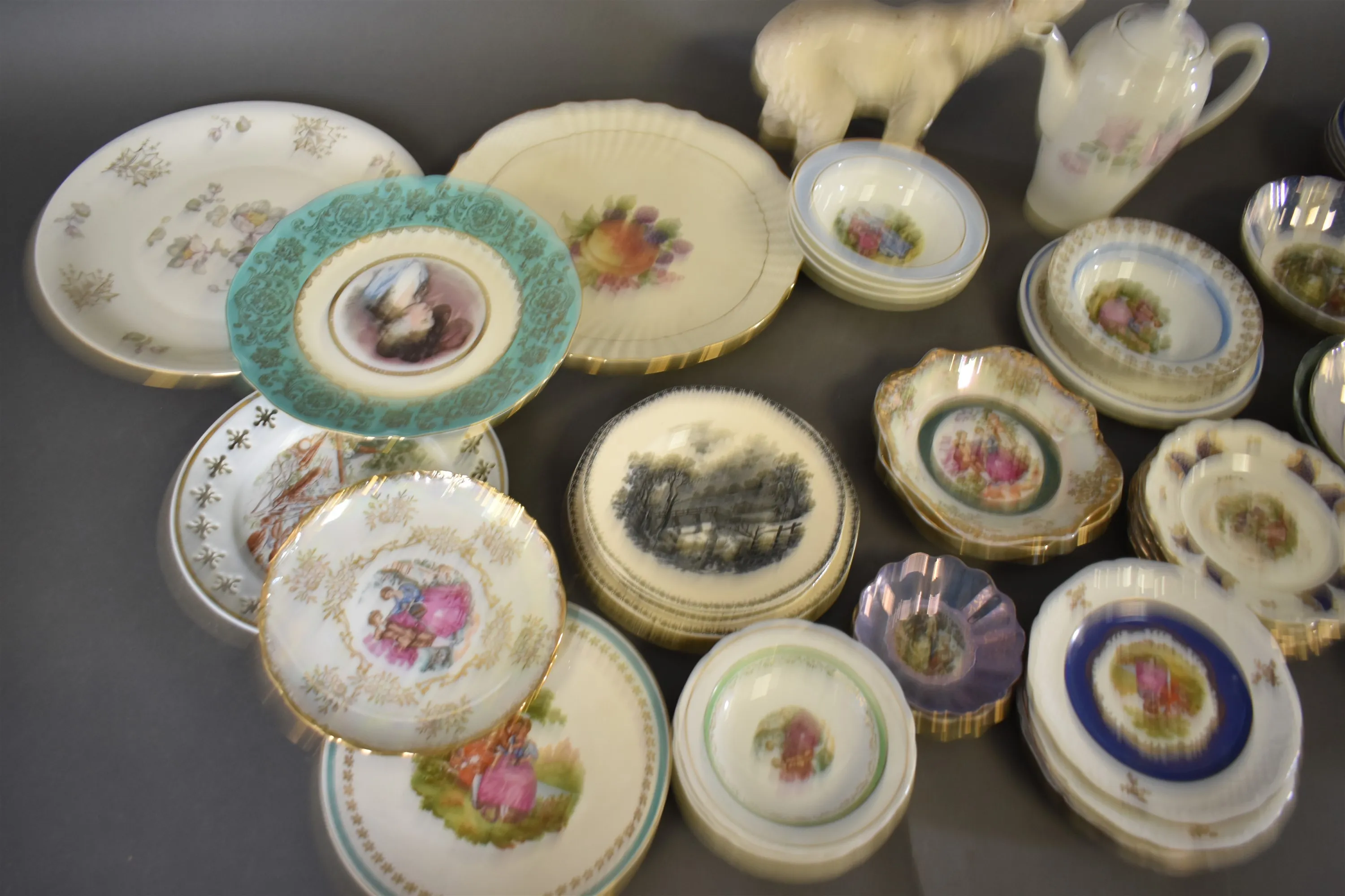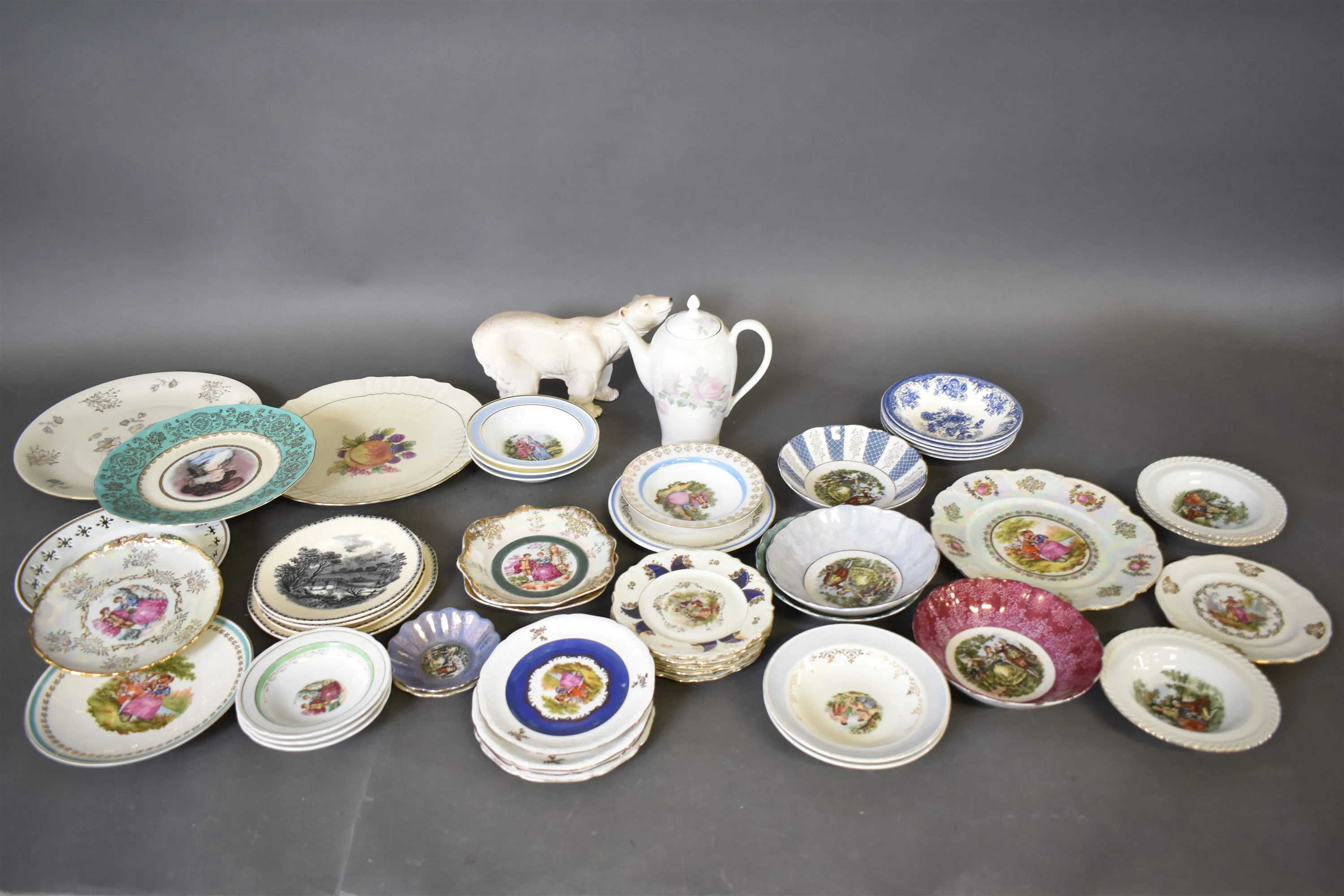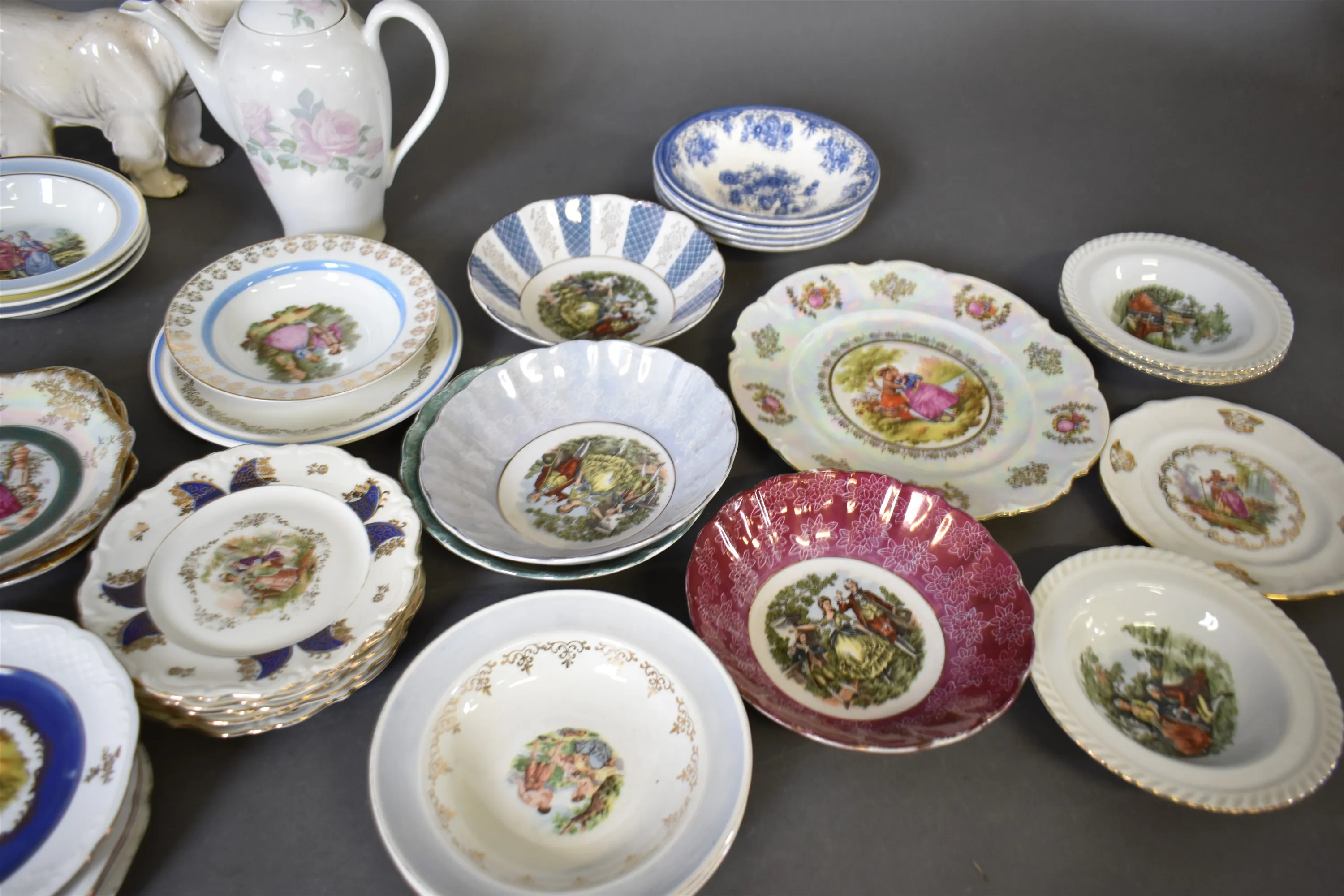 14799. Parti porslin bl.a tallrikar med figursener, högsta 22 cm