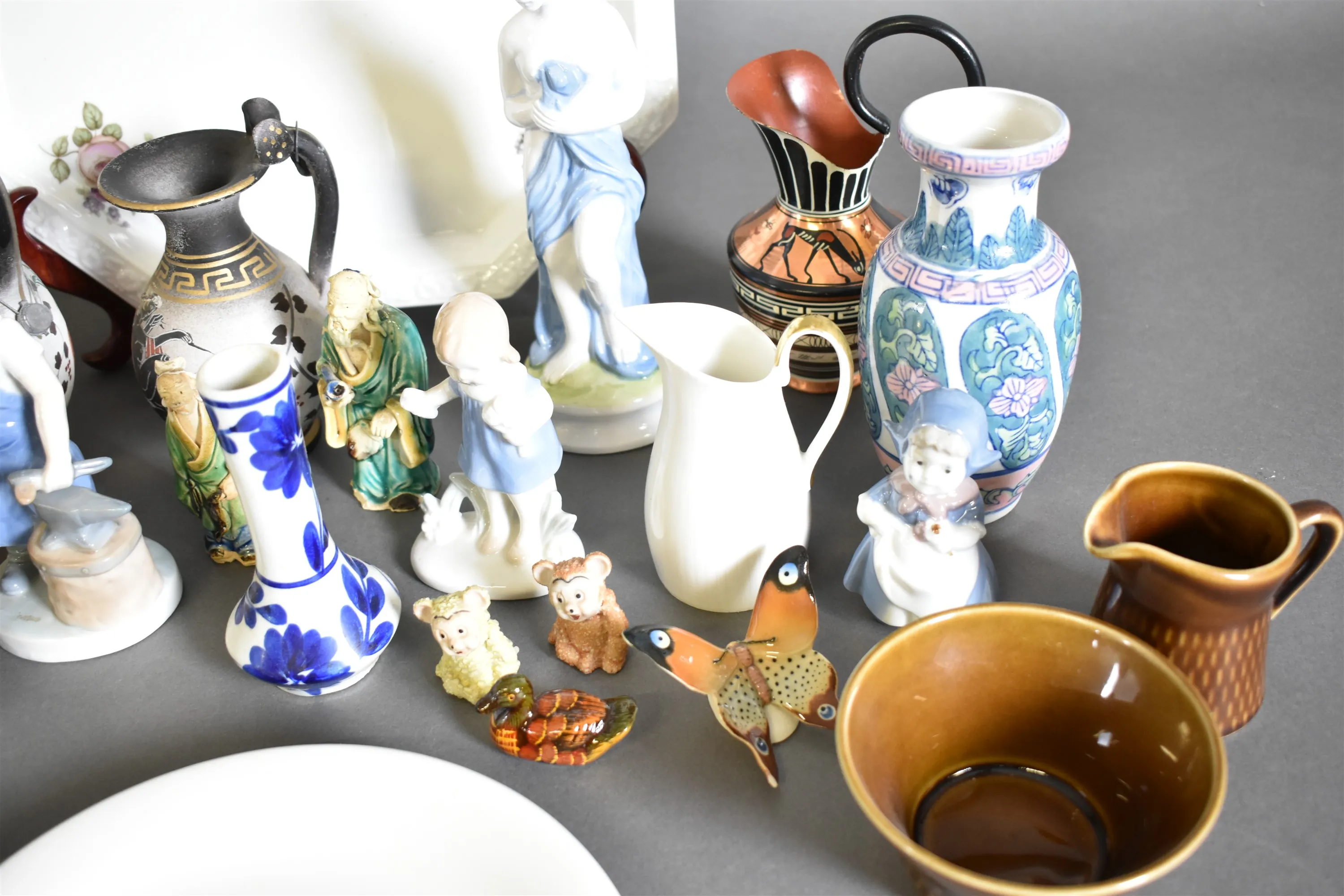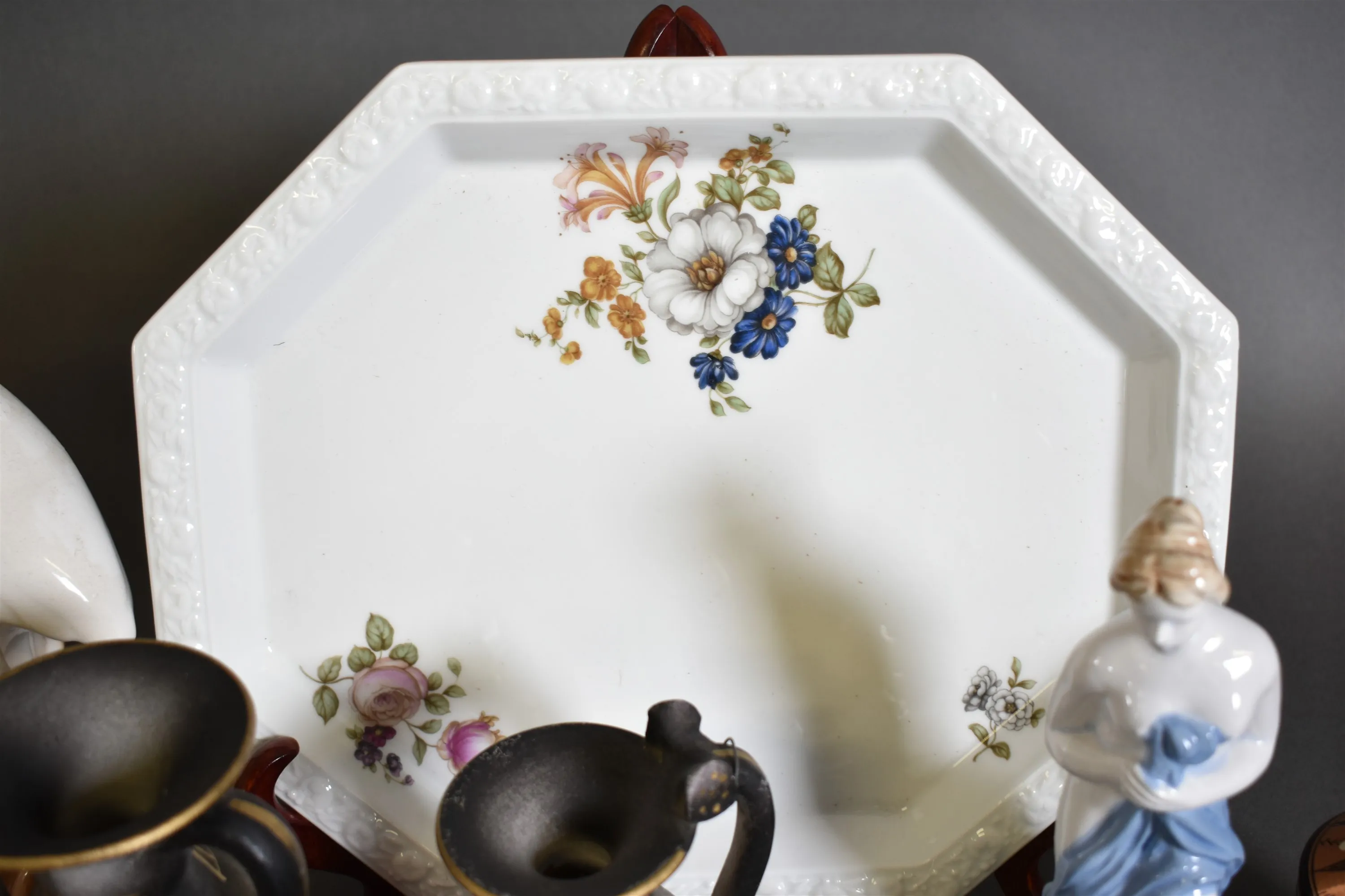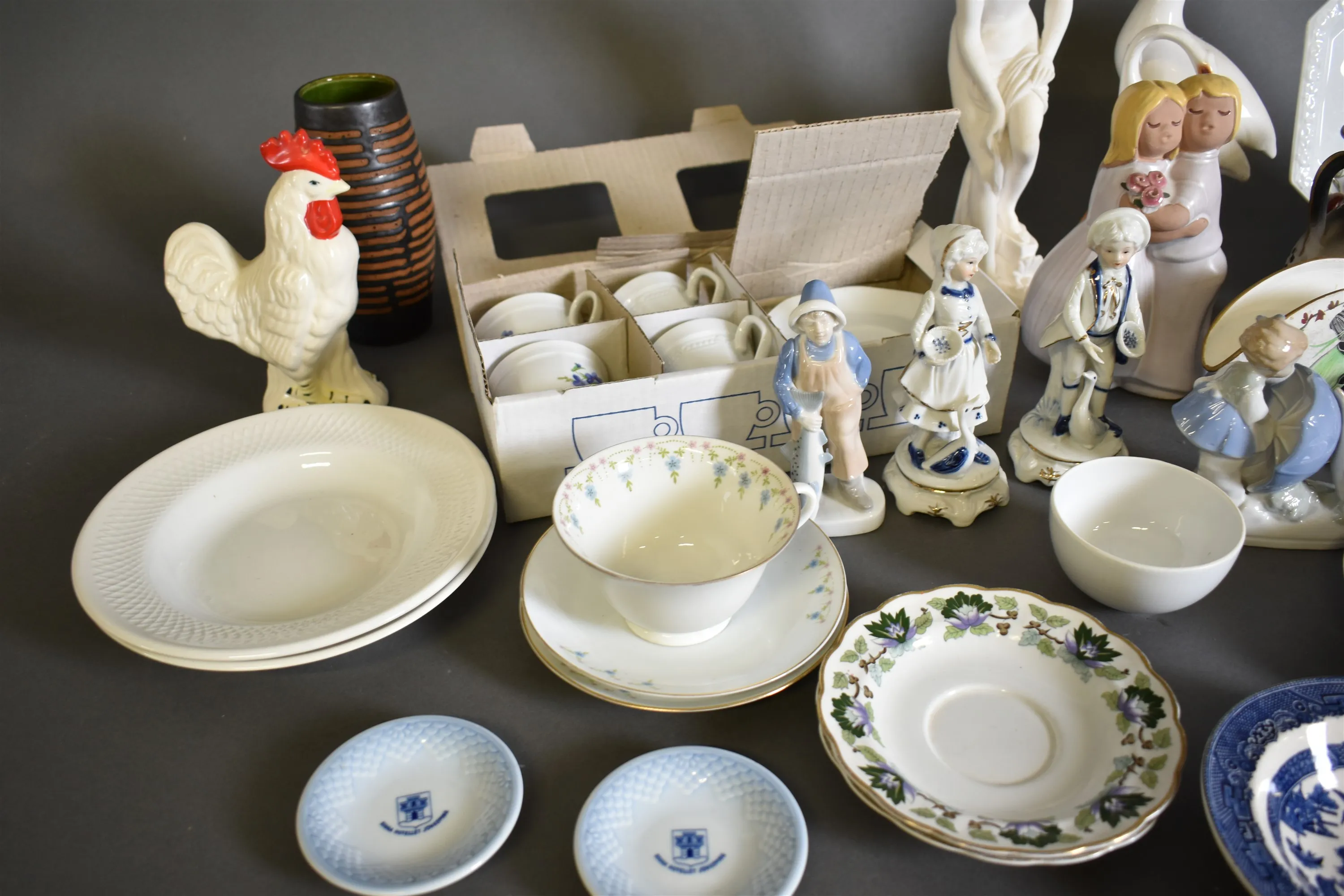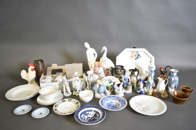 14372. Parti porslin och keramik bla figuriner, fat Rosenthal och engelska tallrikar, högsta höjd 34 cm, 2 lådor