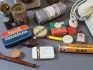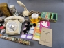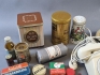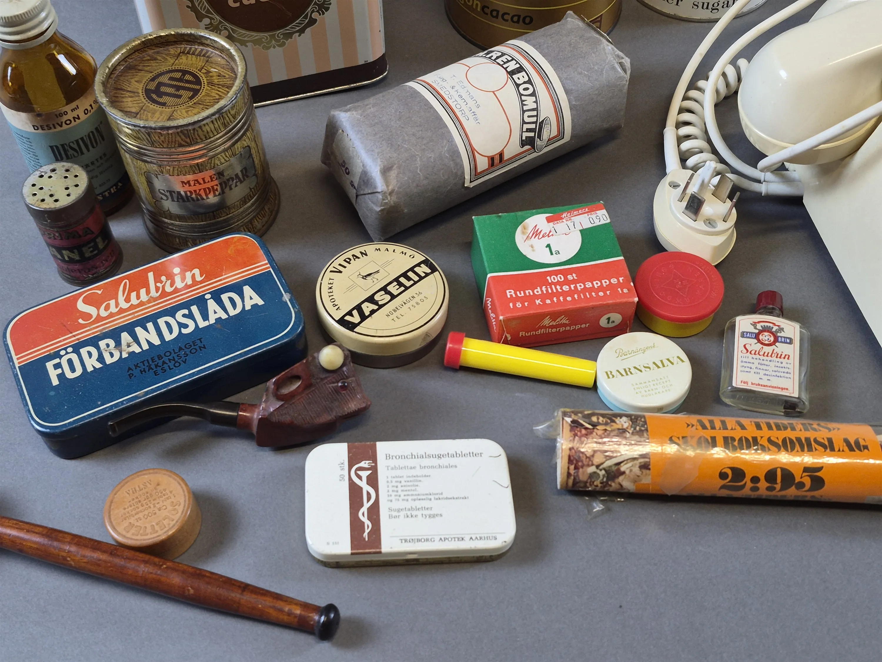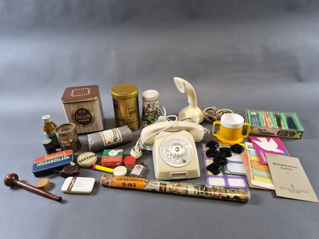 20118. Parti retroföremål bla plåtburkar Mazetti och kobratelefon, högsta höjd 21 cm