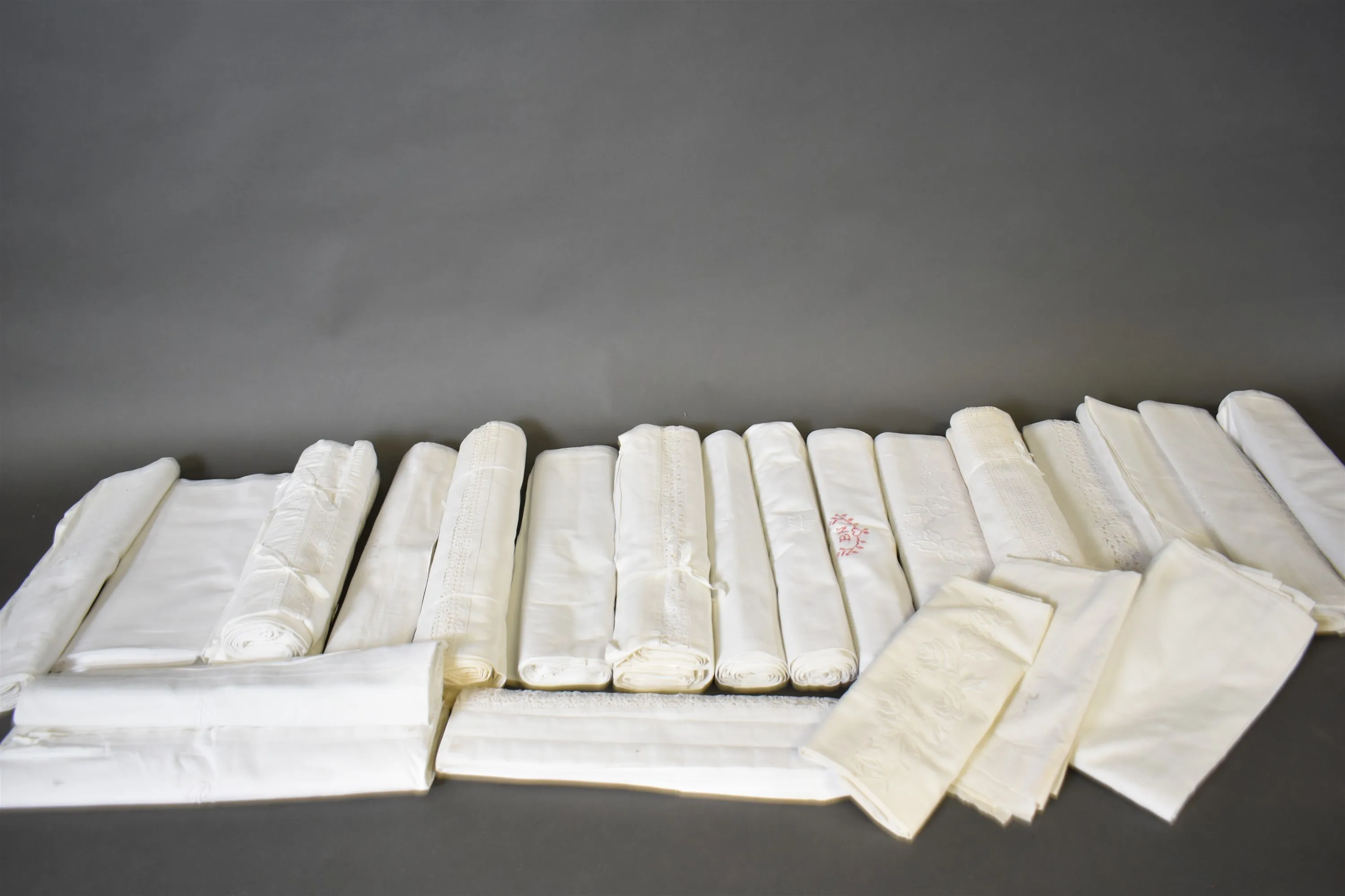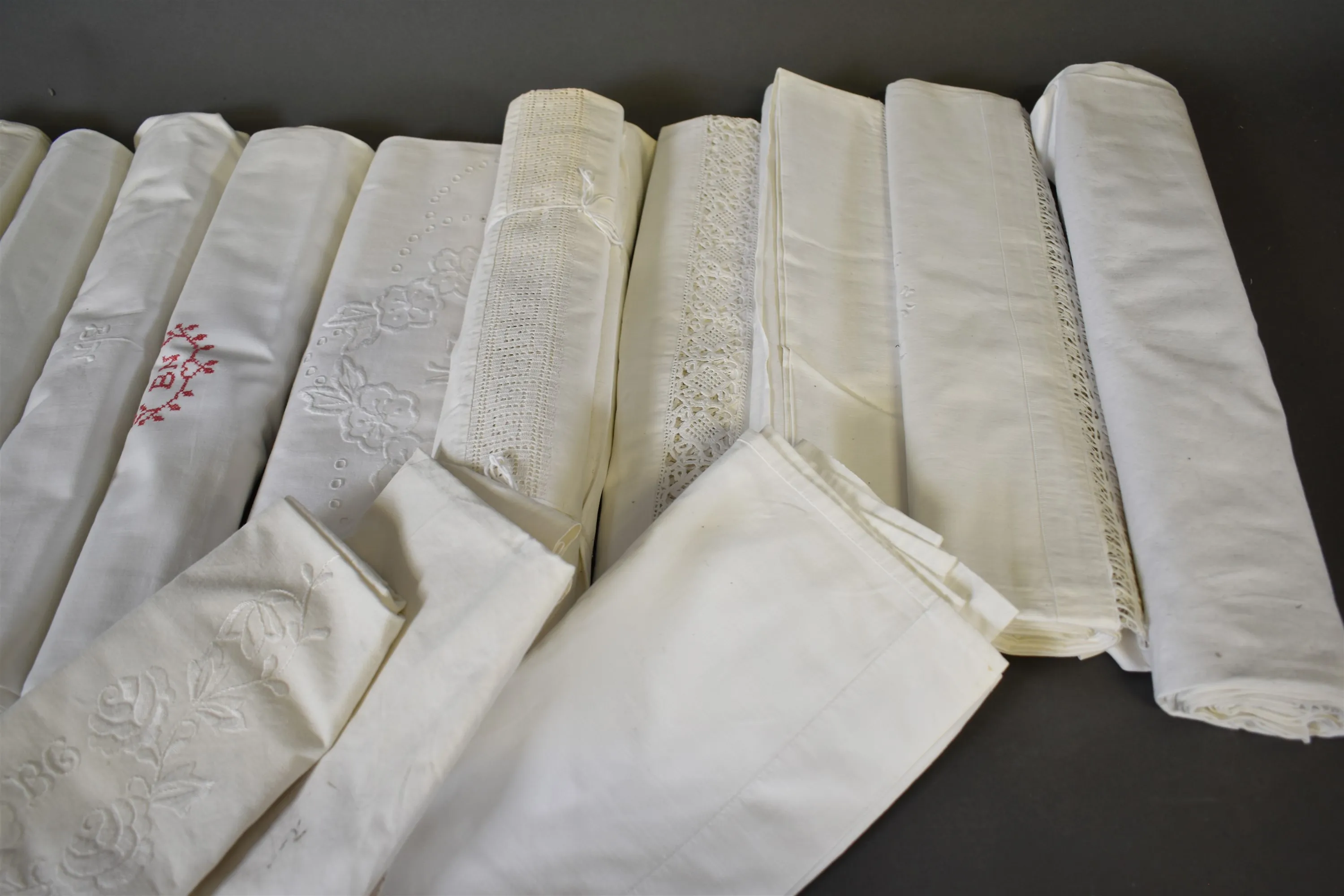 8647. Parti sänglinne bla monogrambroderat