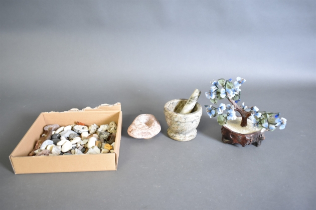 14496. Parti samling med stenar/fossiler, glasträd och stenmortel, högsta höjd 21 cm