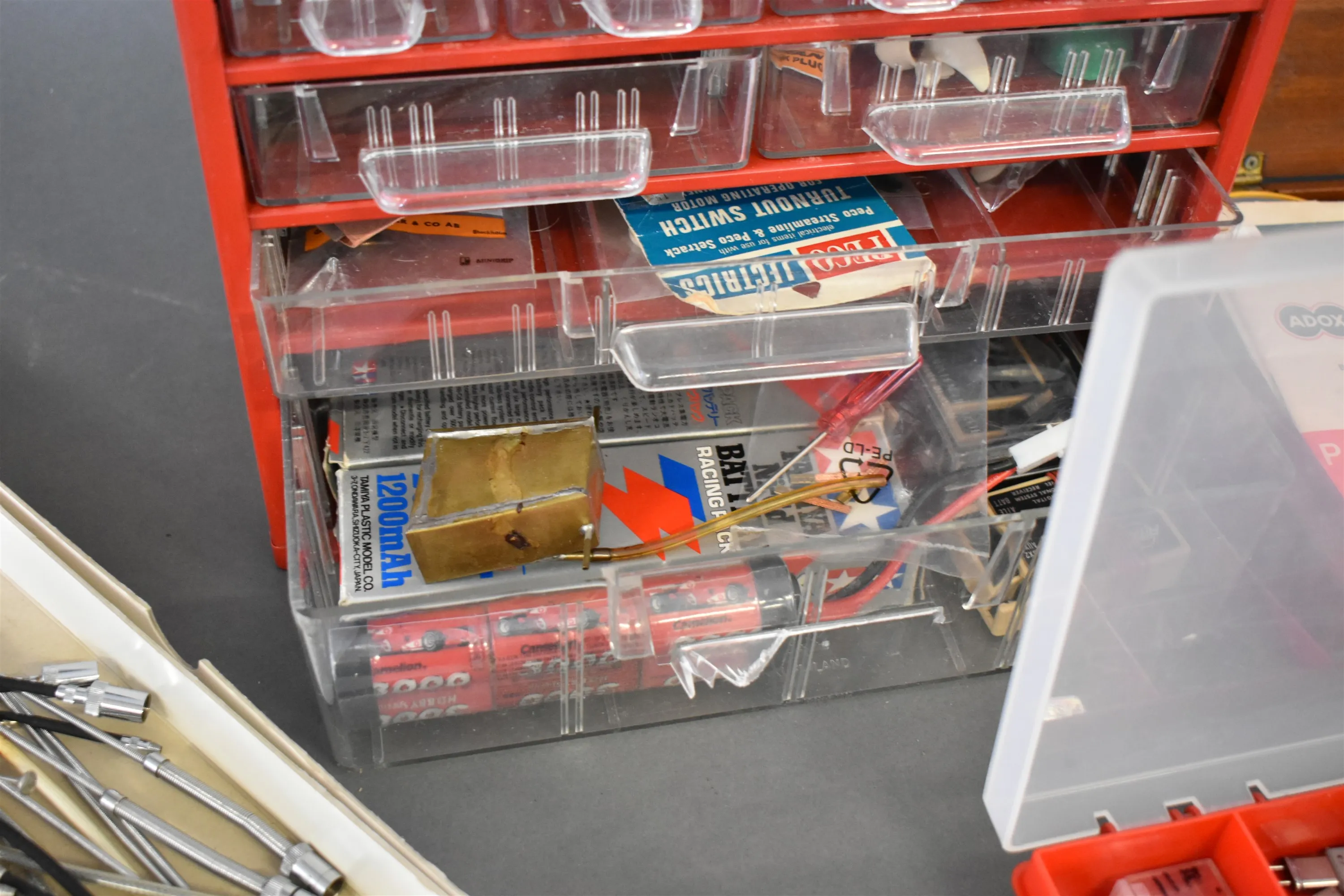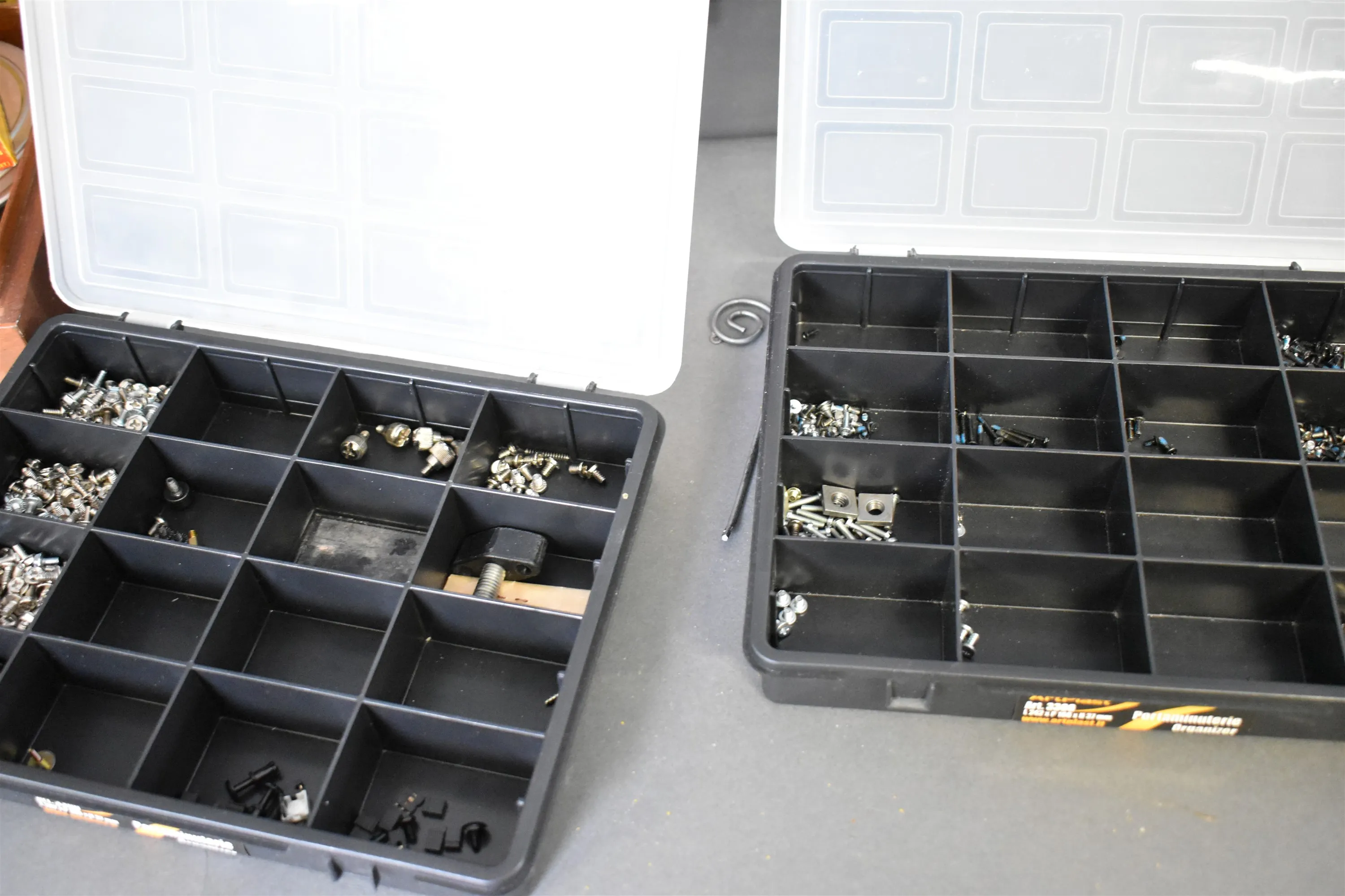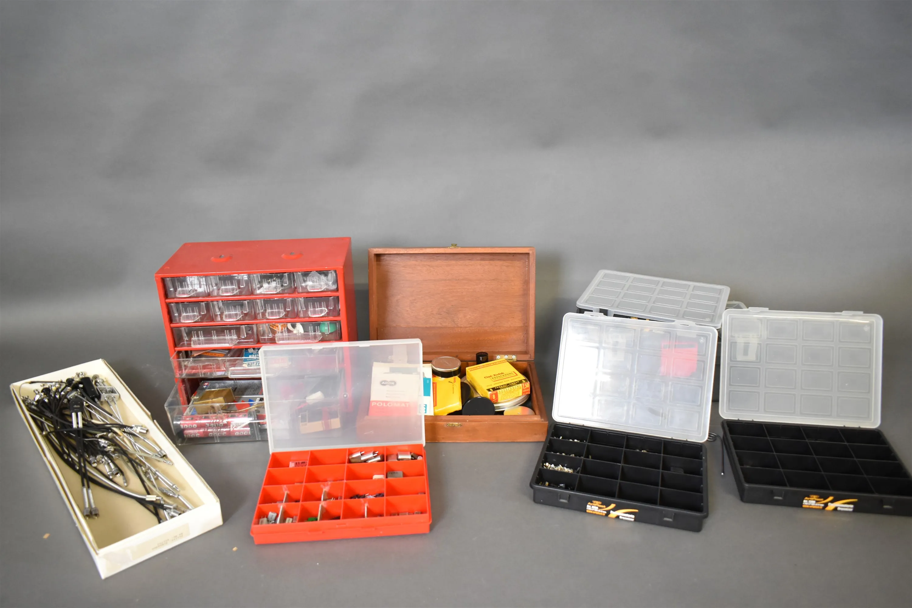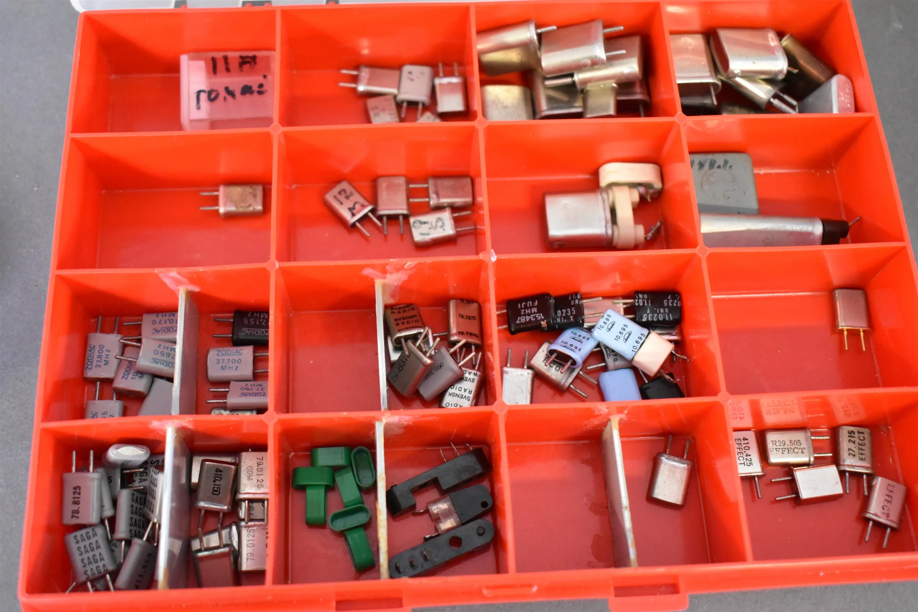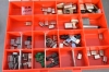 14885. Parti sortimentslådor med diverse innehåll för finmekanisk reperation och reservdelar, högsta höjd 27 cm