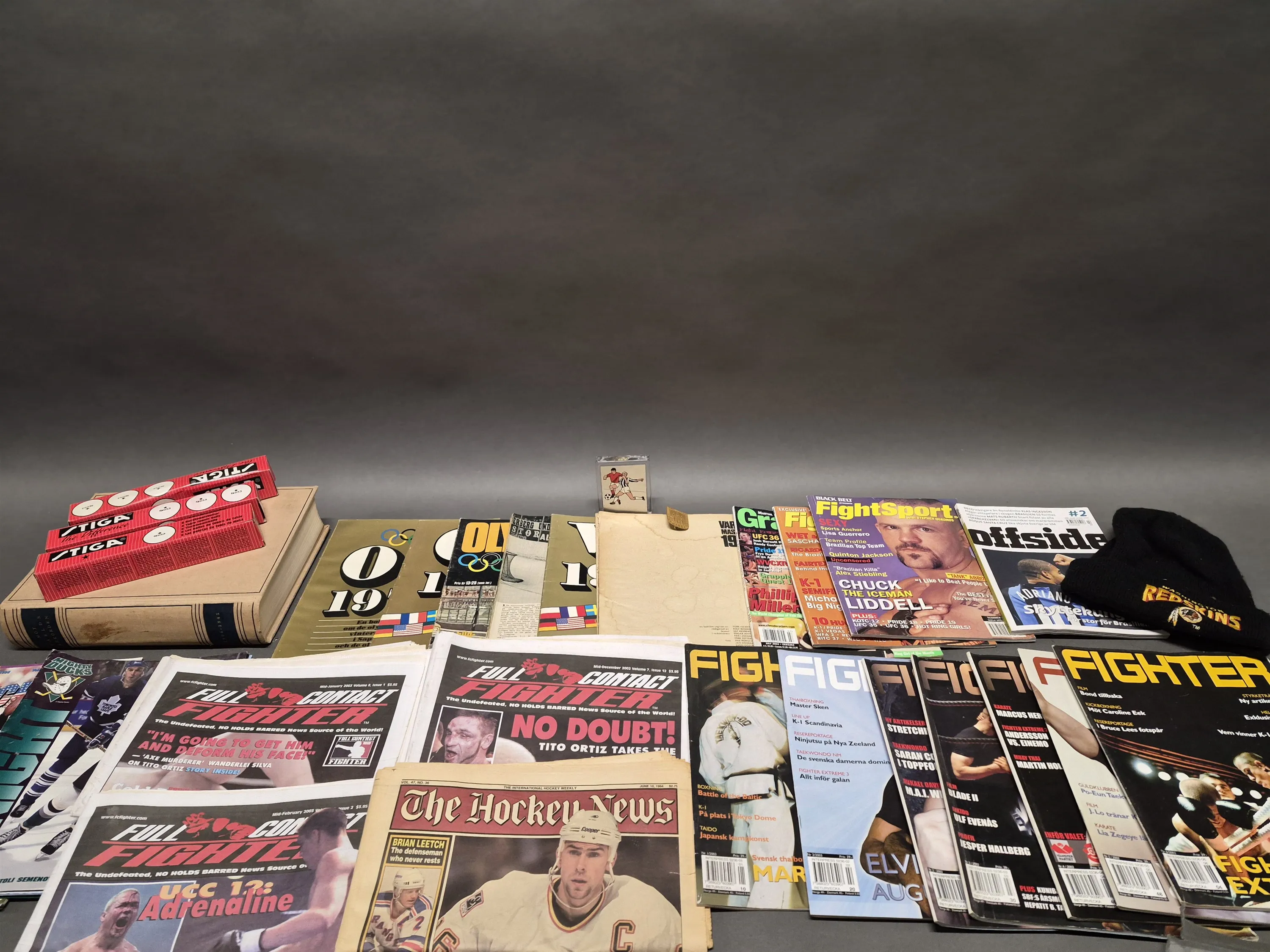 18824. Parti sportläsning och tillbehör bla tidsskrifter och mössa "Redskins"