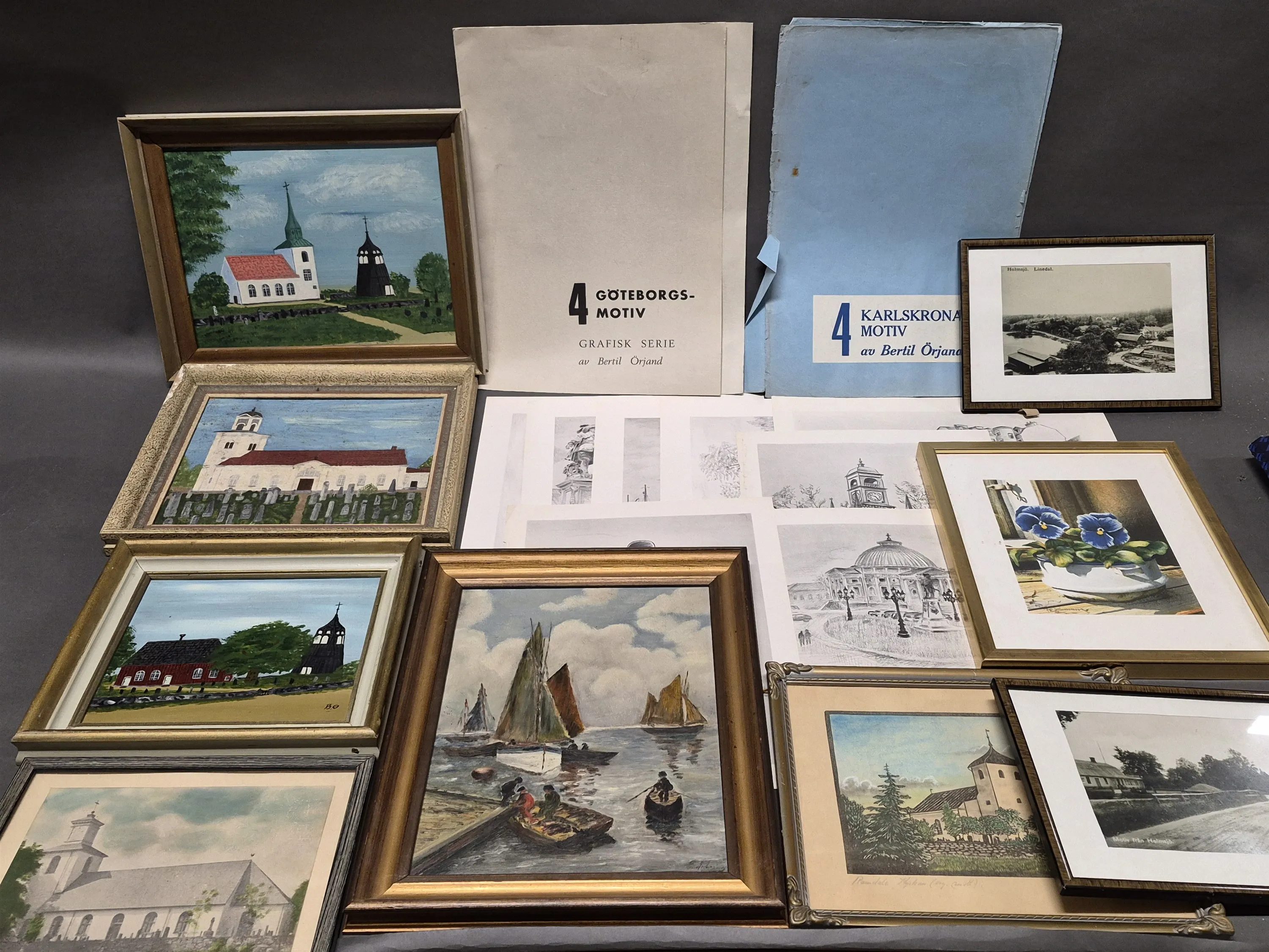 17328. Parti tavlor & konstblad bl.a Karlskrona största mått 45 x 32 cm