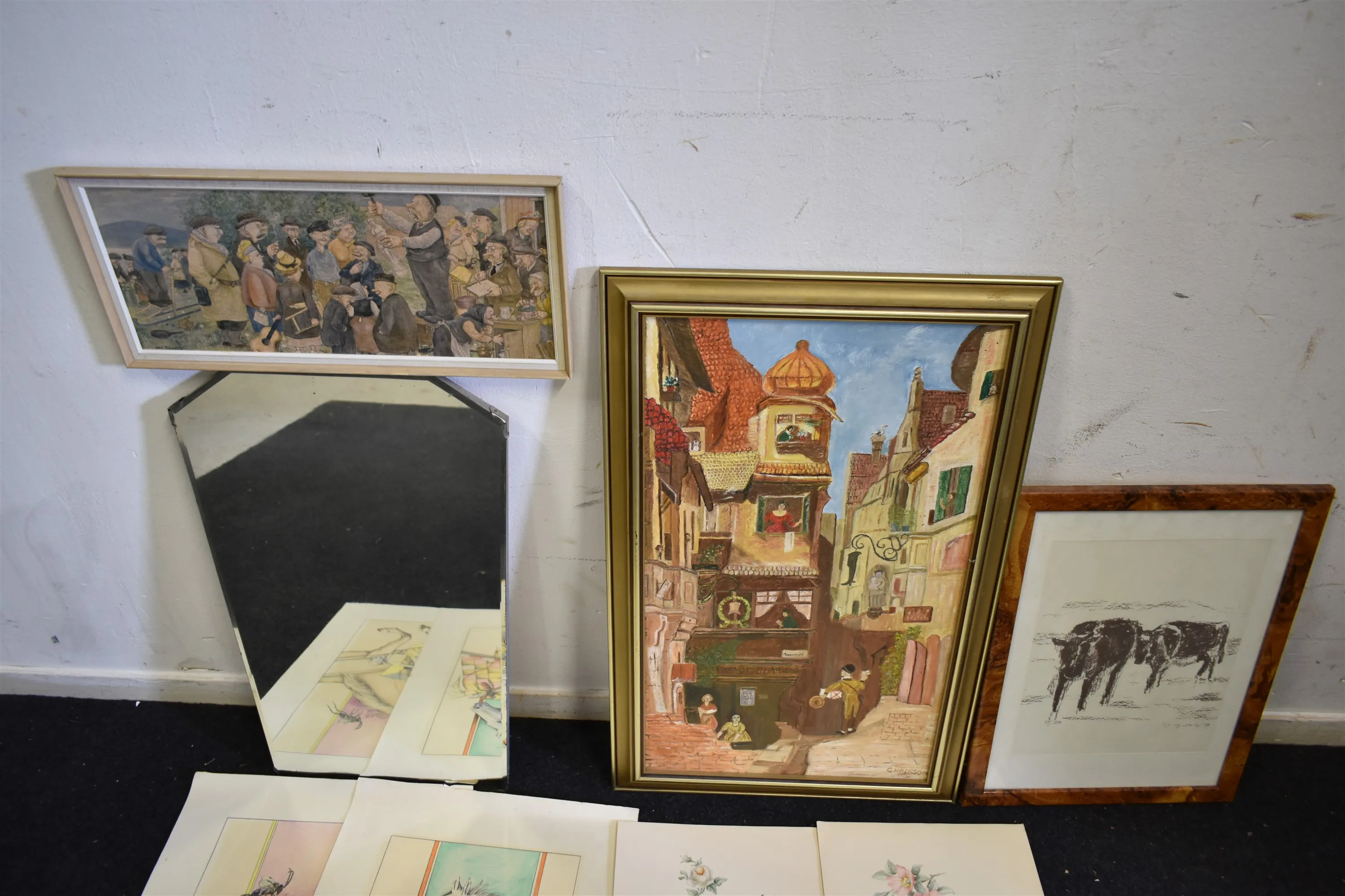 16095. Parti tavlor, spegel, tryck största mått 36 x 42 cm