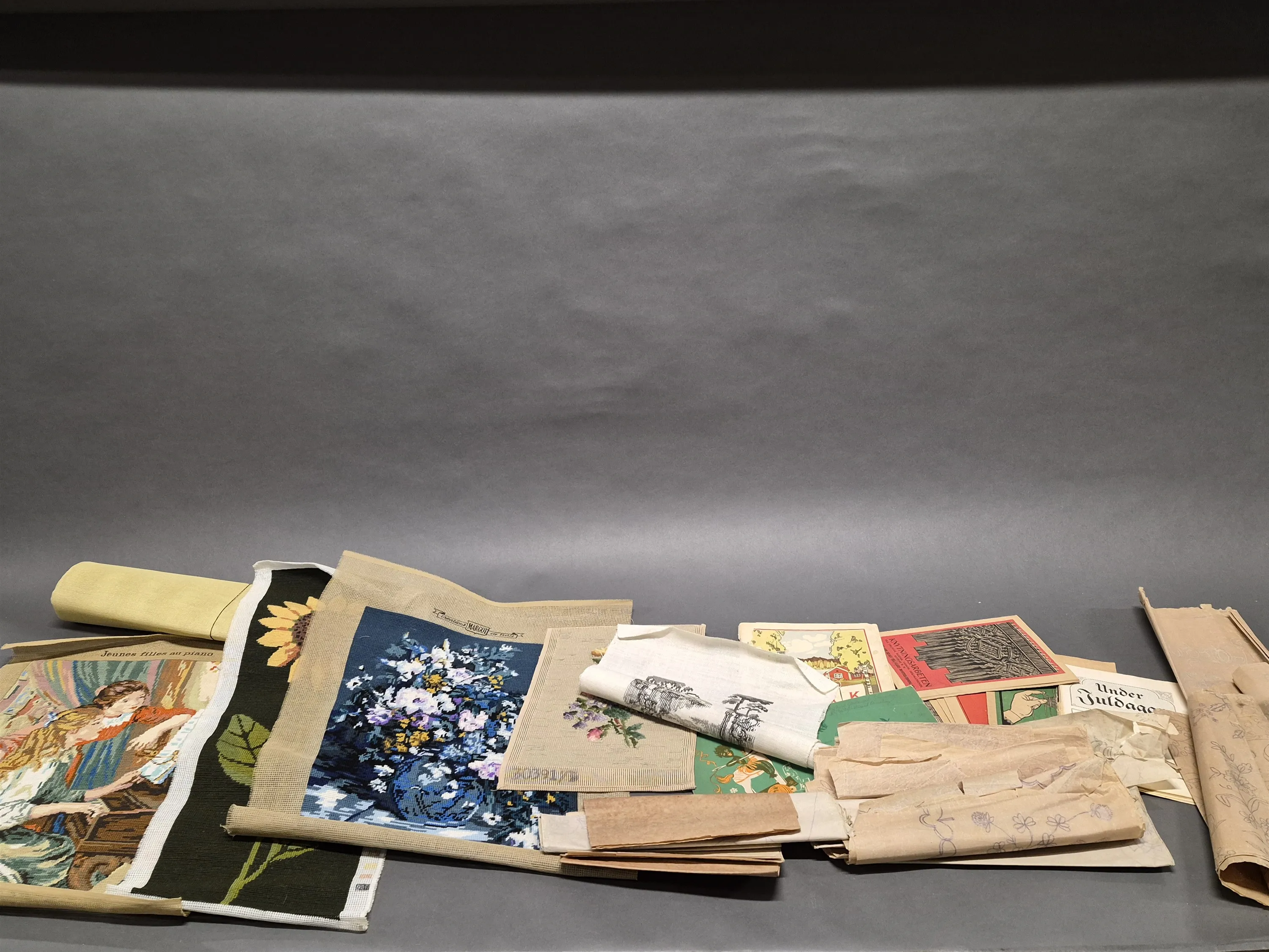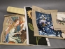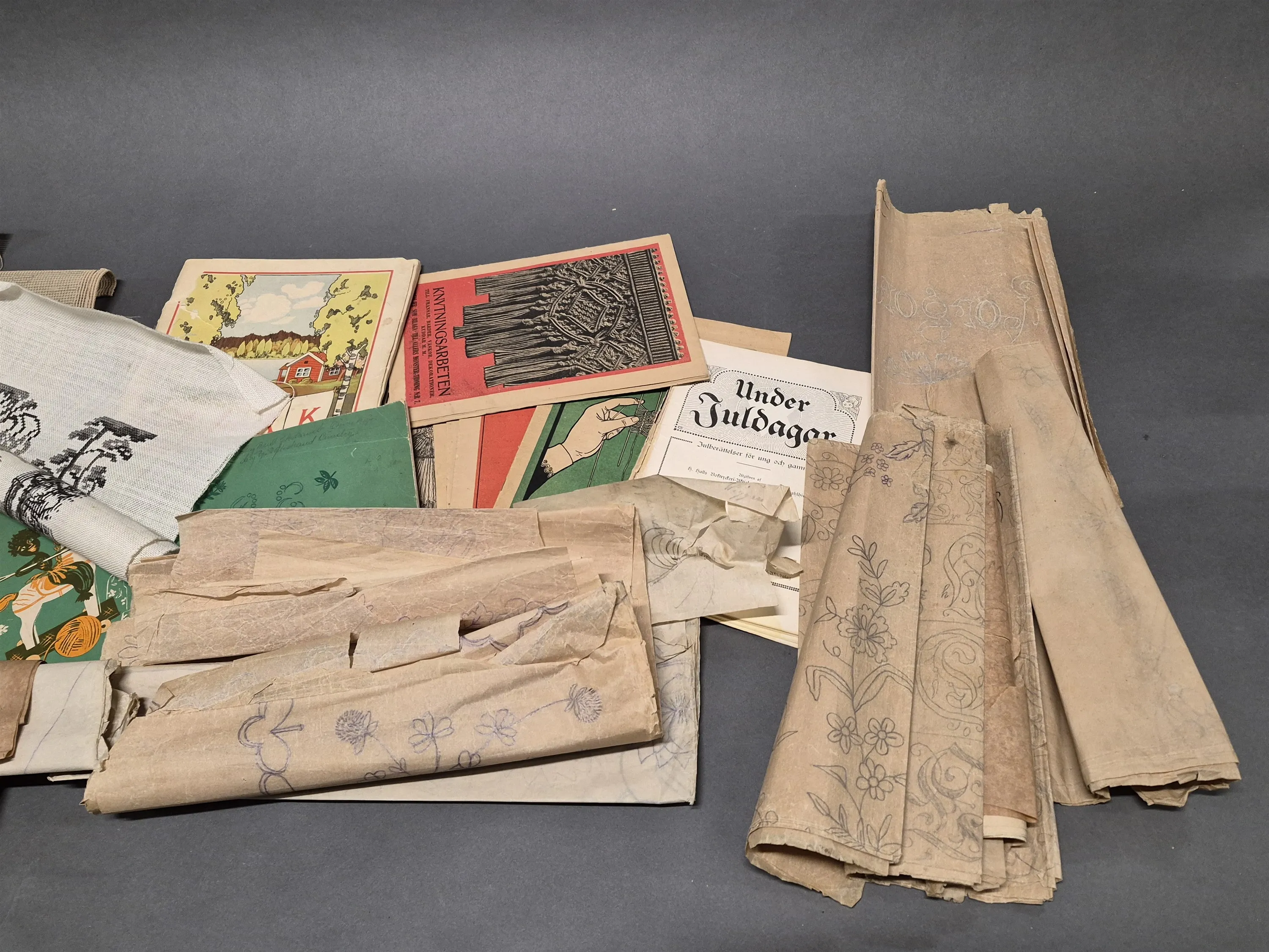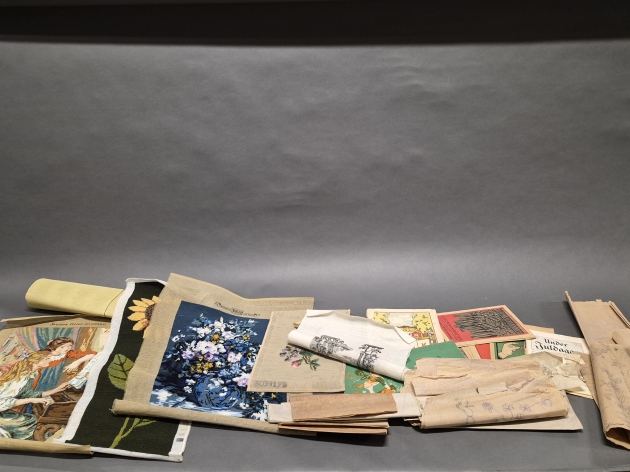 18160. Parti textil tillbehör, böcker, skisser & broderade bonader