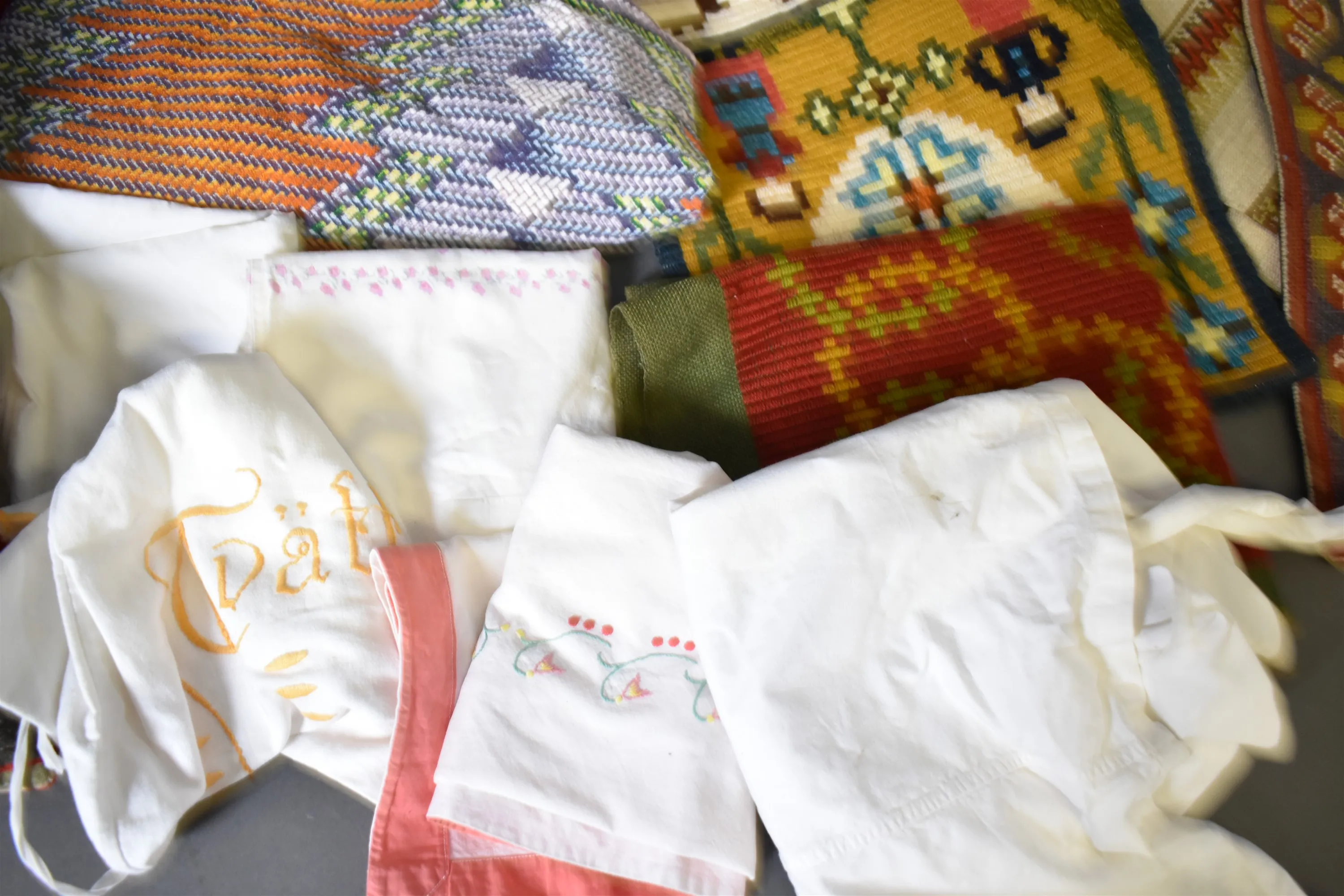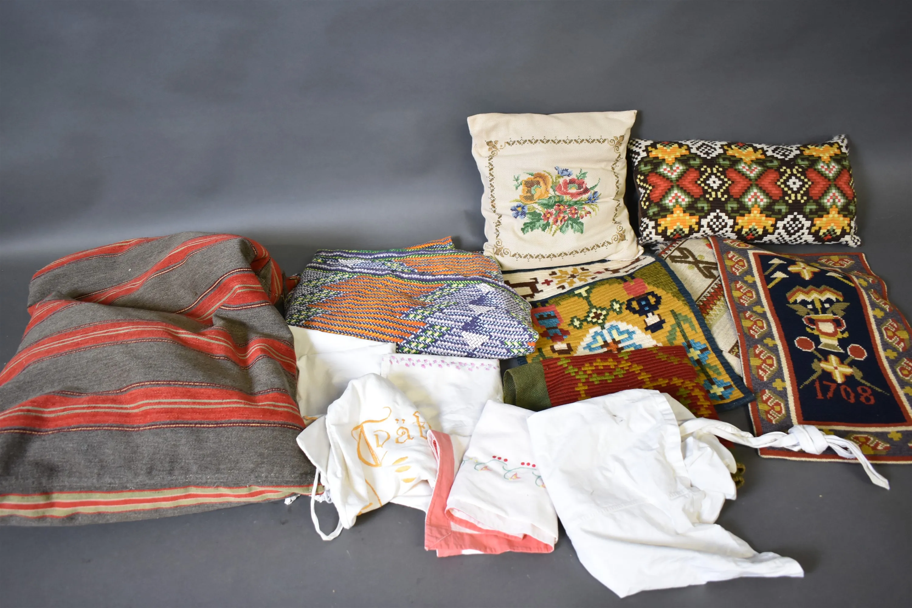 16053. Parti textilier bl.a bonader & kuddar största 45 x 80 cm