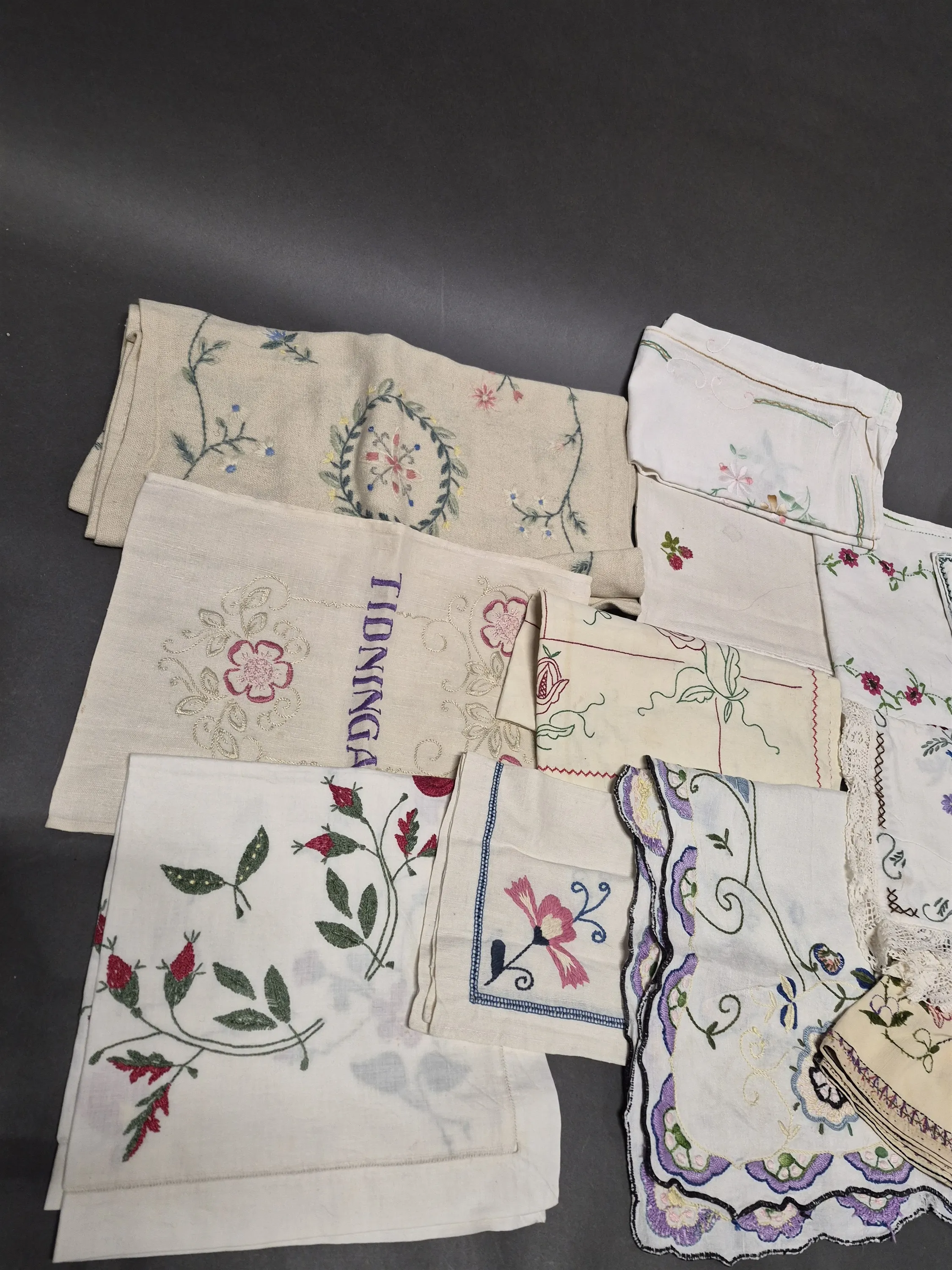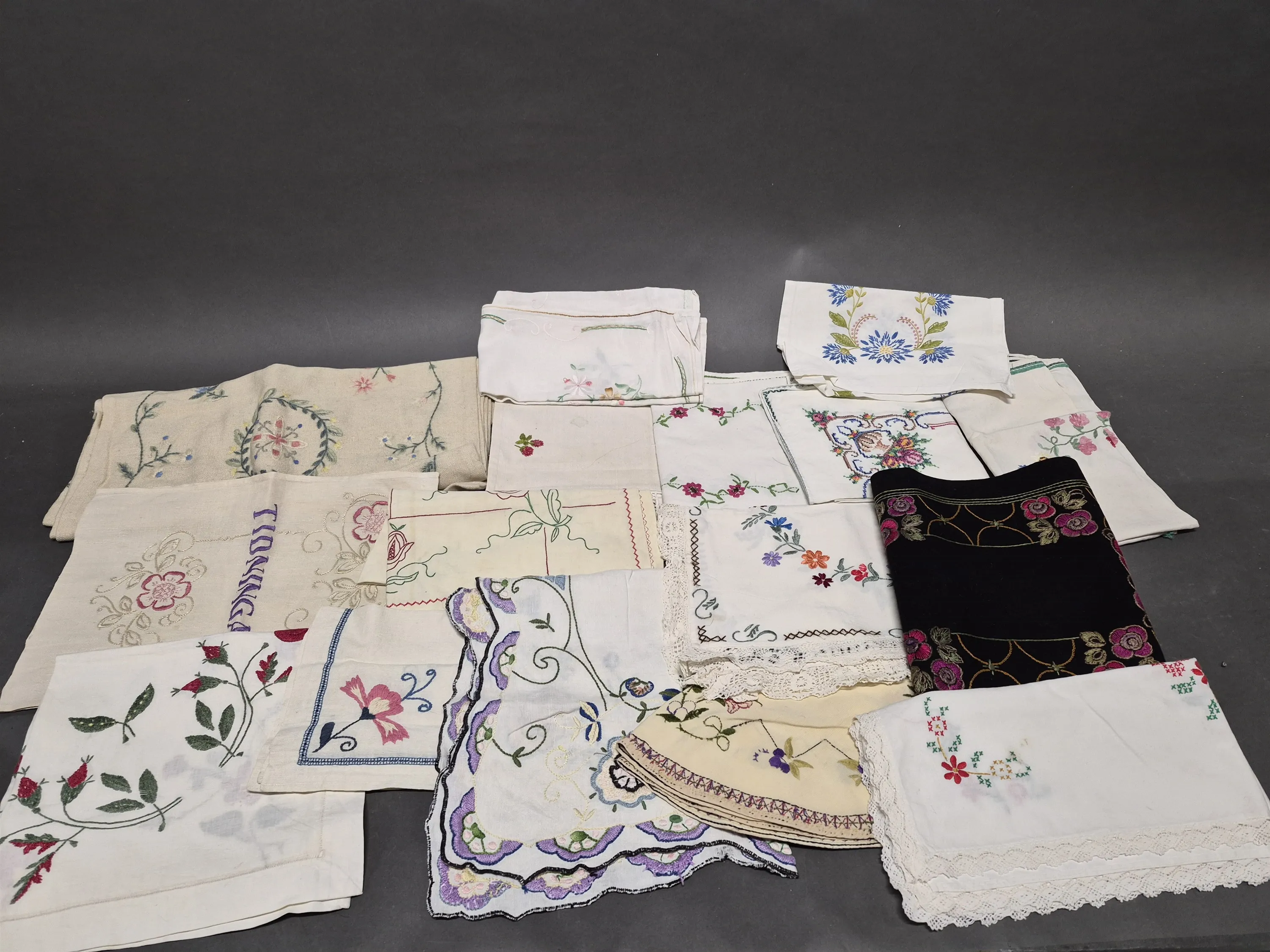 19507. Parti textilier bl.a broderade dukar